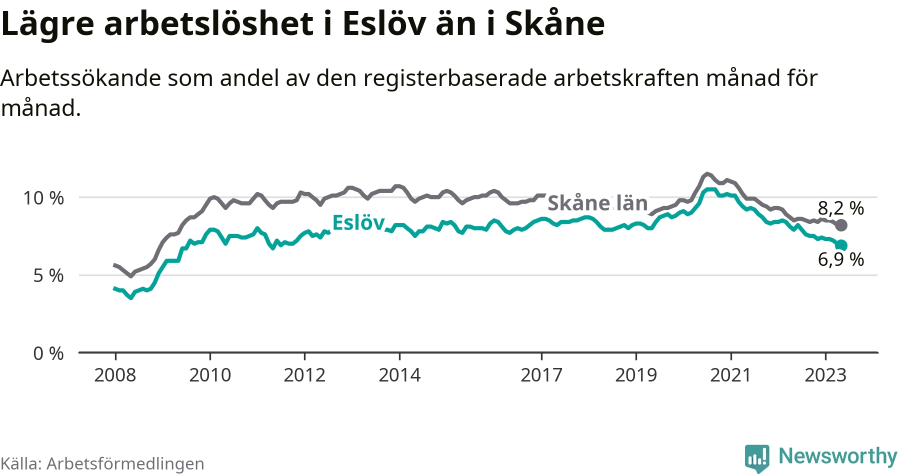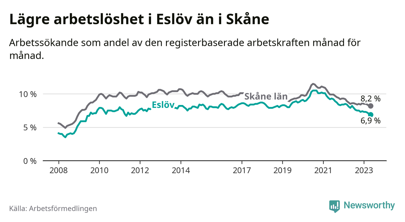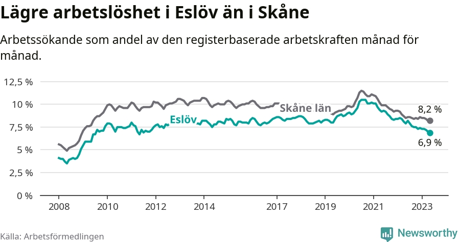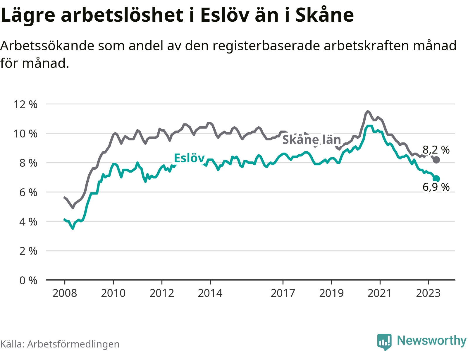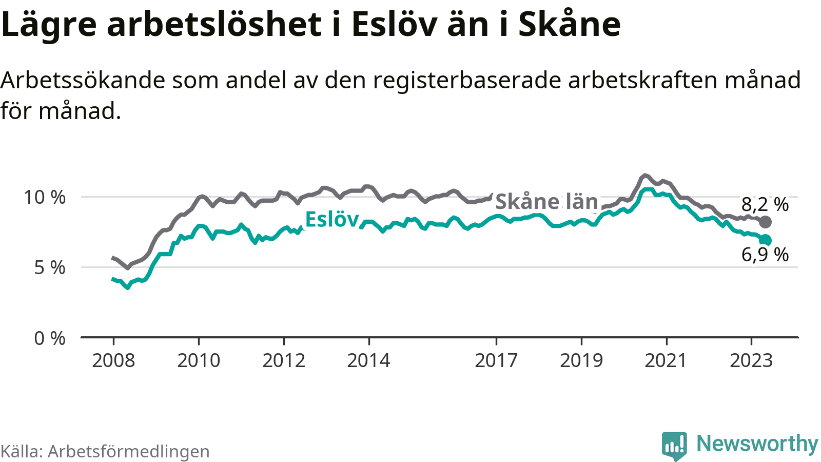 Det är 25:e månaden i följd som arbetslösheten i Eslöv är lägre än den var under samma tidpunkt året innan. Sedan april 2021 har arbetslösheten gått ner från 9,4 till 6,9 procent. Den nuvarande arbetslöshetsnivån är därmed den lägsta sedan juli 2011.