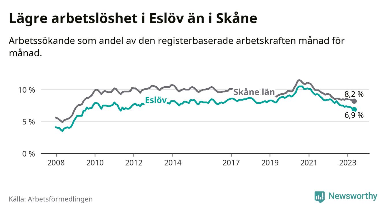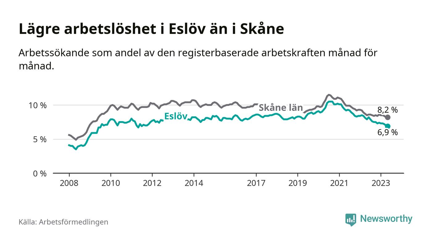 Under maj månad rapporterade Eslövs kommun en total arbetslöshet på 6,9 procent. Det är en minskning jämfört med samma tidpunkt i fjol (−1,0 procentenheter). Även i Skåne län sjunker arbetslösheten .