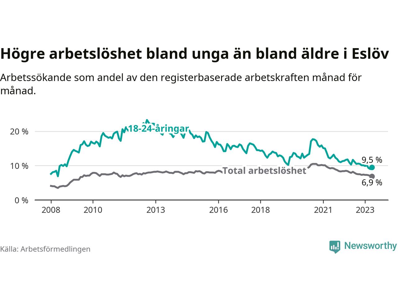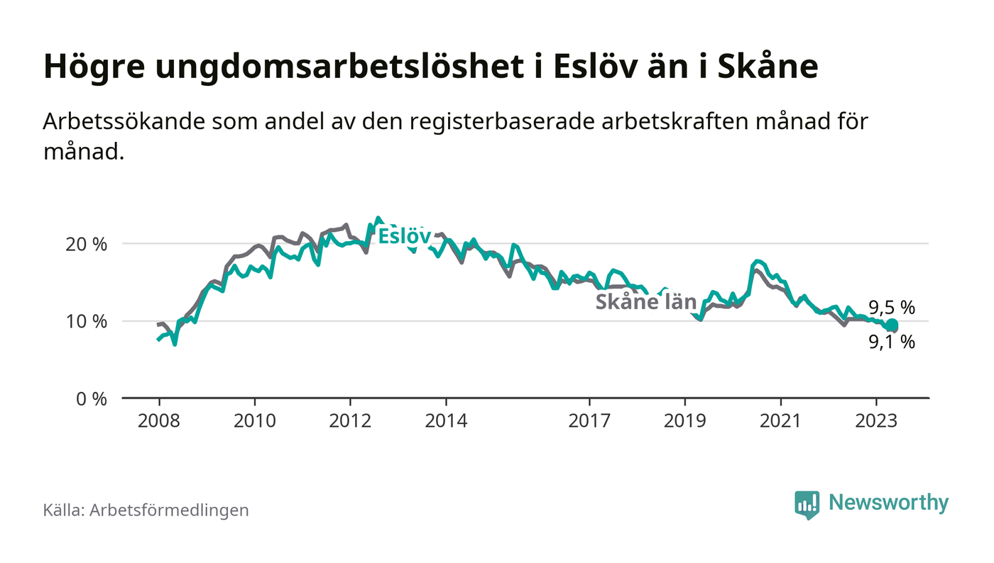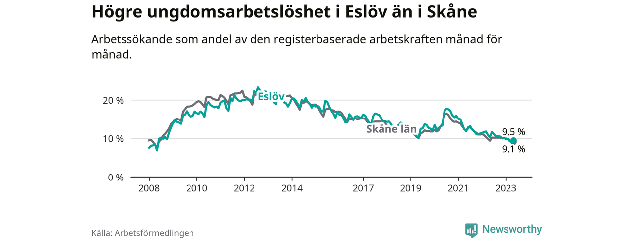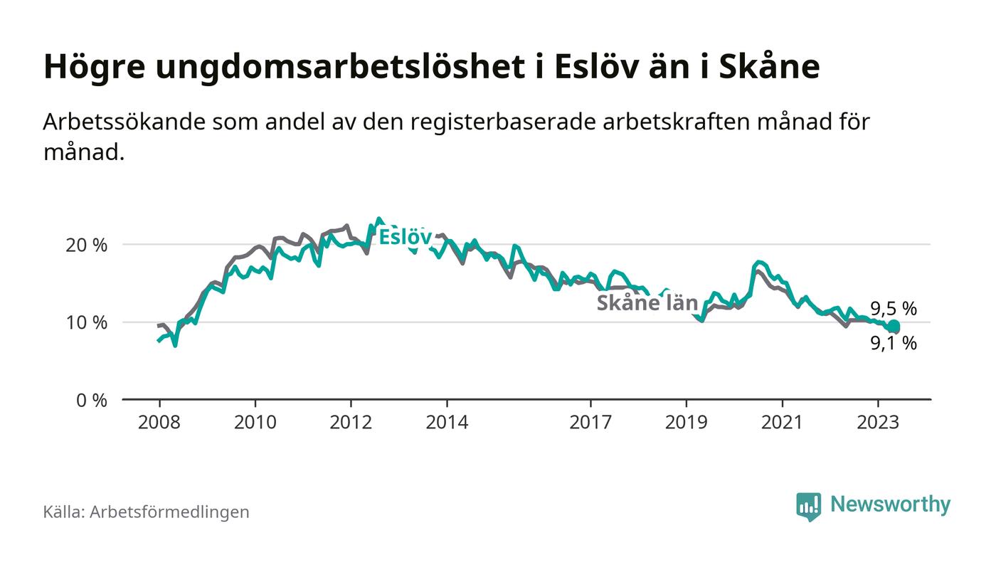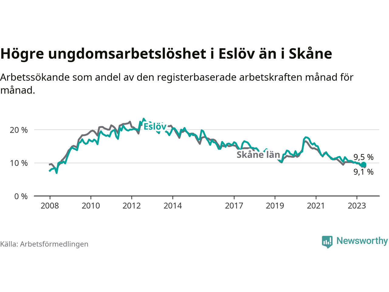 Medan Eslöv har lägre total arbetslöshet än Skåne, ligger ungdomsarbetslösheten 0,4 procentenheter högre i Eslöv.