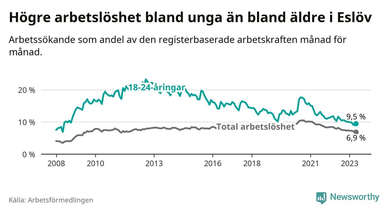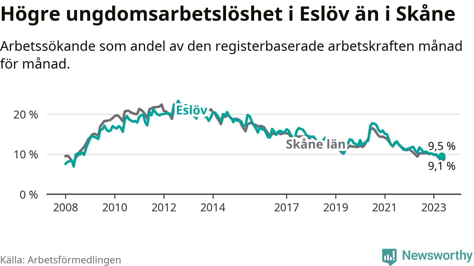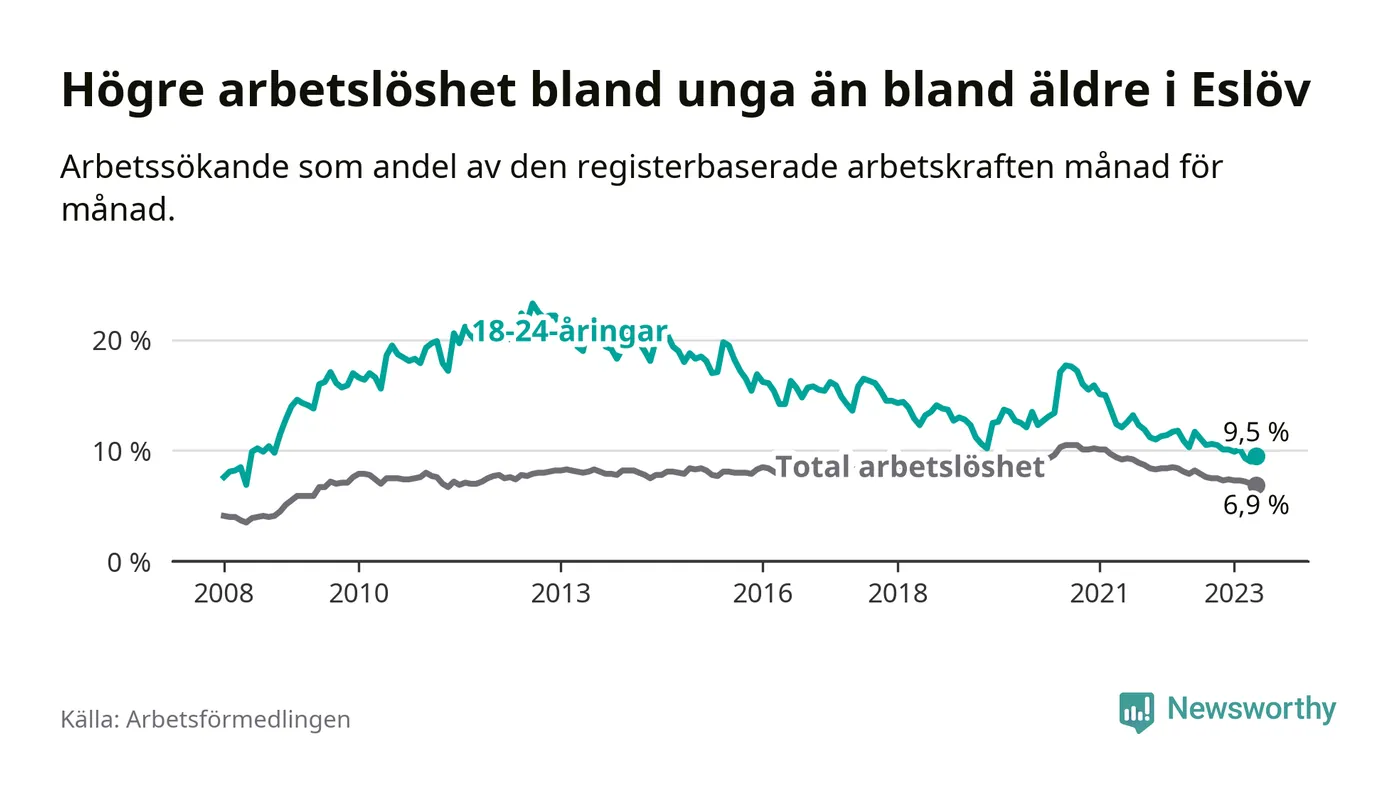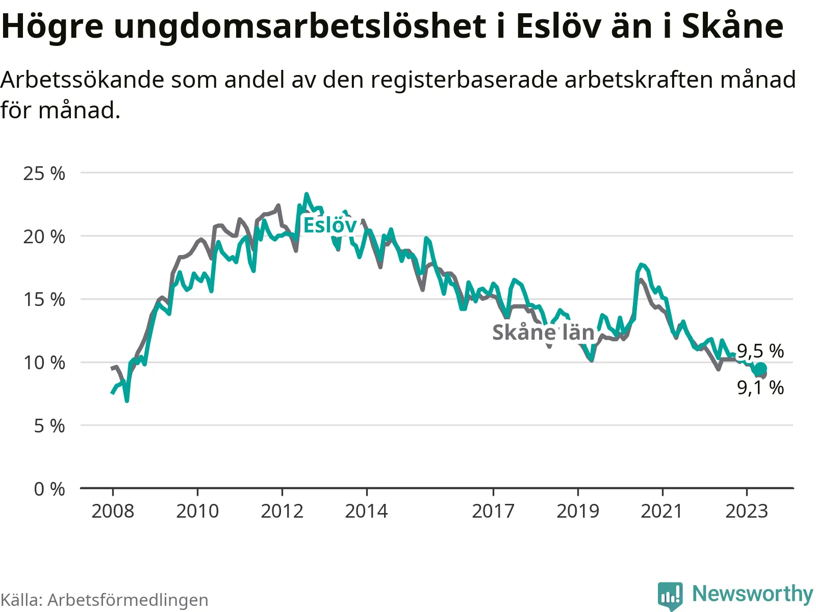 Medan Eslöv har lägre total arbetslöshet än Skåne, ligger ungdomsarbetslösheten 0,4 procentenheter högre i Eslöv.
