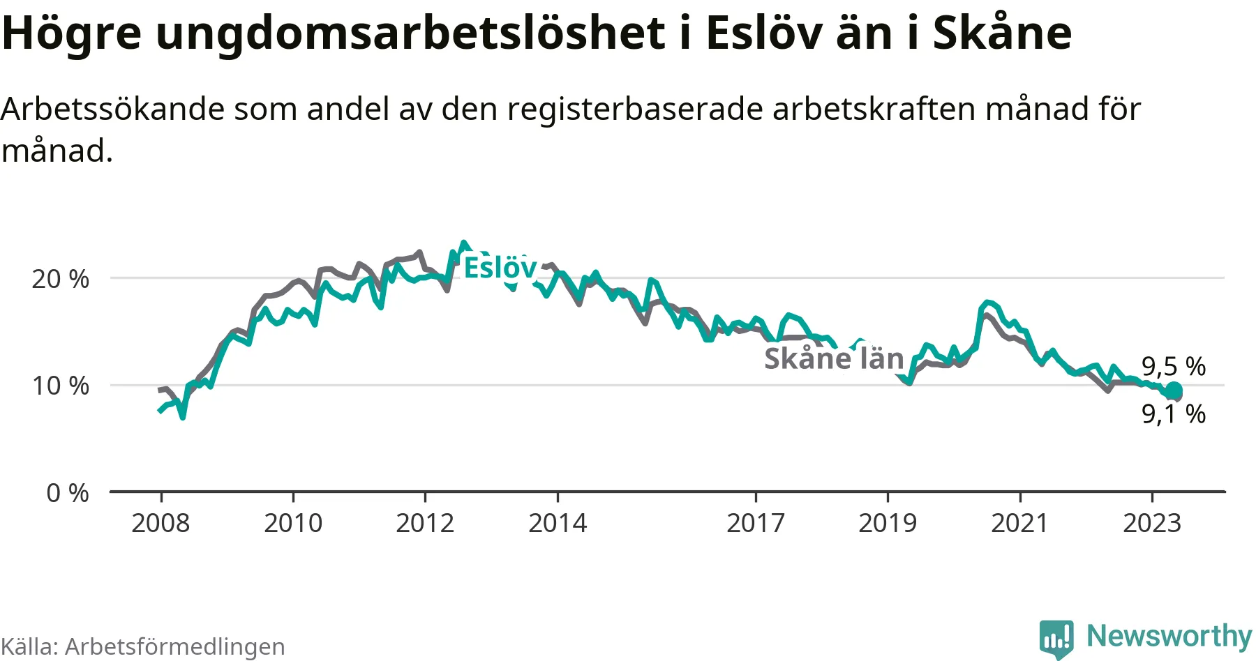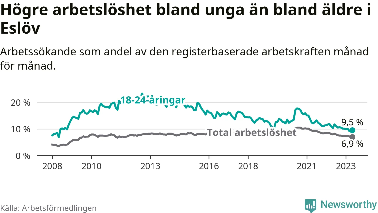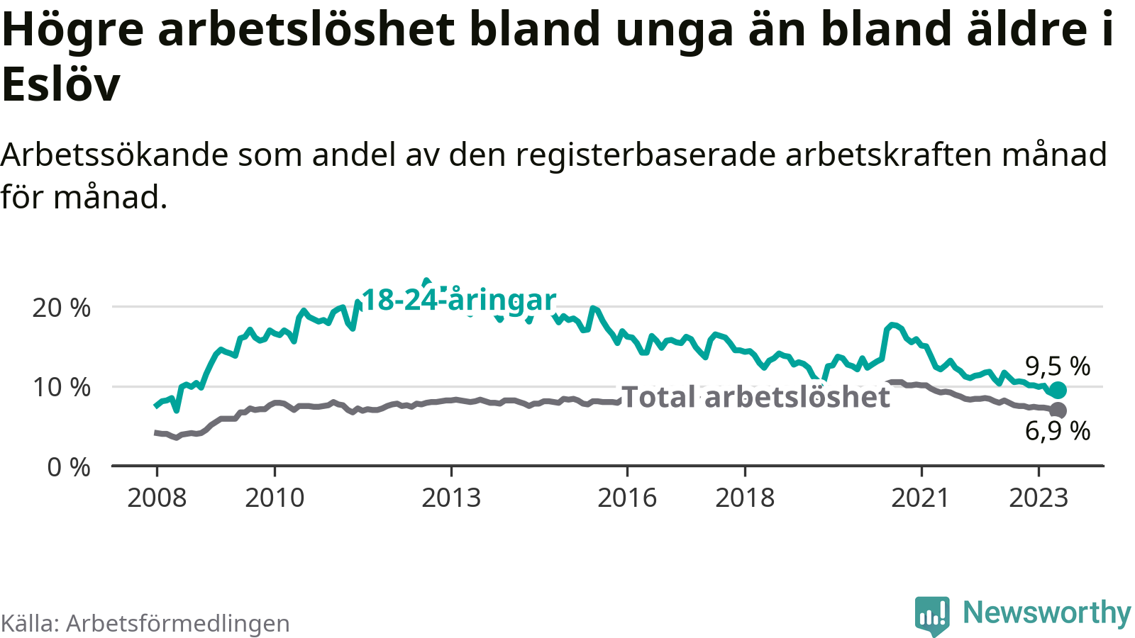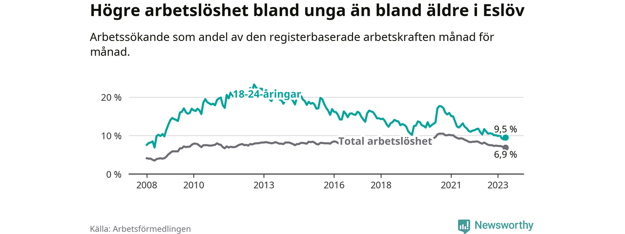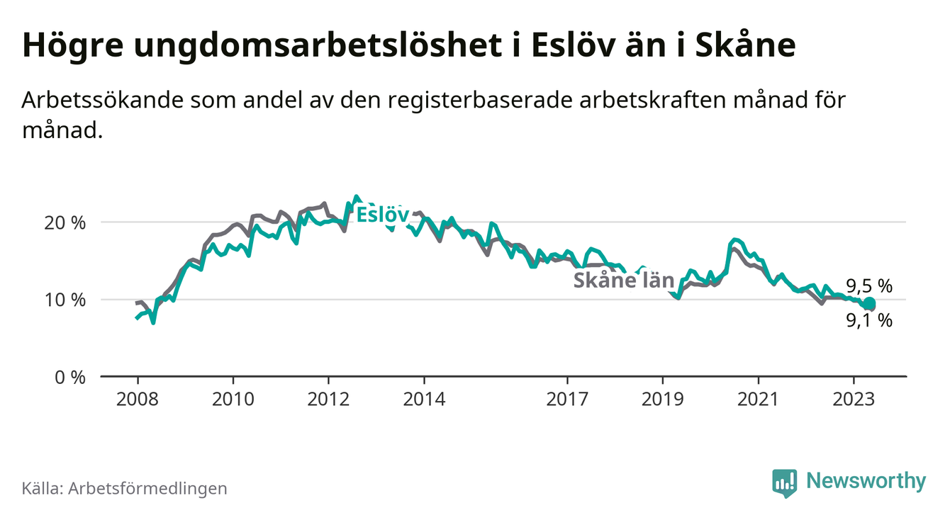 Medan Eslöv har lägre total arbetslöshet än Skåne, ligger ungdomsarbetslösheten 0,4 procentenheter högre i Eslöv.