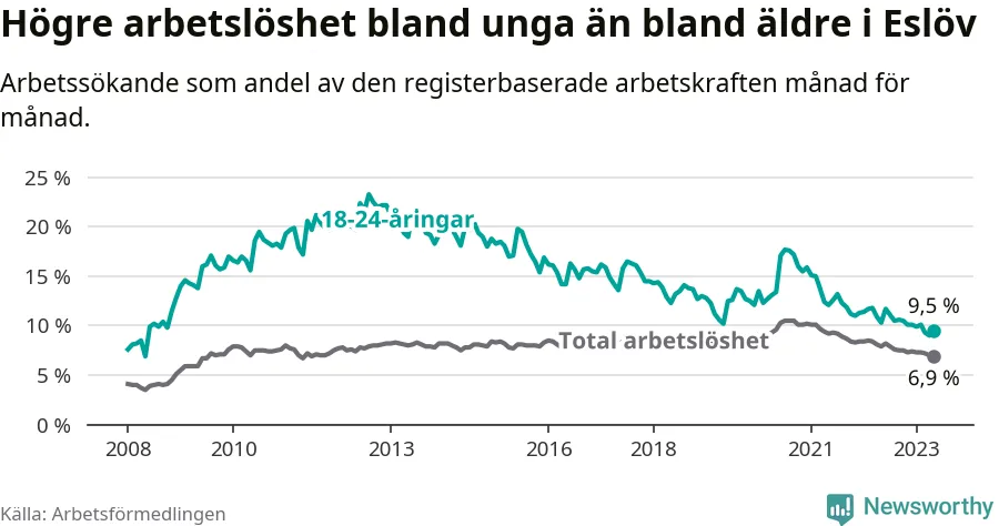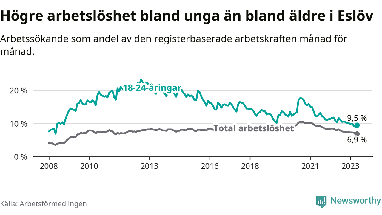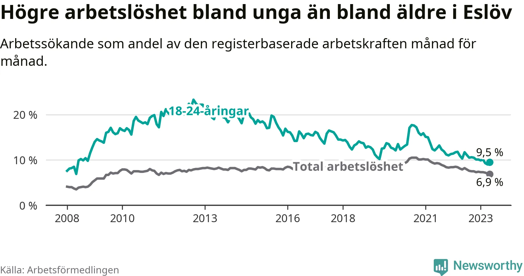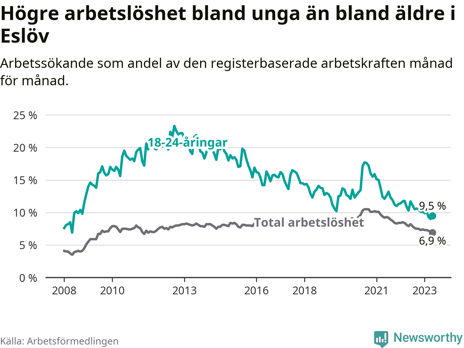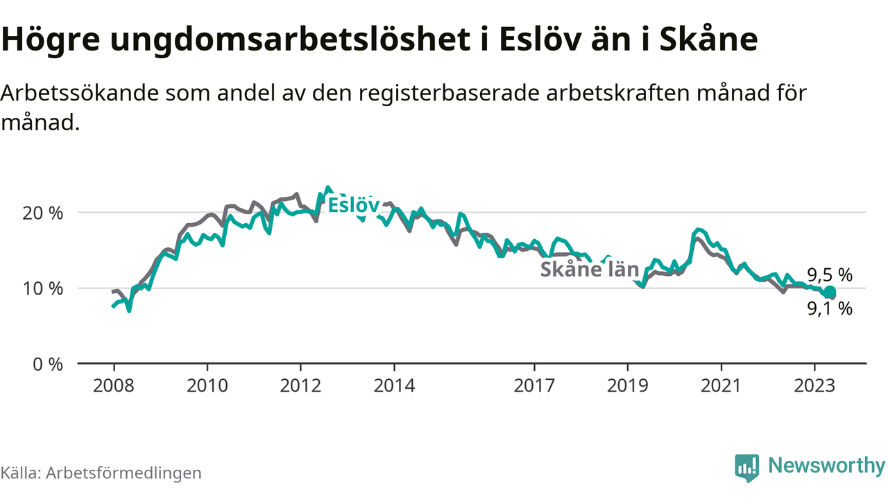 Medan Eslöv har lägre total arbetslöshet än Skåne, ligger ungdomsarbetslösheten 0,4 procentenheter högre i Eslöv.