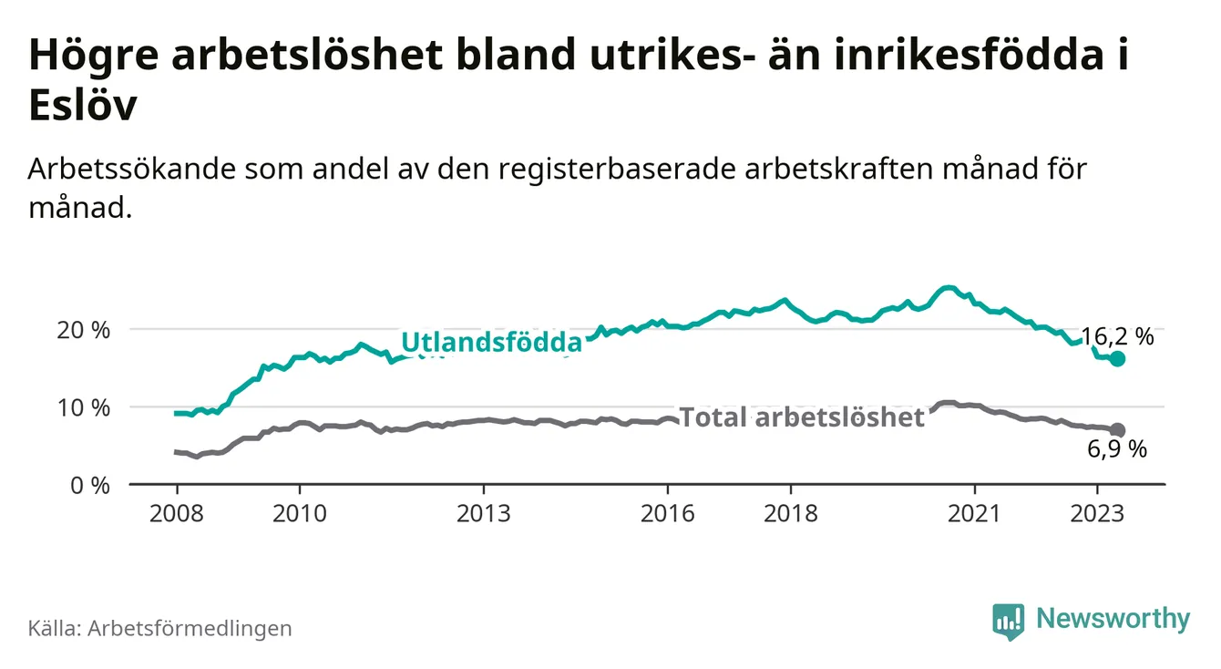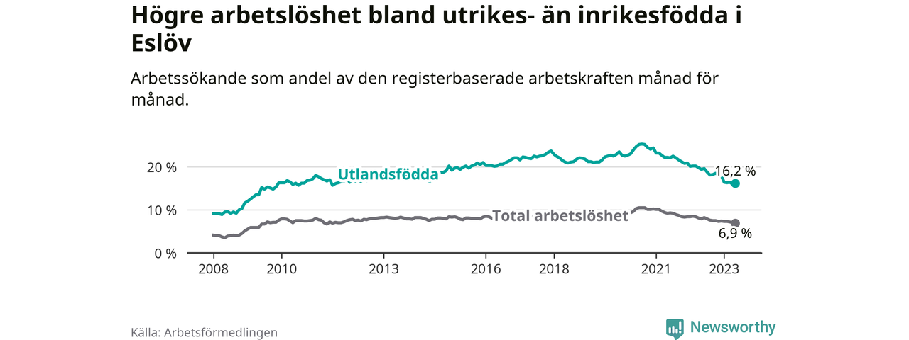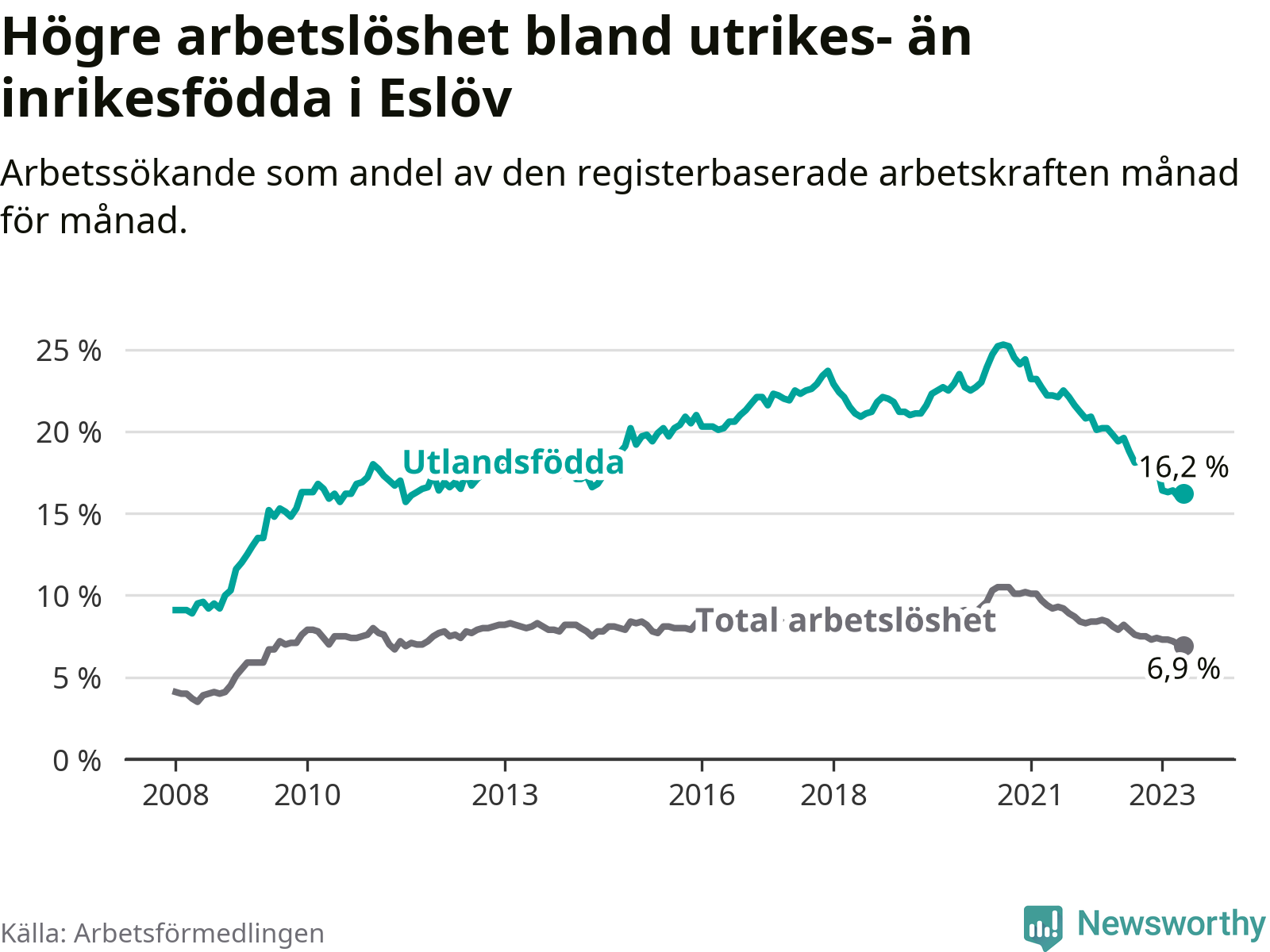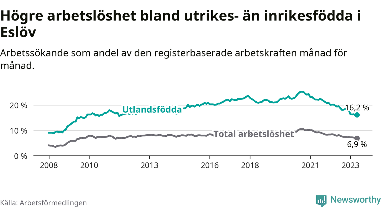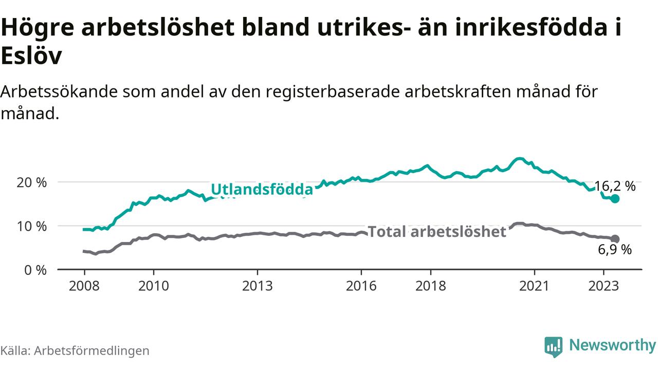Arbetslösheten bland utlandsfödda var 16,2 procent i Eslöv under maj månad, motsvarande 676 av 4 173 personer. Det är 3,2 procentenheter färre än vid samma tidpunkt i fjol (−83 om man räknar personer). Därmed har de utlandsföddas arbetslöshet varit lägre än vid samma tidpunkt i fjol i över två år i sträck. Sedan mars 2021 har arbetslösheten bland utlandsfödda minskat från 22,7 till 16,2 procent.
