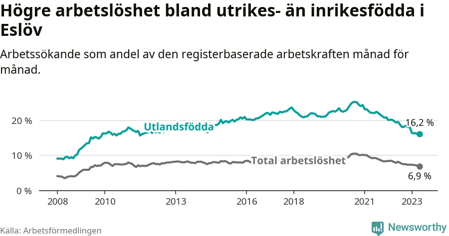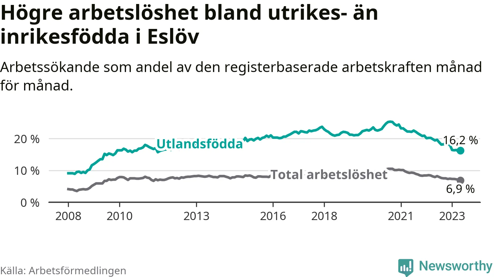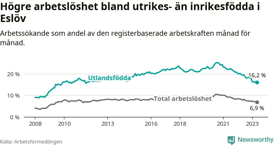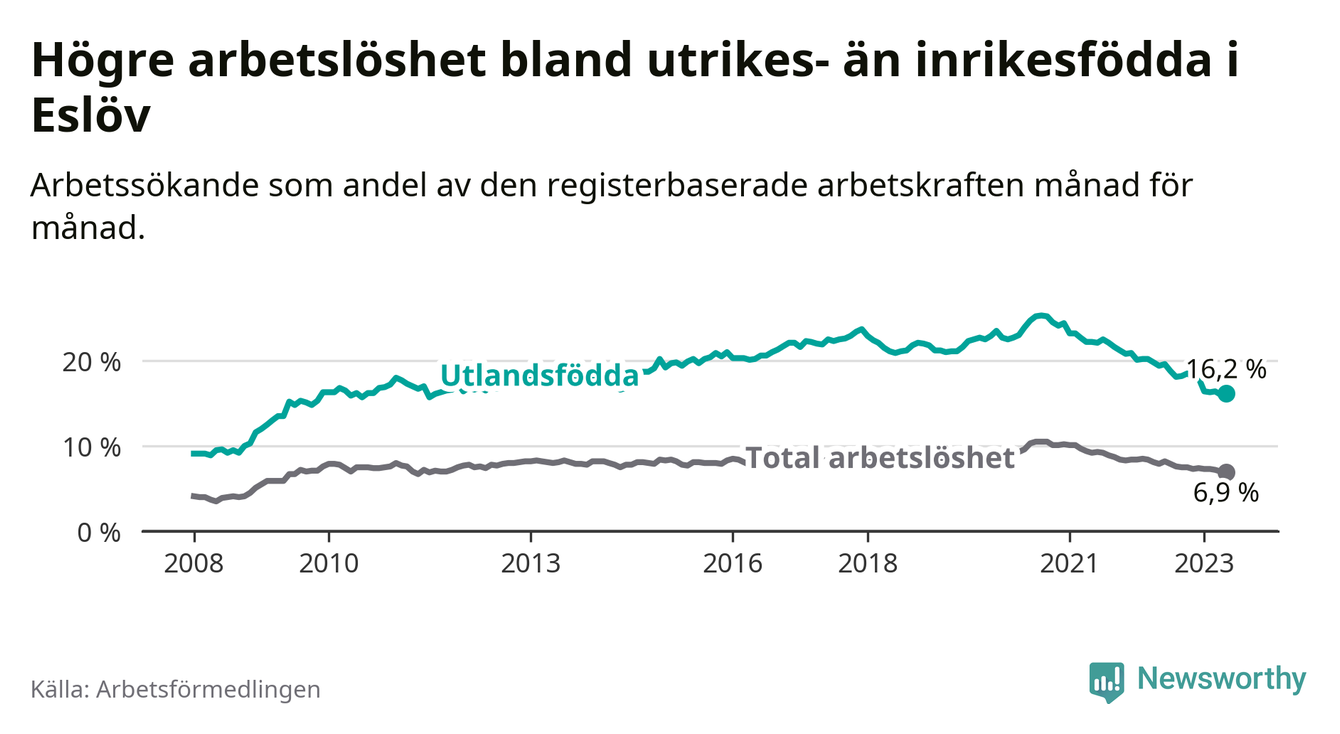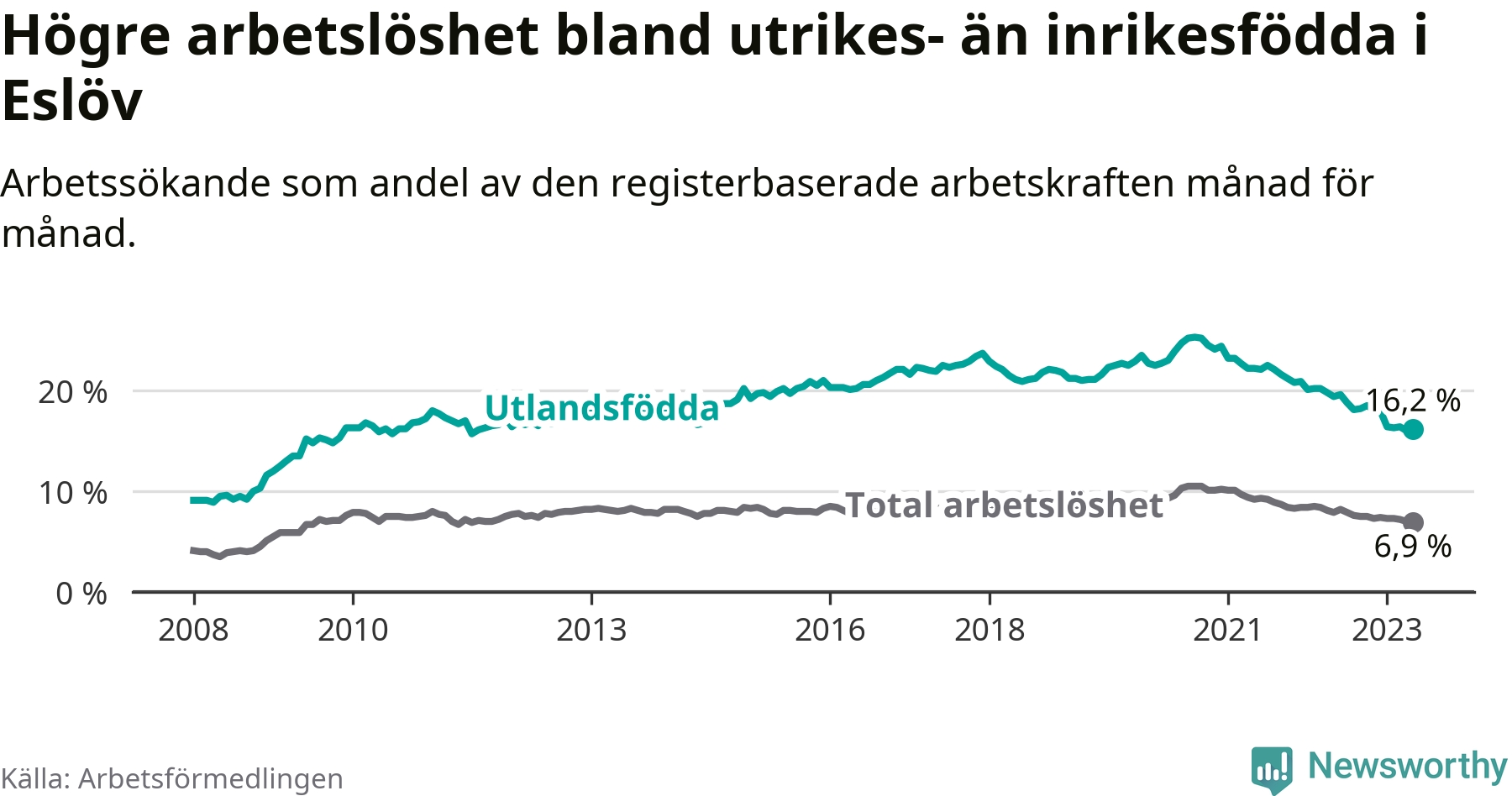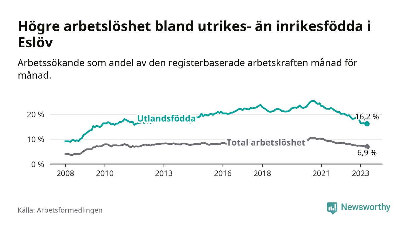 Arbetslösheten bland utlandsfödda var 16,2 procent i Eslöv under maj månad, motsvarande 676 av 4 173 personer. Det är 3,2 procentenheter färre än vid samma tidpunkt i fjol (−83 om man räknar personer). Därmed har de utlandsföddas arbetslöshet varit lägre än vid samma tidpunkt i fjol i över två år i sträck. Sedan mars 2021 har arbetslösheten bland utlandsfödda minskat från 22,7 till 16,2 procent.