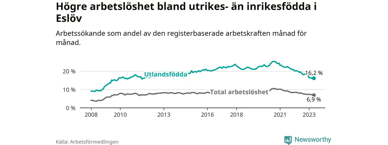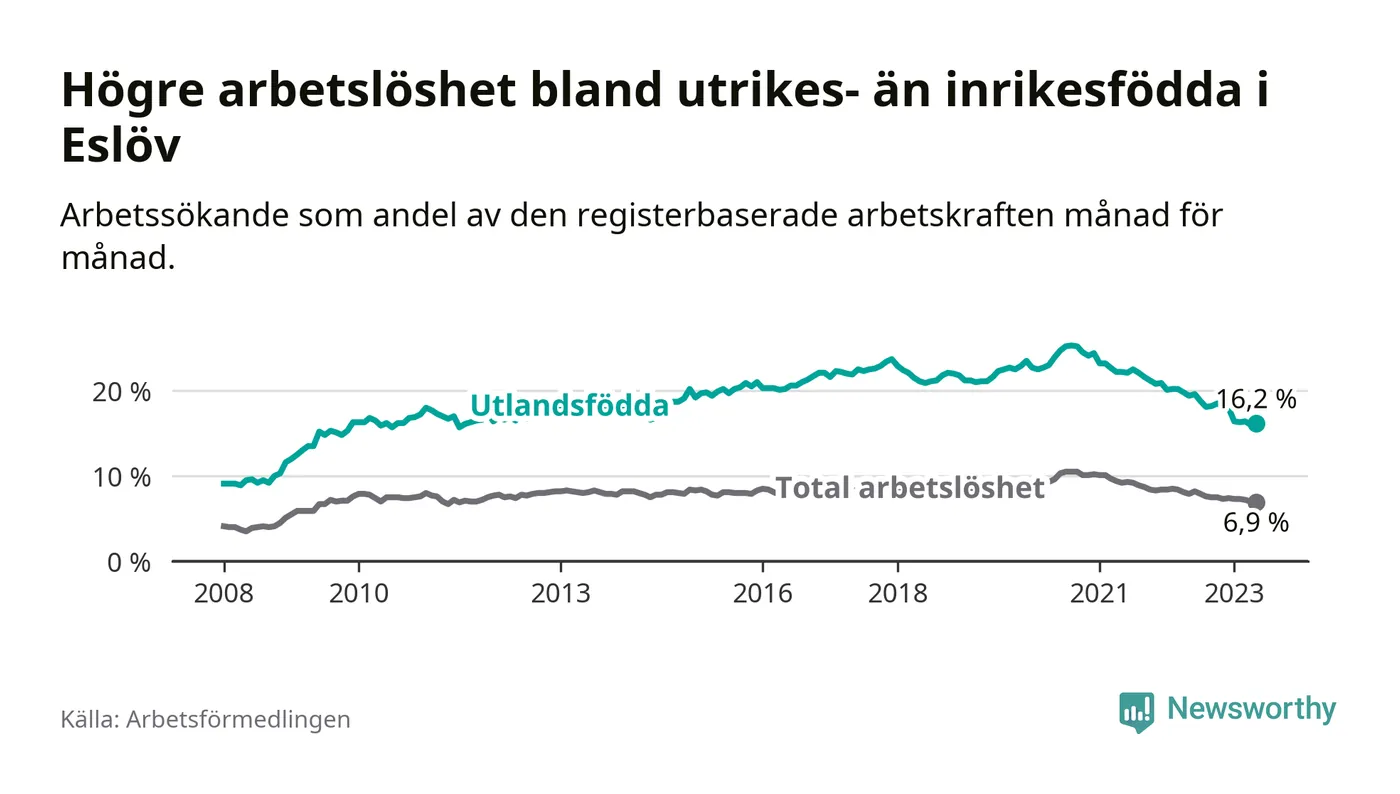 Skillnaden i arbetslöshet mellan utrikesfödda och hela befolkningen är 9,3 procentenheter i Eslöv. Det är en betydligt mindre skillnad än för ett år sedan (−2,2 procentenheter).