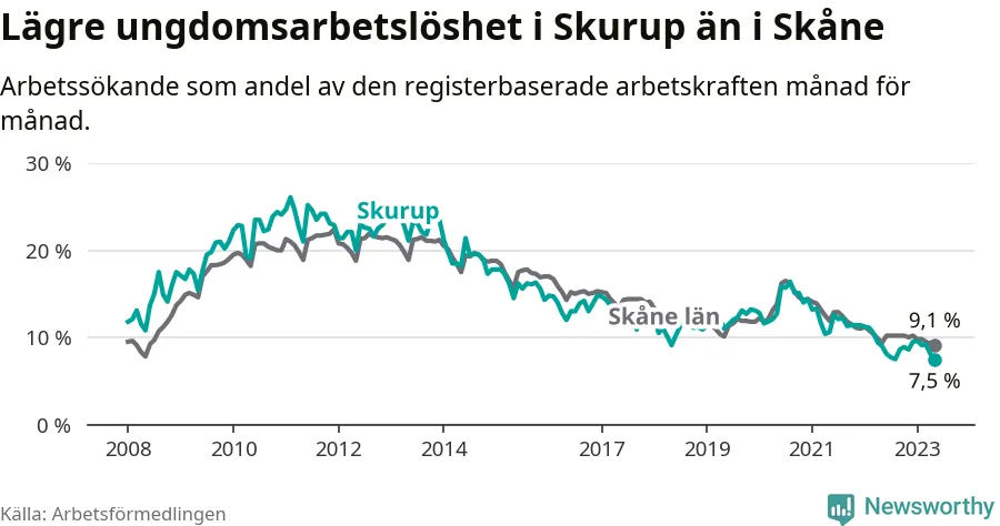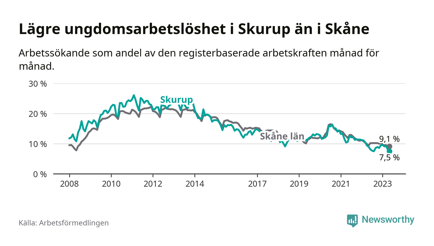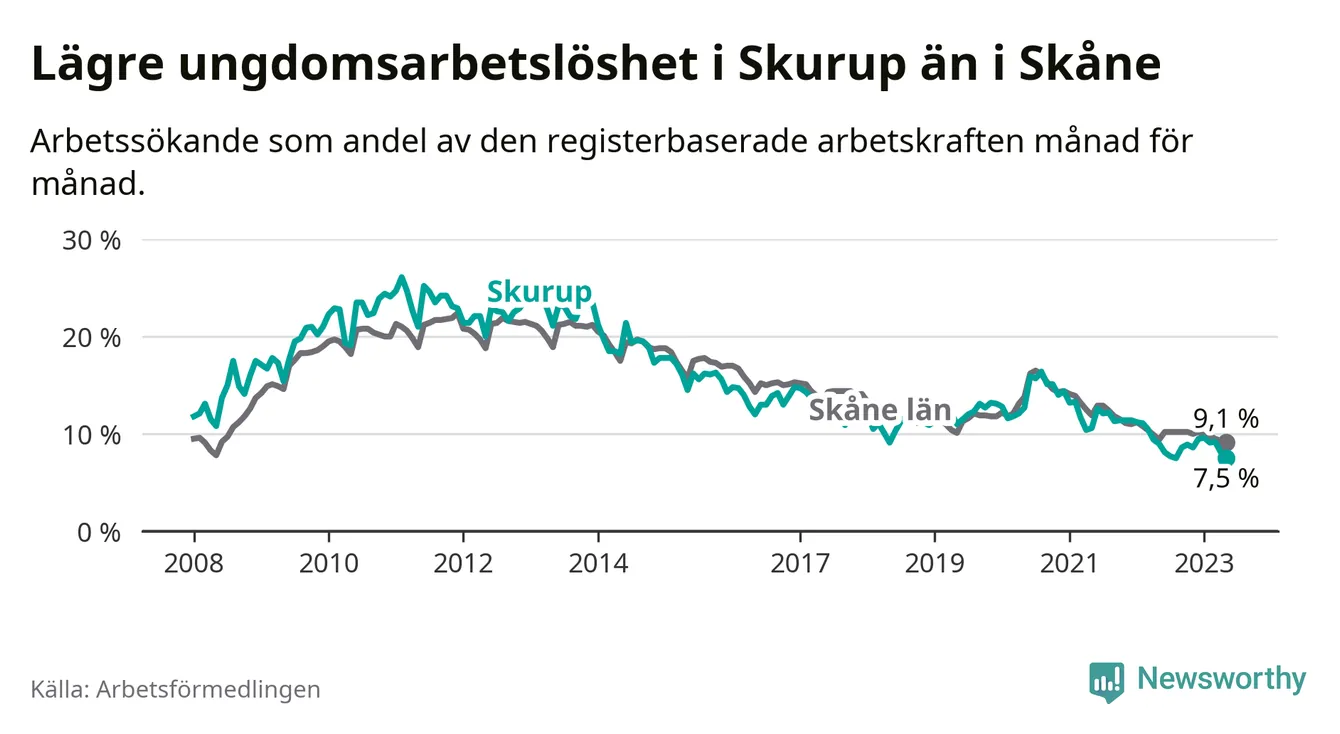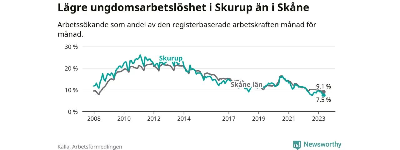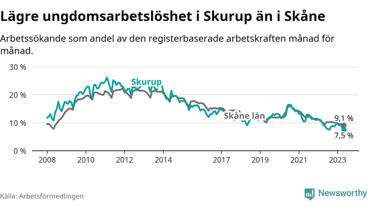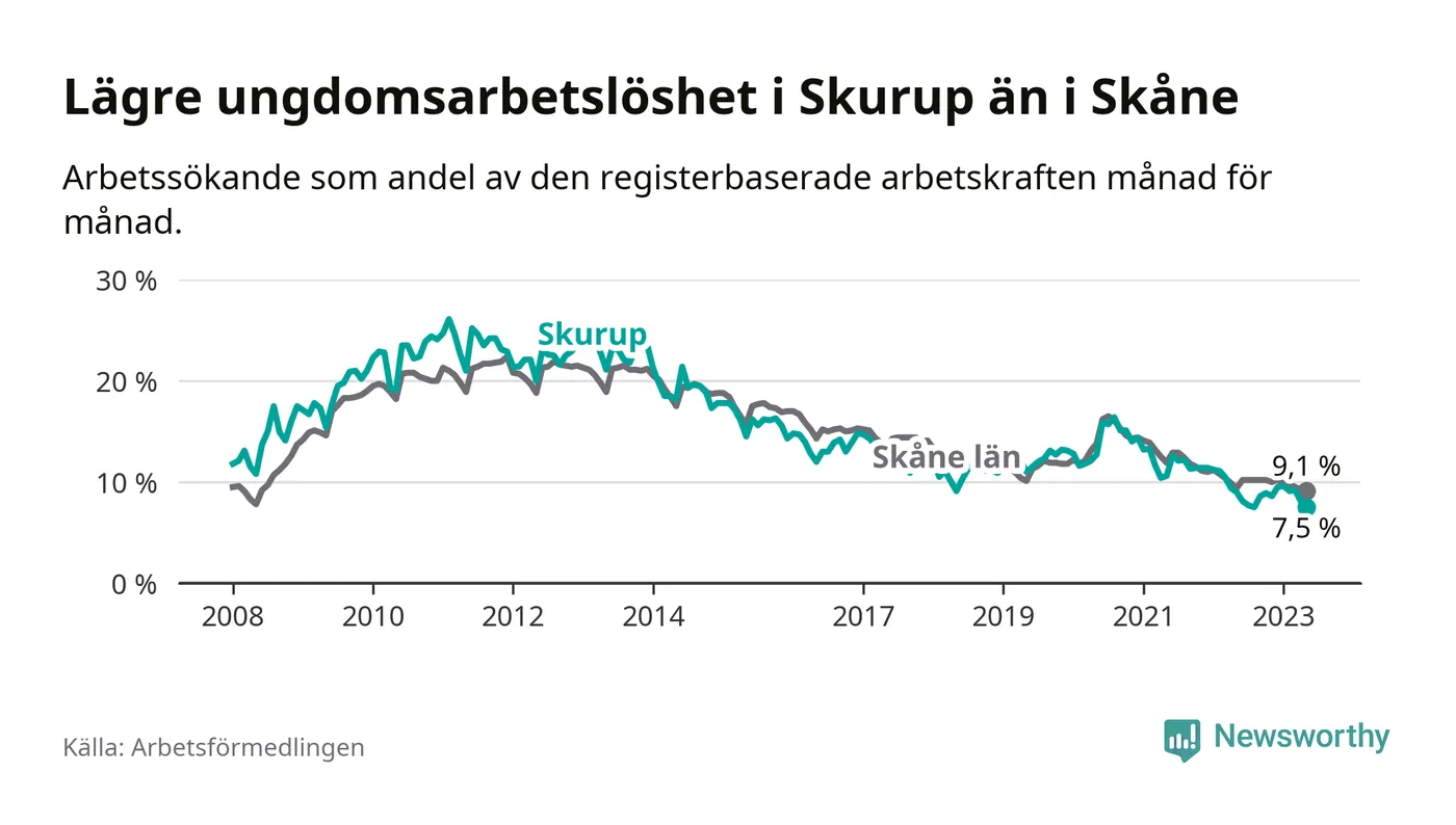 I och med den senaste månadens nedgång har de ungas arbetslöshet i Skurup sjunkit över två år i sträck (ner från 13,3 procent i februari 2021 till 7,5 procent nu).