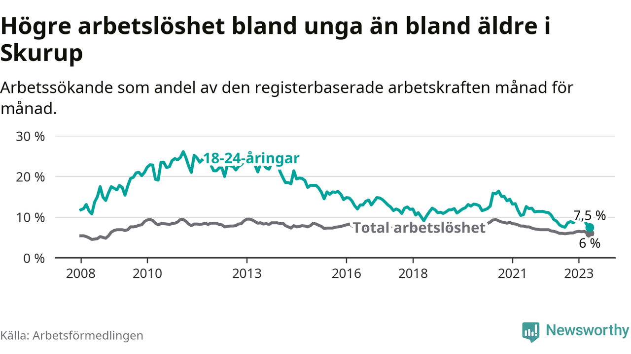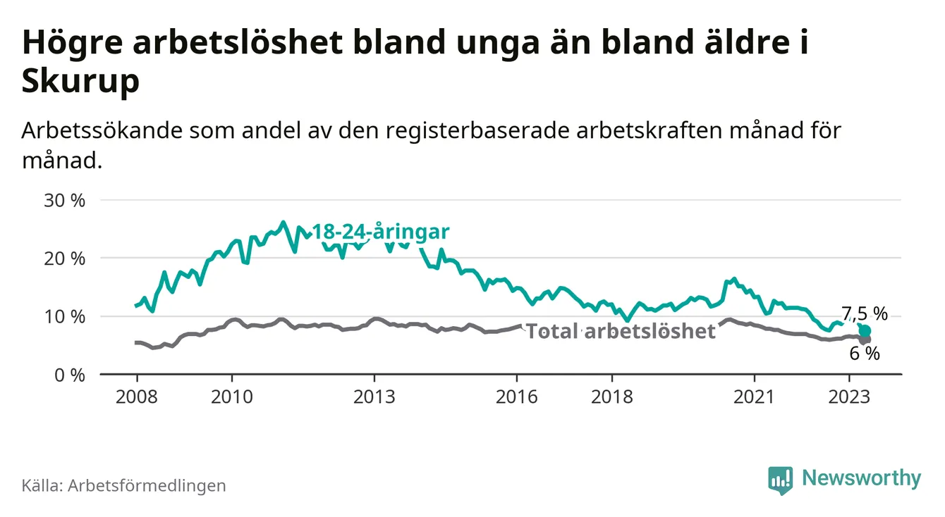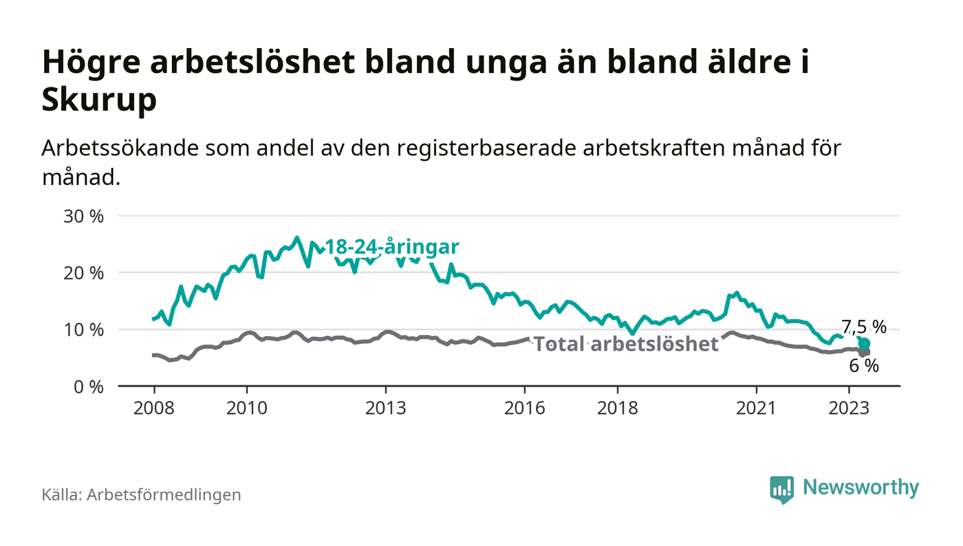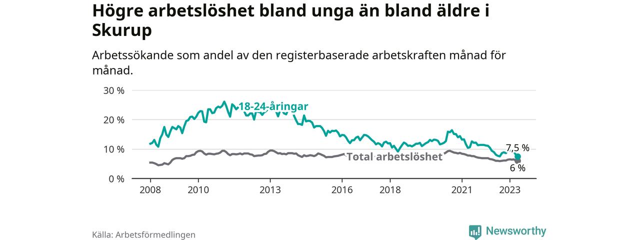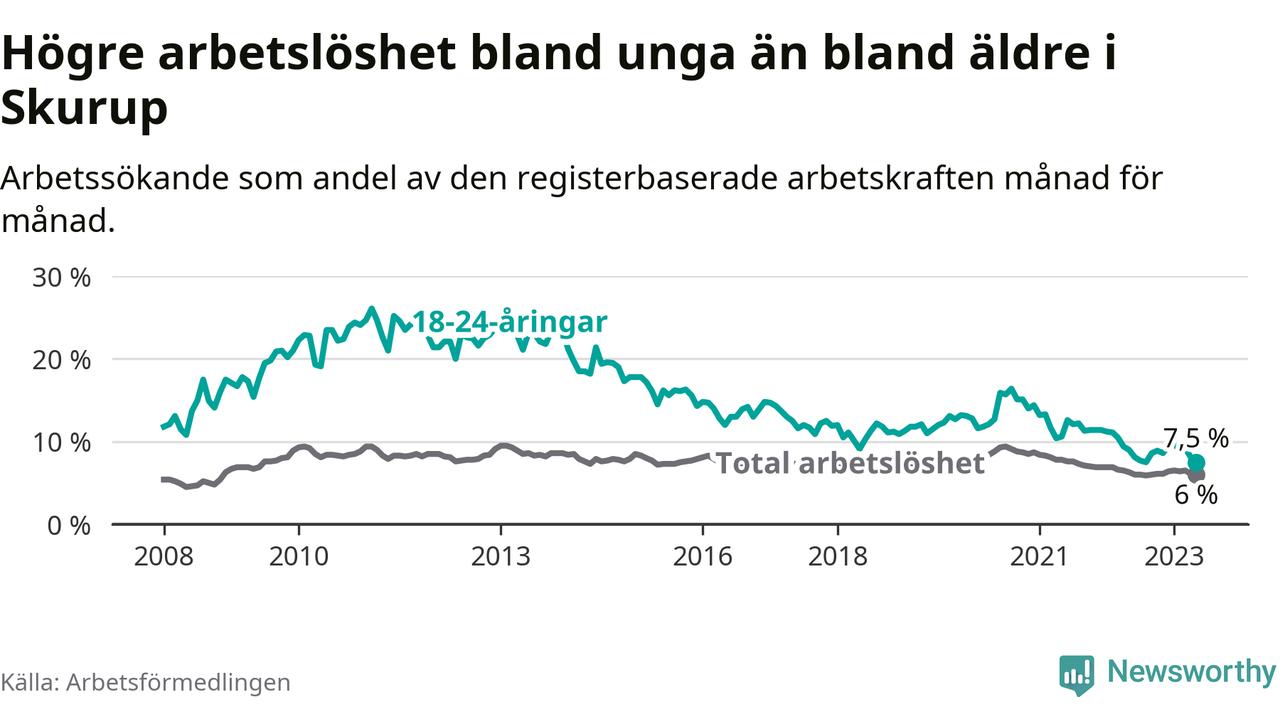 I och med den senaste månadens nedgång har de ungas arbetslöshet i Skurup sjunkit över två år i sträck (ner från 13,3 procent i februari 2021 till 7,5 procent nu).