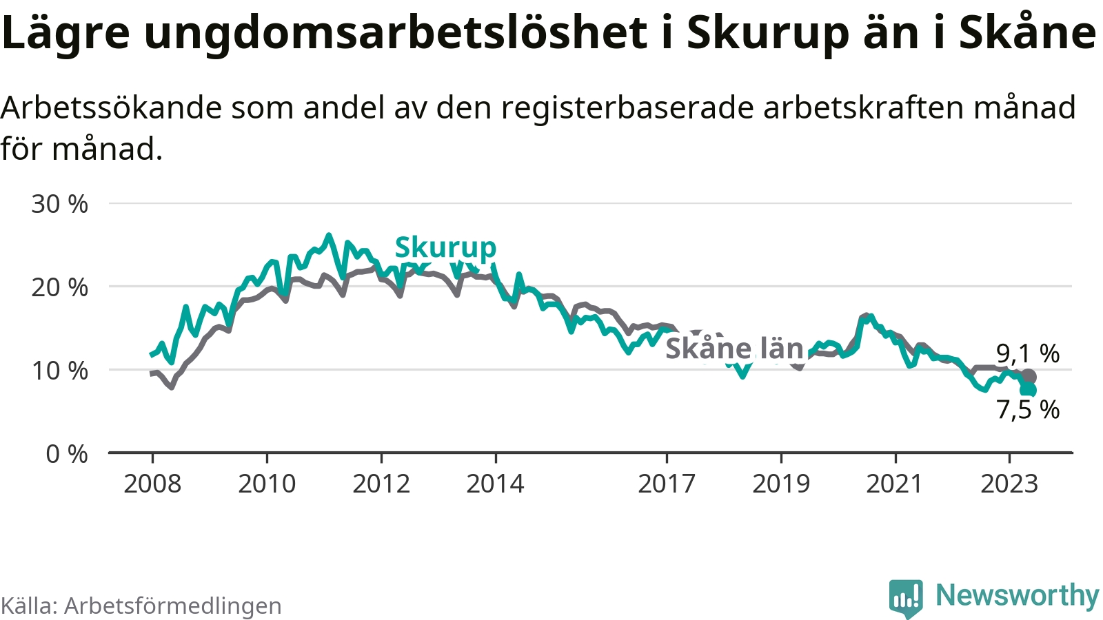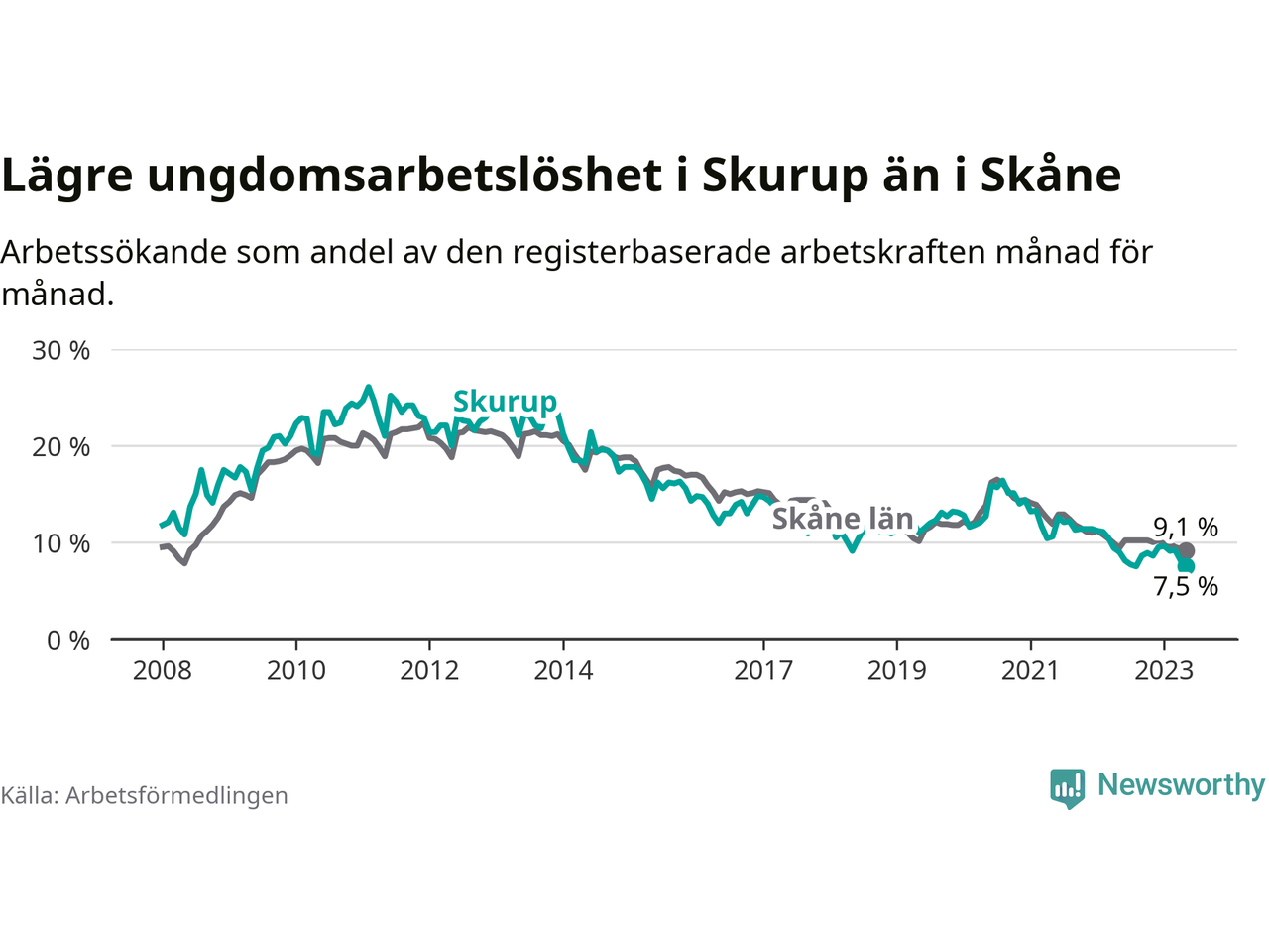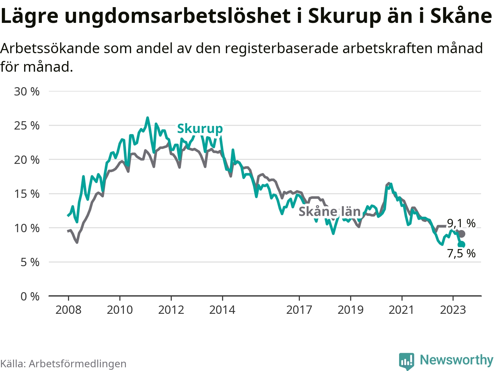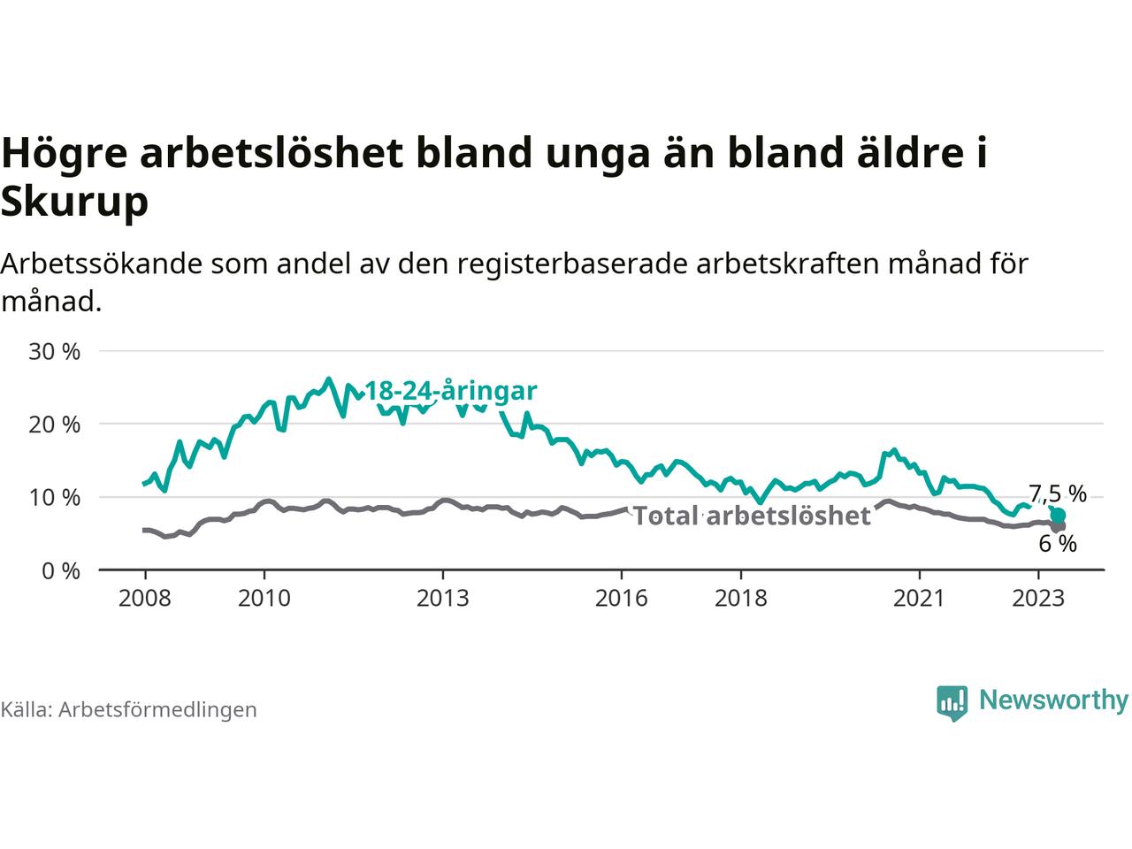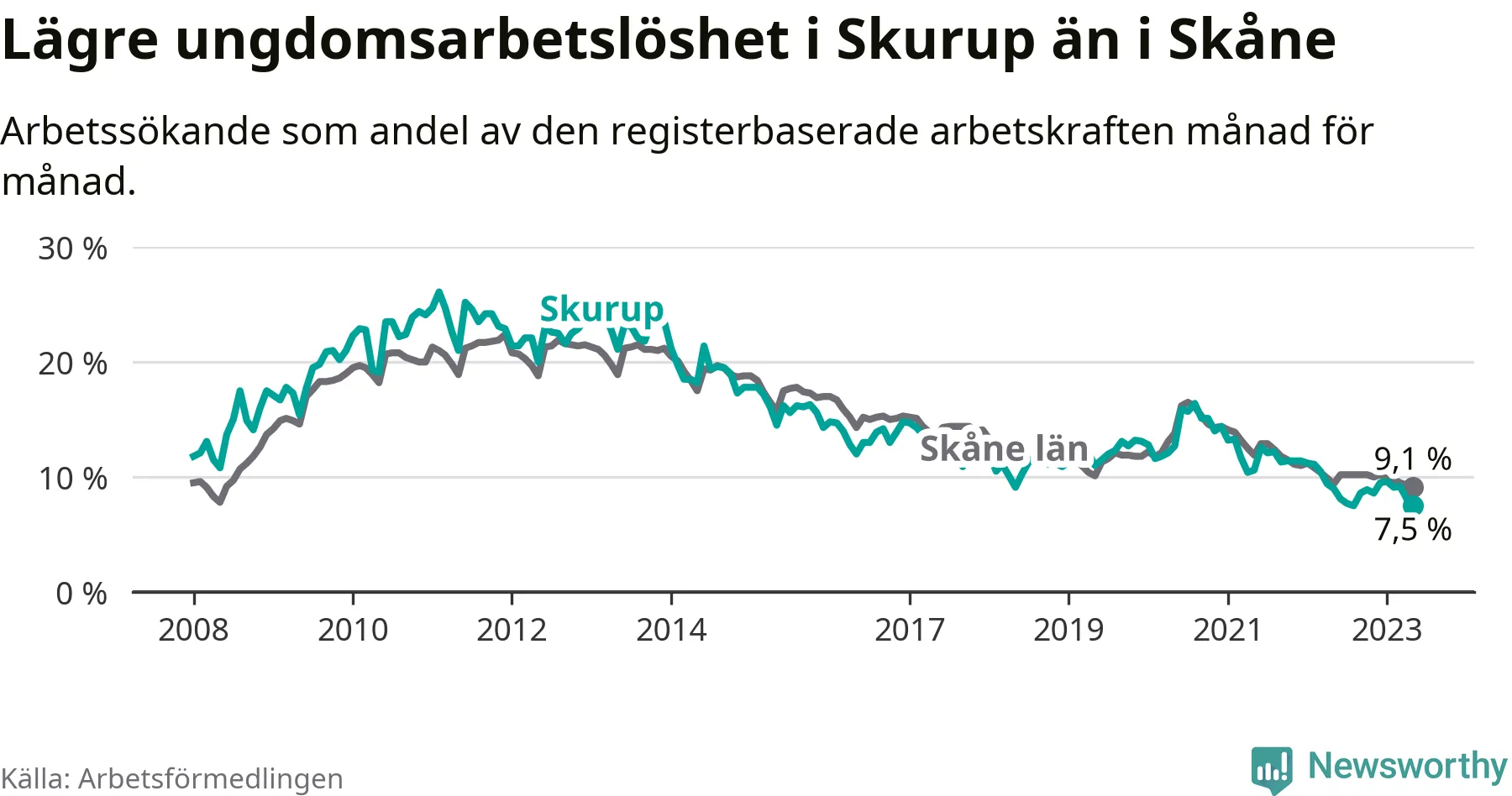 I och med den senaste månadens nedgång har de ungas arbetslöshet i Skurup sjunkit över två år i sträck (ner från 13,3 procent i februari 2021 till 7,5 procent nu).