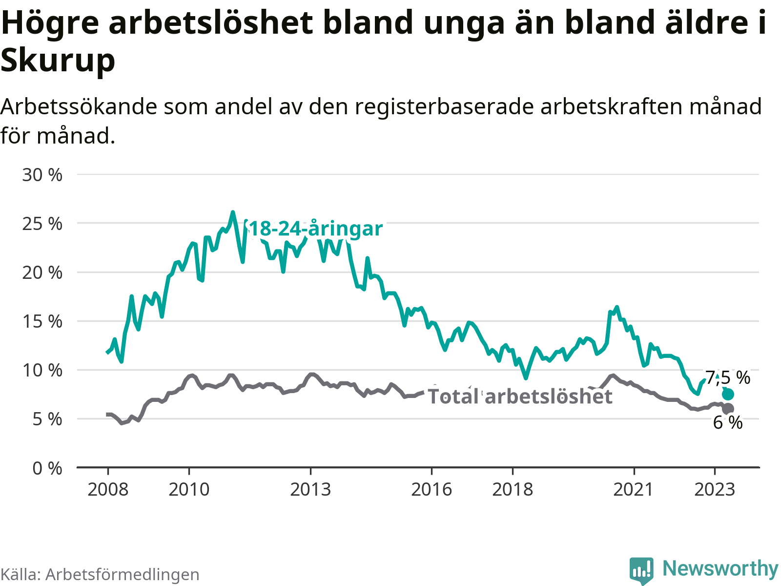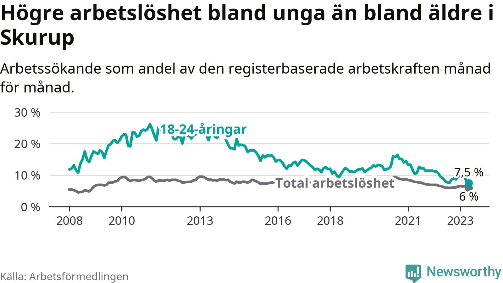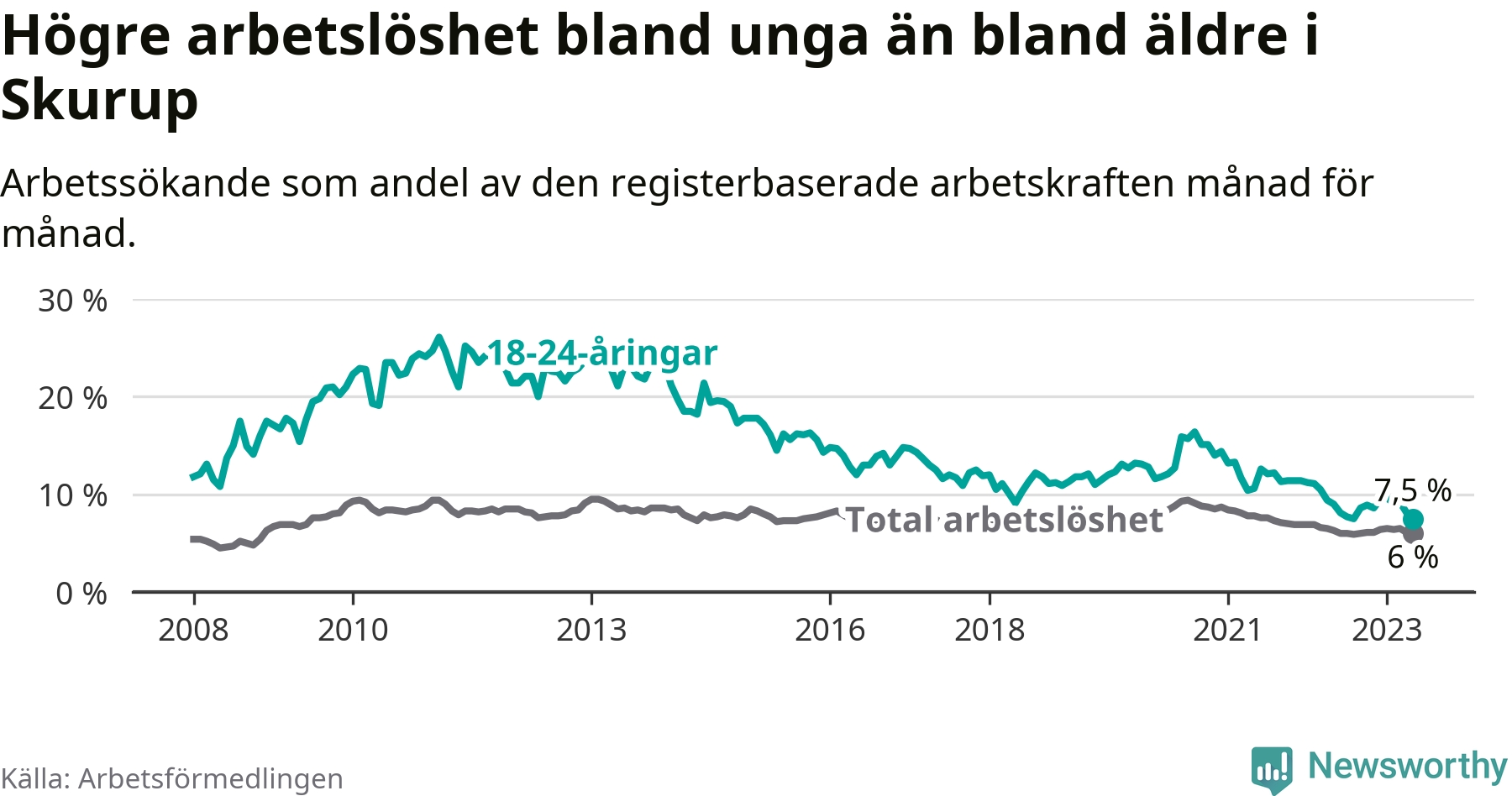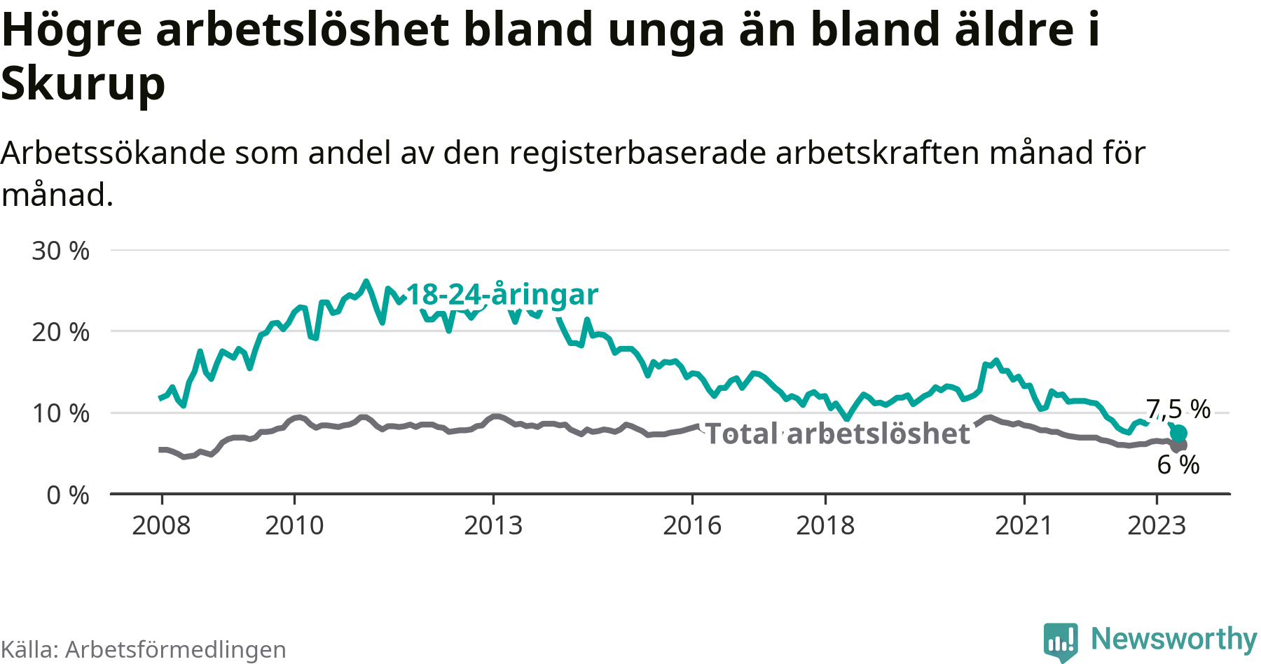 I och med den senaste månadens nedgång har de ungas arbetslöshet i Skurup sjunkit över två år i sträck (ner från 13,3 procent i februari 2021 till 7,5 procent nu).