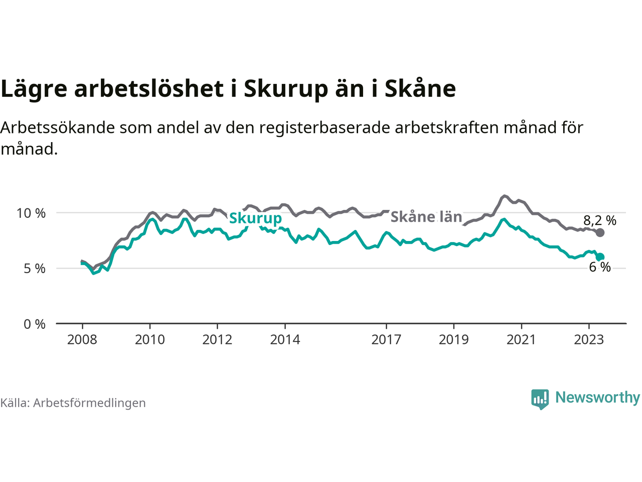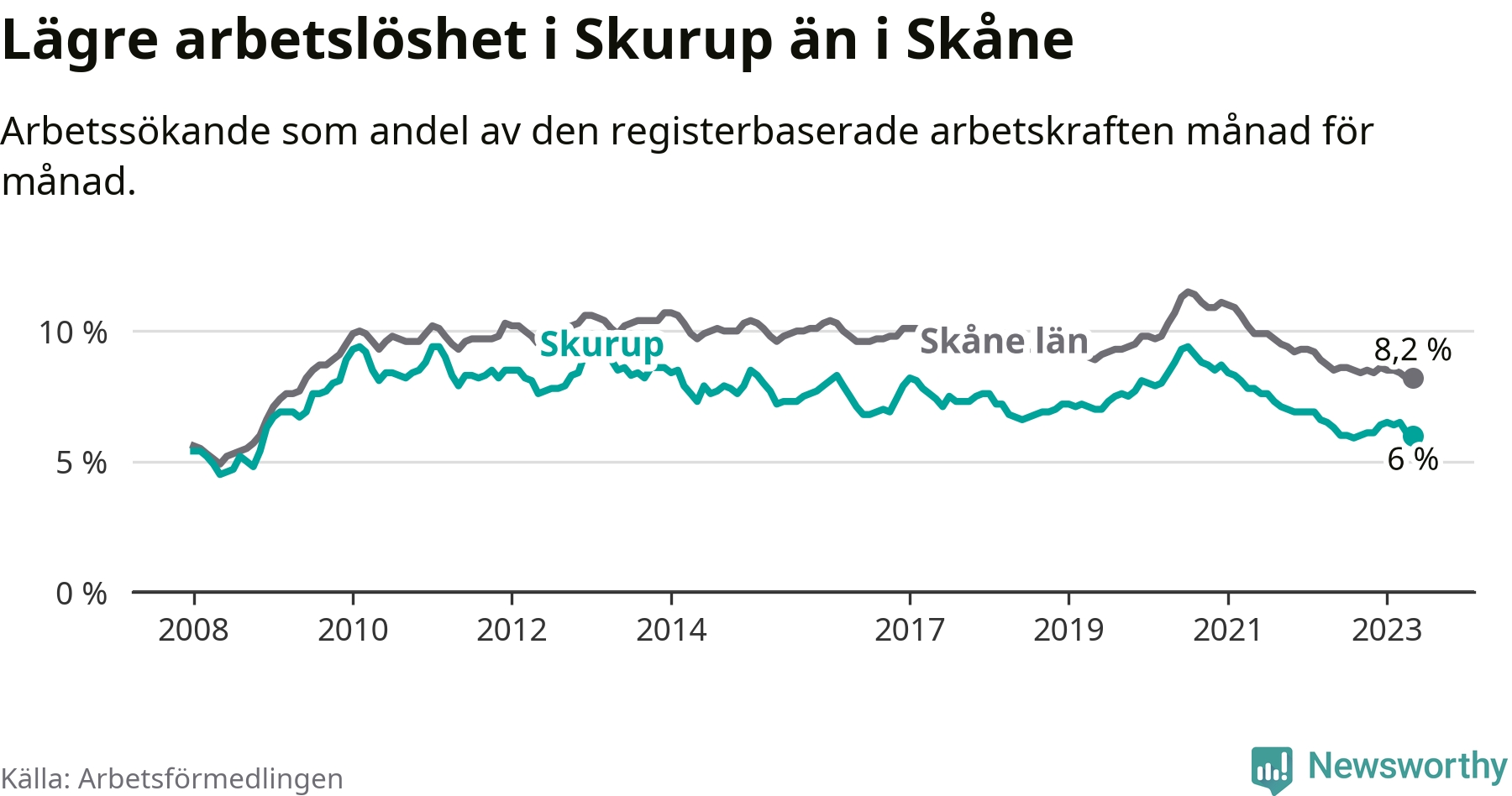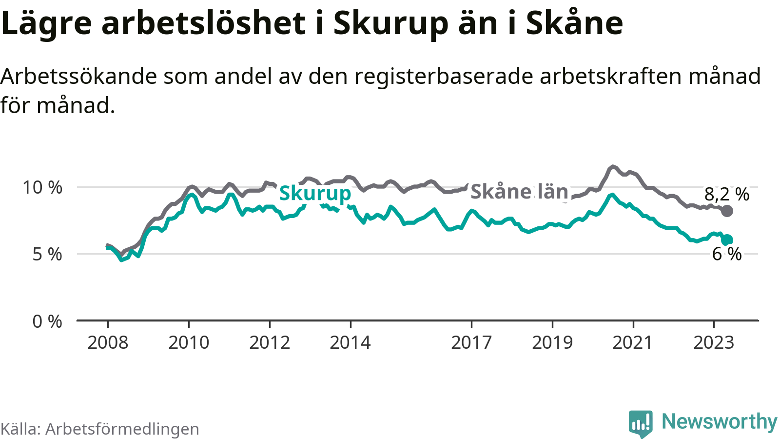 Skurup hade redan tidigare lägre arbetslöshet än snittet i hela Skåne län och nu växer klyftan (6,0 procent i kommunen, jämfört med 8,2 procent i hela länet). Lomma har den lägsta arbetslösheten i länet (3,1 procent), medan Perstorp har den högsta (11,8 procent). För att Skurup skulle komma ner i samma arbetslöshetsnivå som Lomma skulle 237 personer behöva sysselsättas.