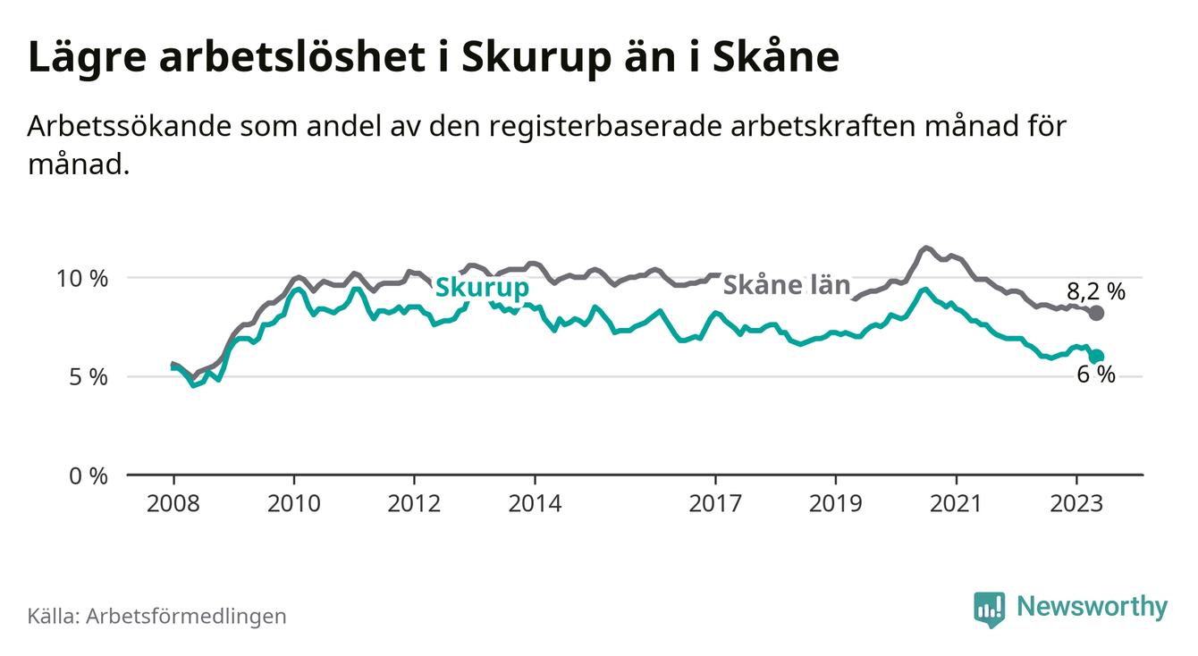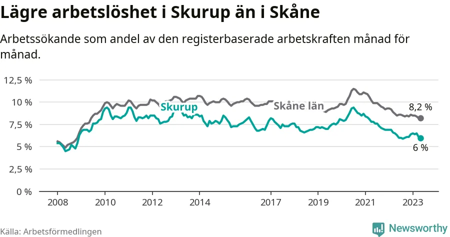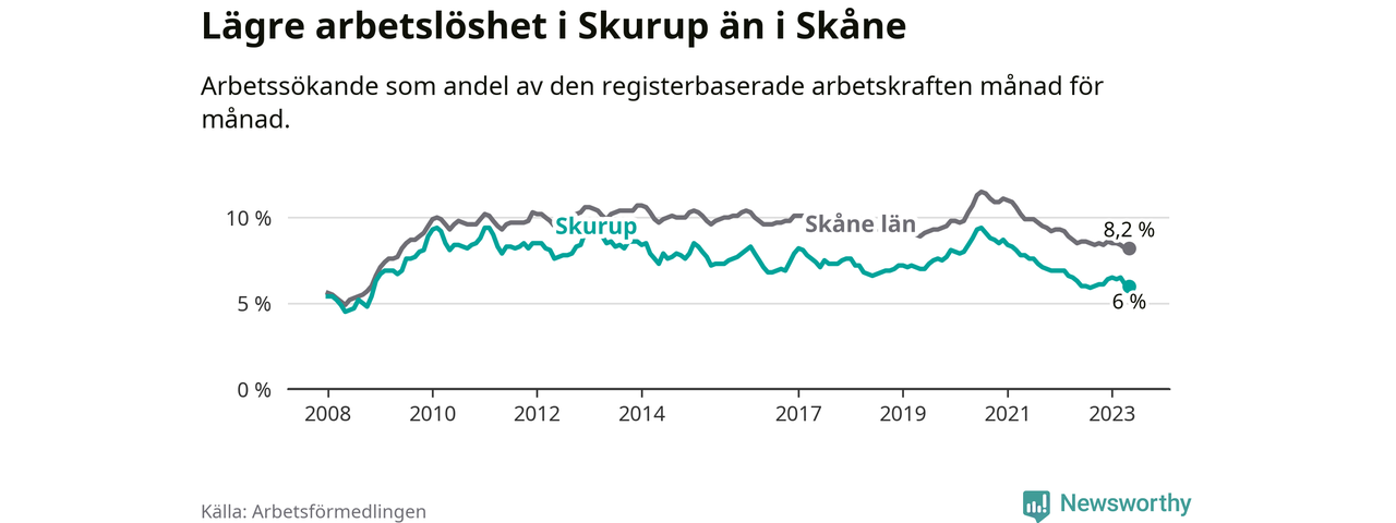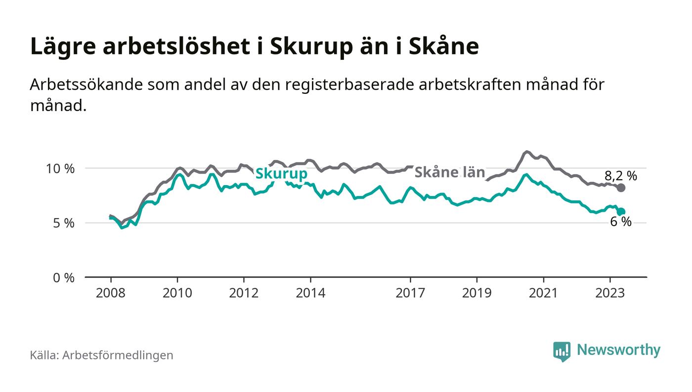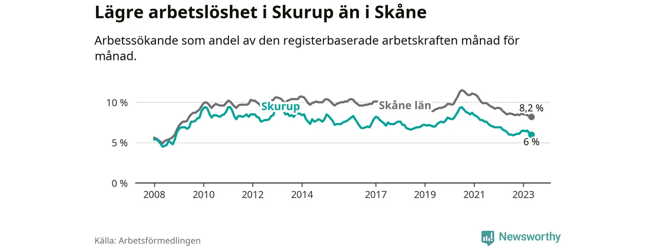 Det är 26:e månaden i följd som arbetslösheten i Skurup är lägre än den var under samma tidpunkt året innan. Sedan mars 2021 har arbetslösheten gått ner från 8,1 till 6,0 procent.