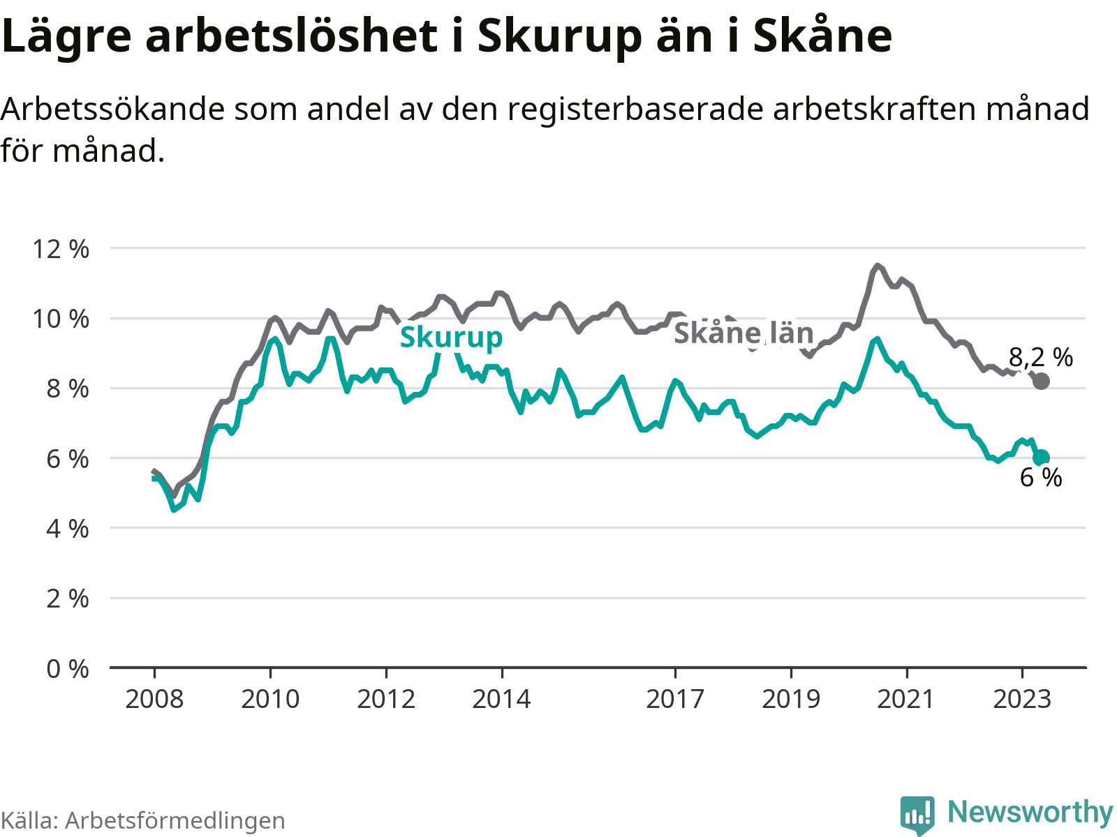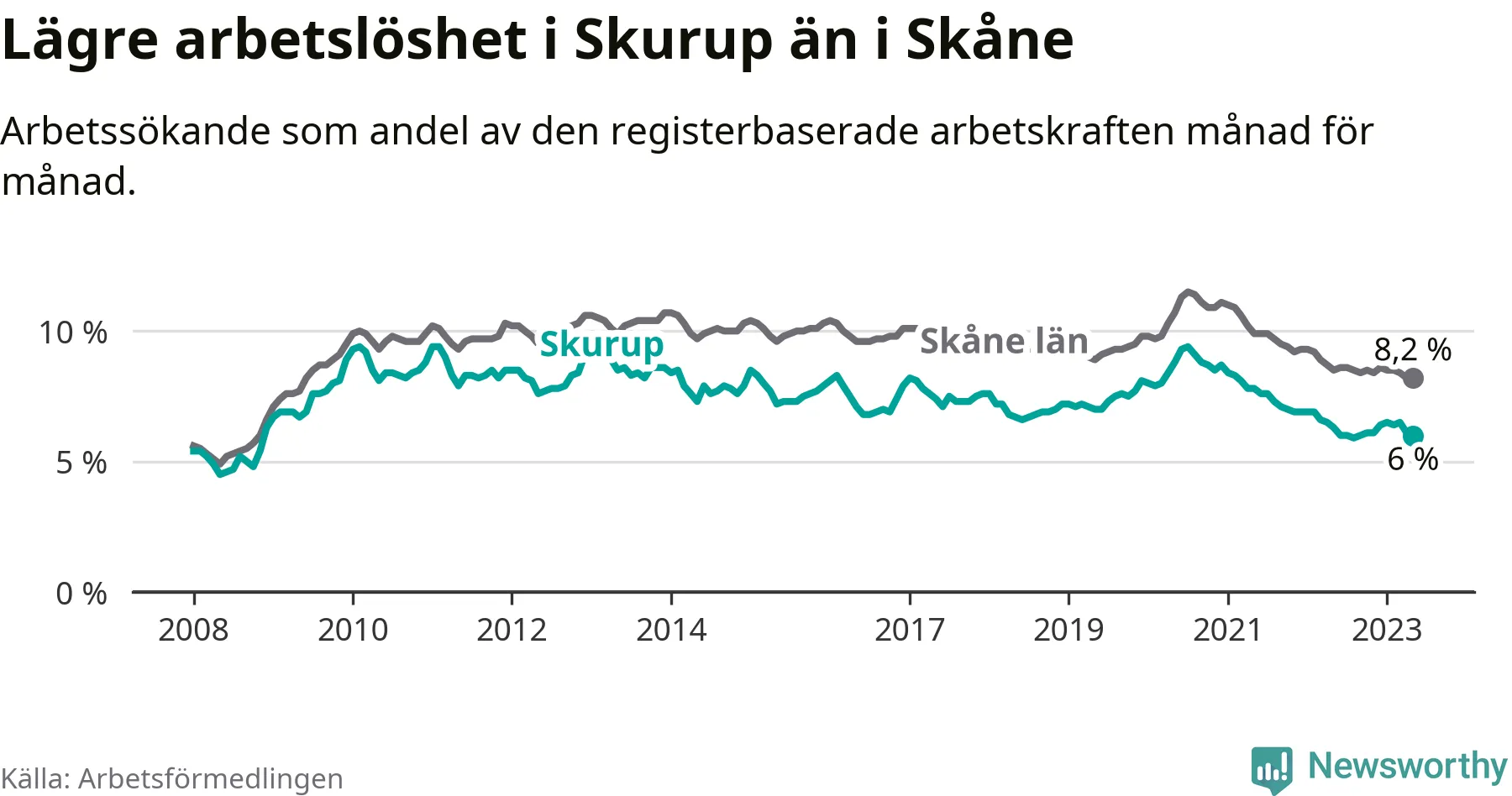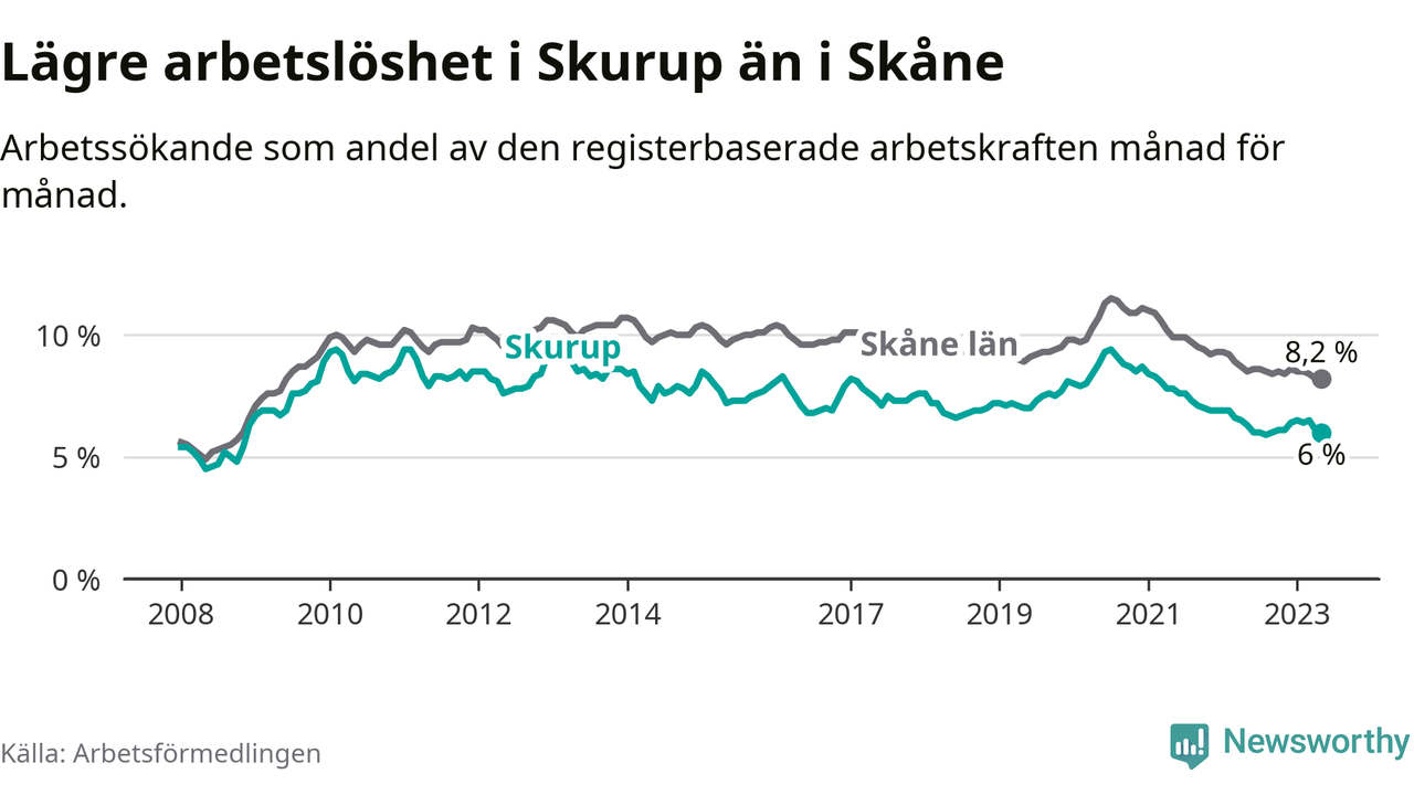 Det är 26:e månaden i följd som arbetslösheten i Skurup är lägre än den var under samma tidpunkt året innan. Sedan mars 2021 har arbetslösheten gått ner från 8,1 till 6,0 procent.