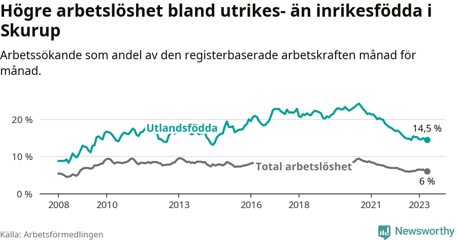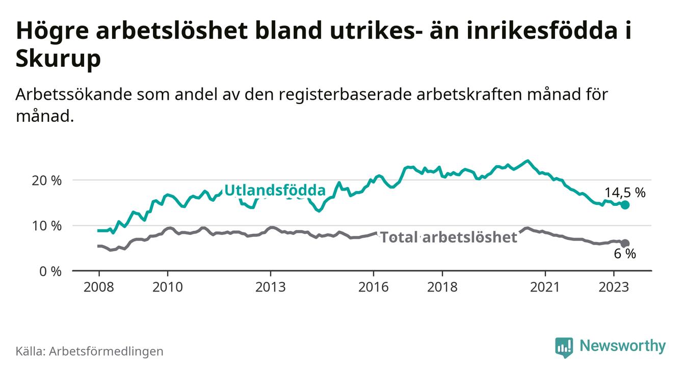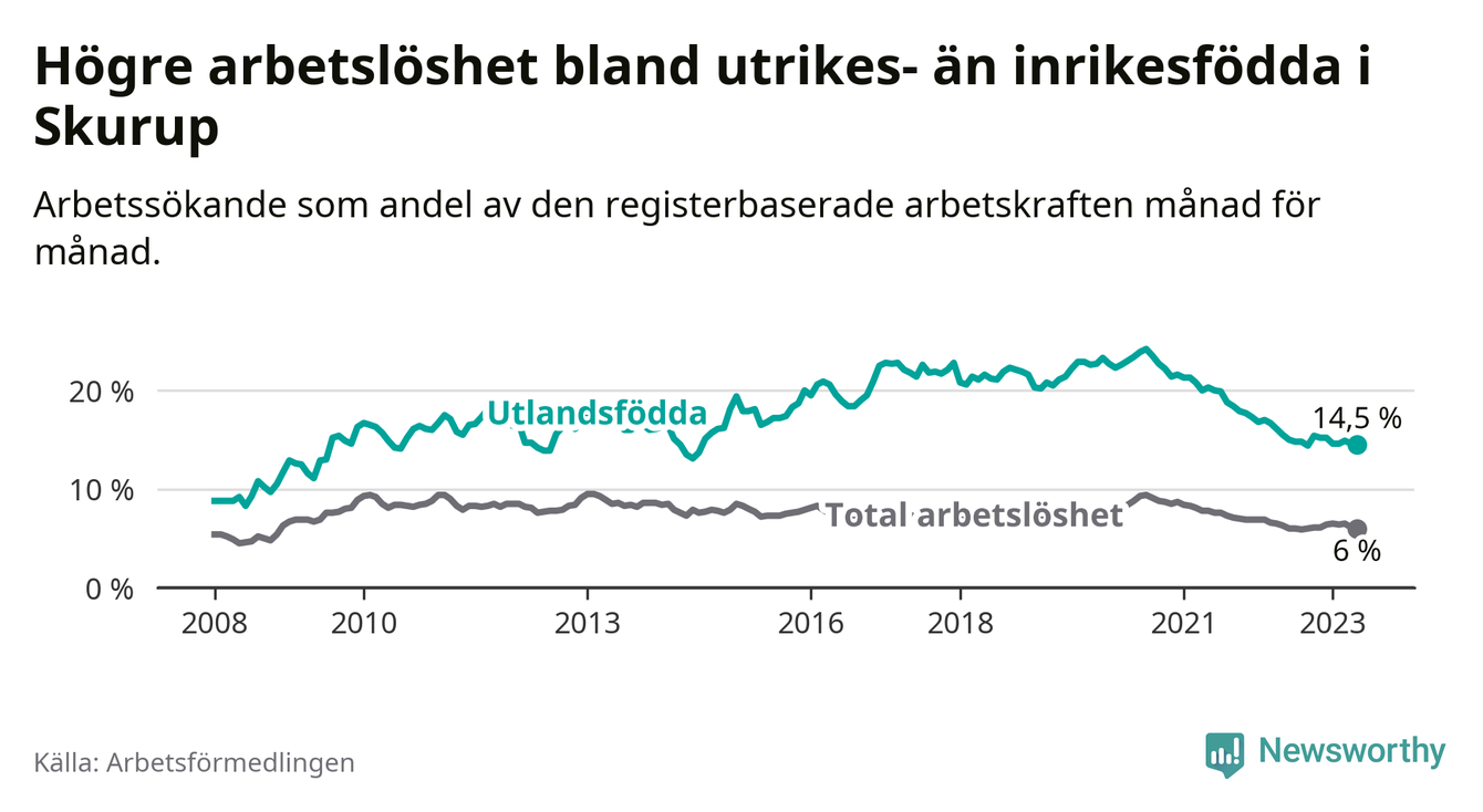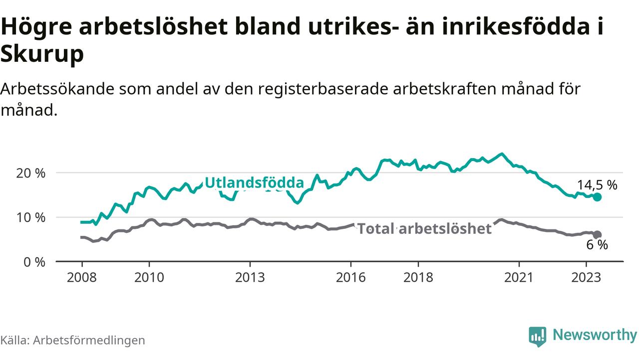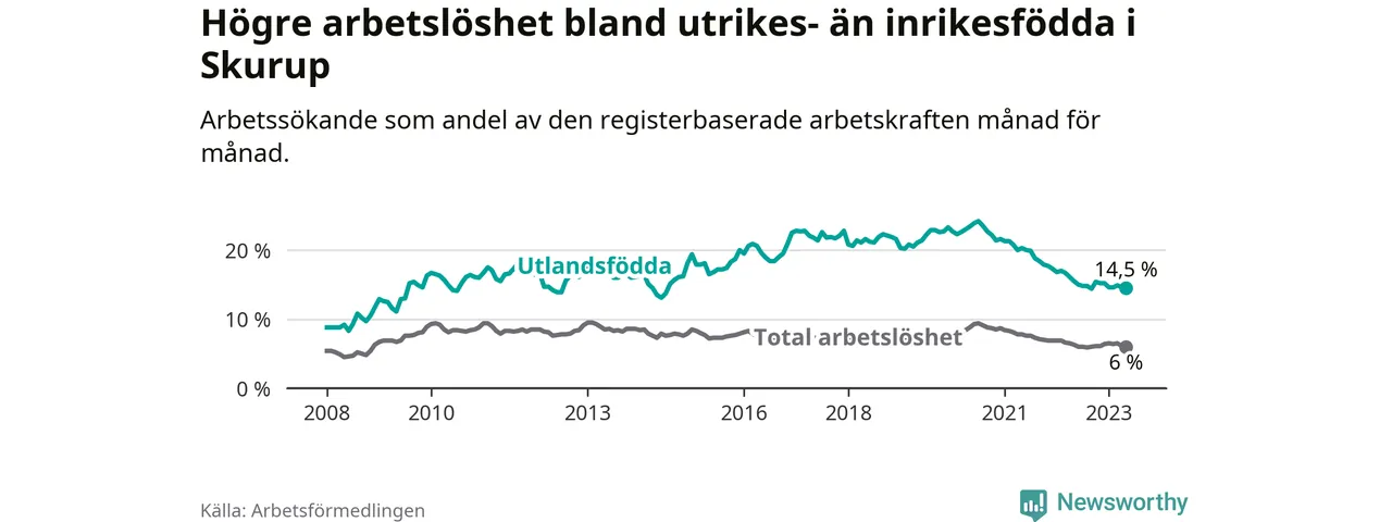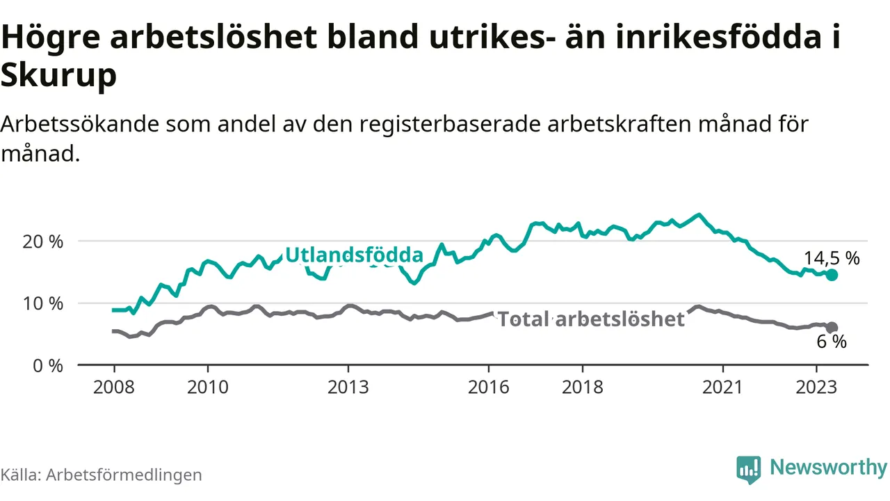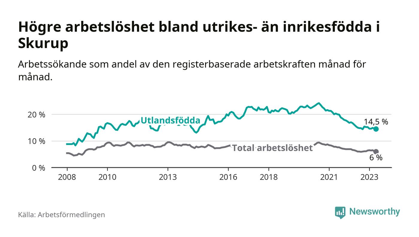 Skillnaden i arbetslöshet mellan utrikesfödda och hela befolkningen är 8,5 procentenheter i Skurup. Det är en mindre skillnad än för ett år sedan (−0,7 procentenheter).
