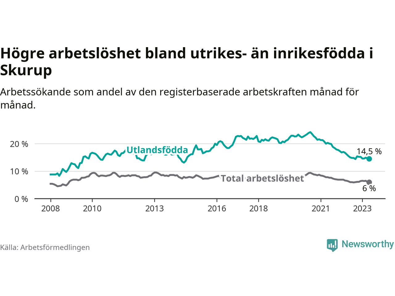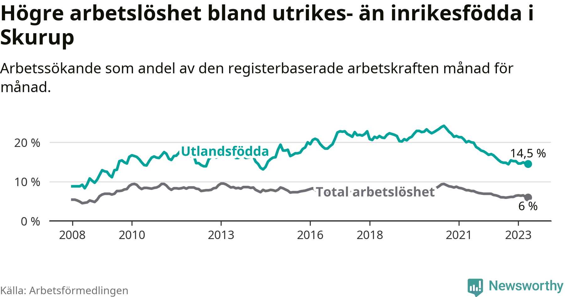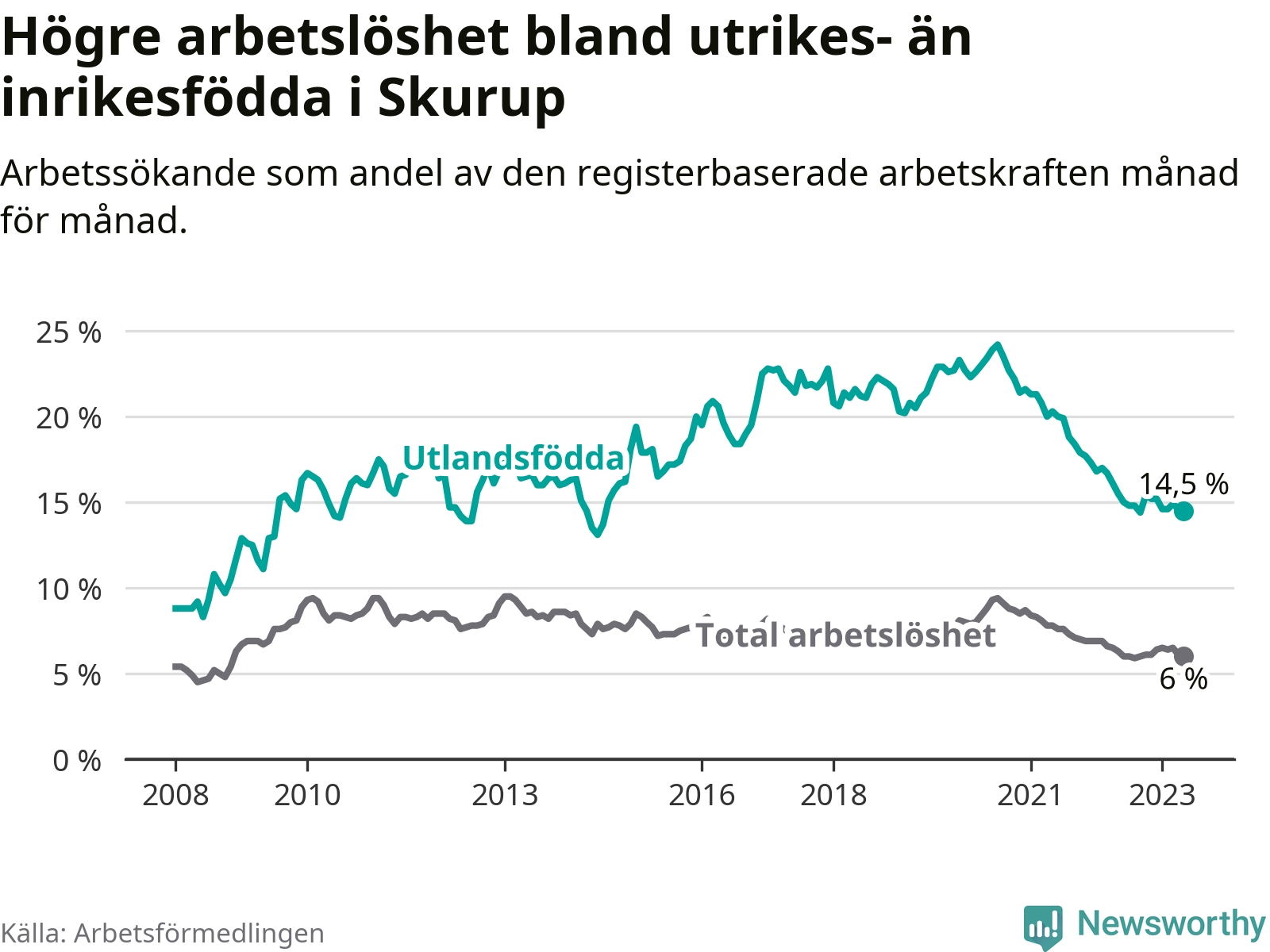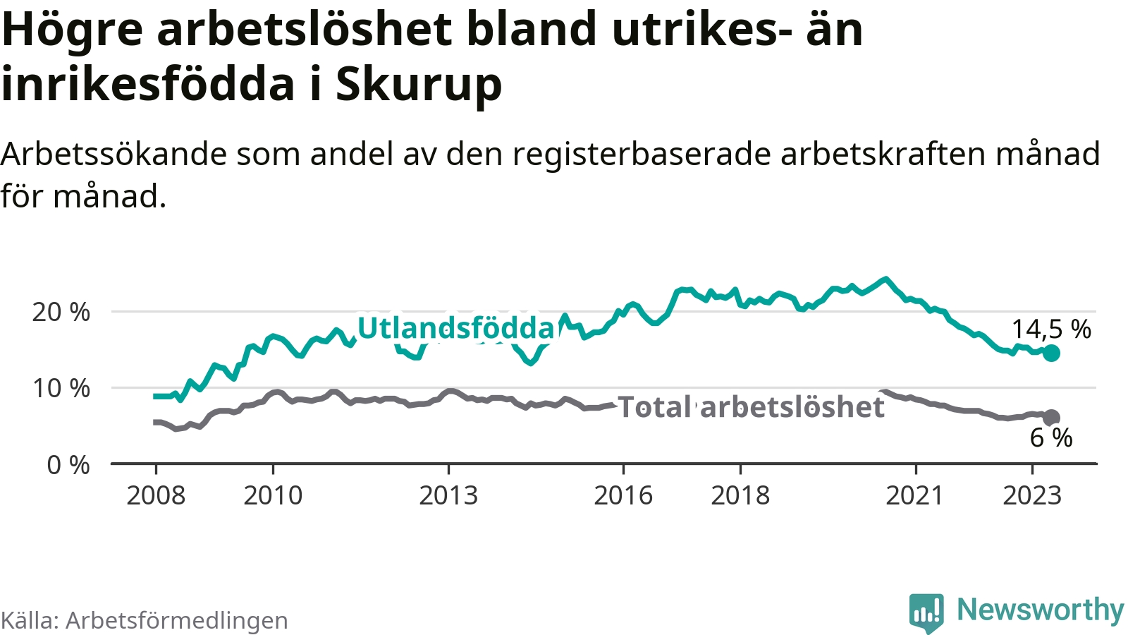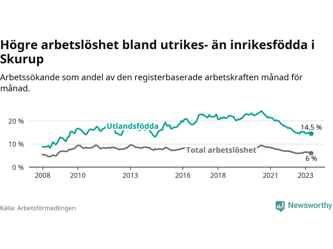 Skillnaden i arbetslöshet mellan utrikesfödda och hela befolkningen är 8,5 procentenheter i Skurup. Det är en mindre skillnad än för ett år sedan (−0,7 procentenheter).