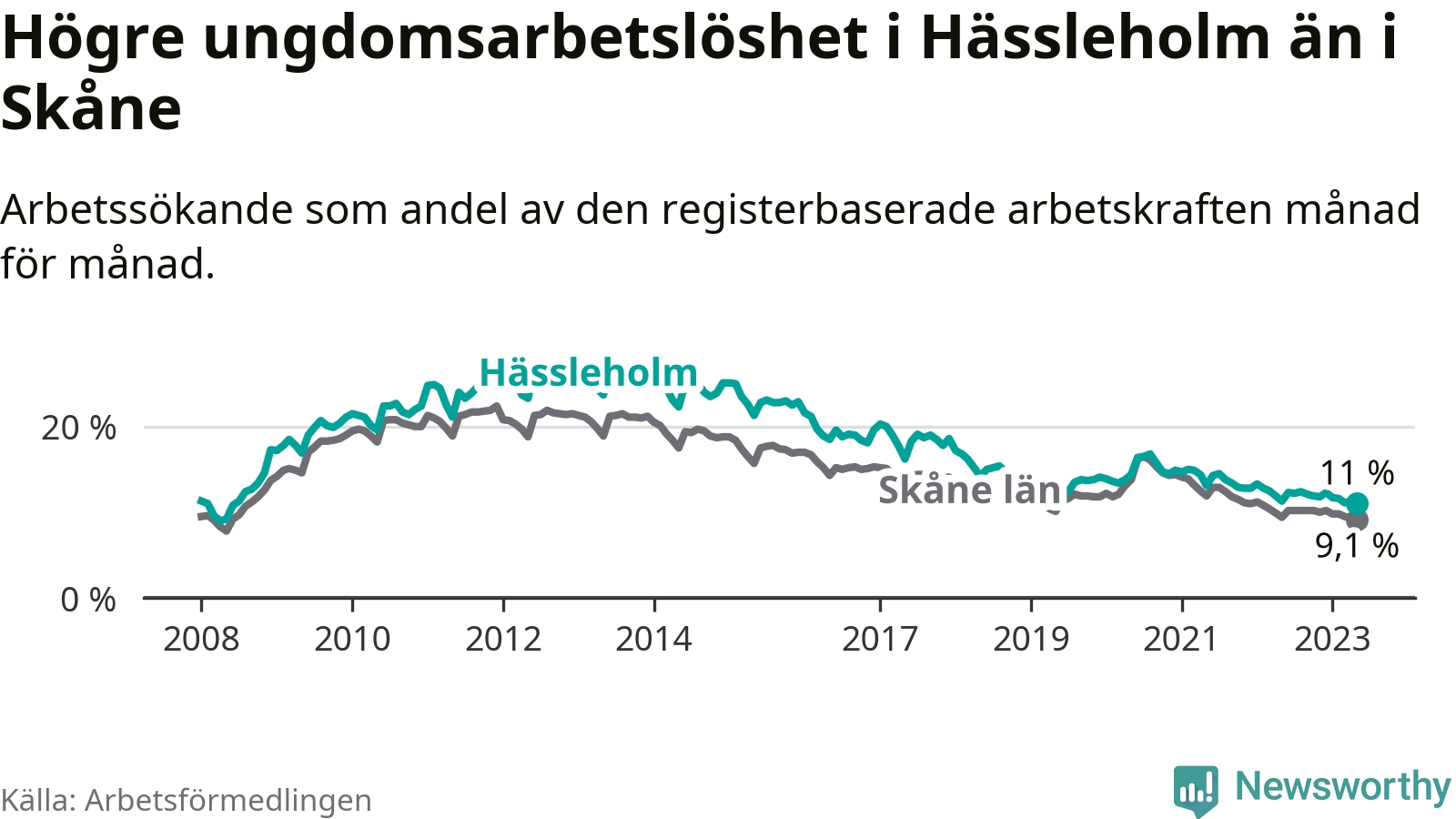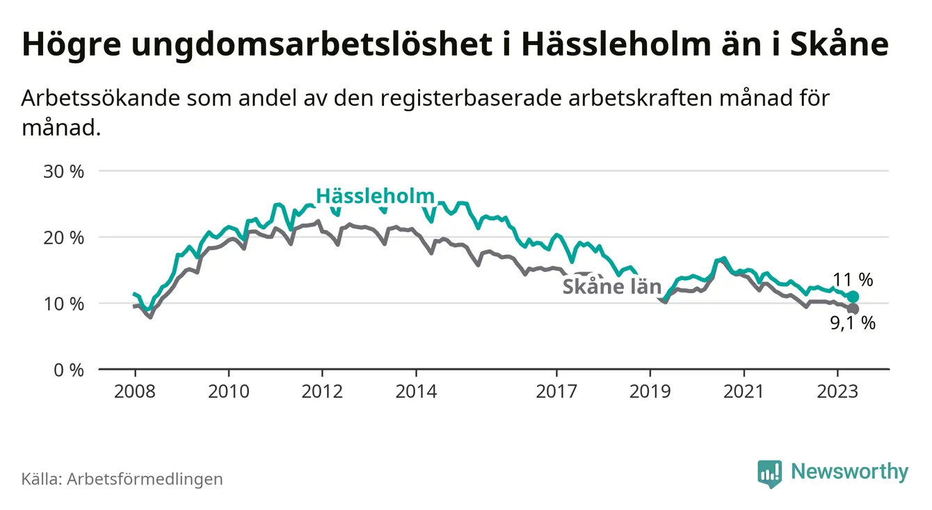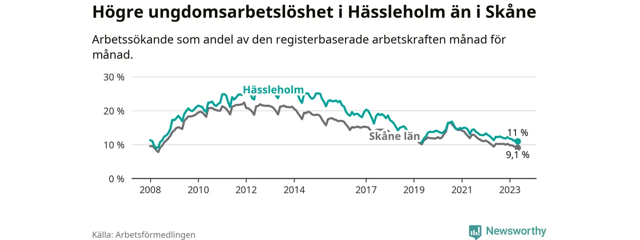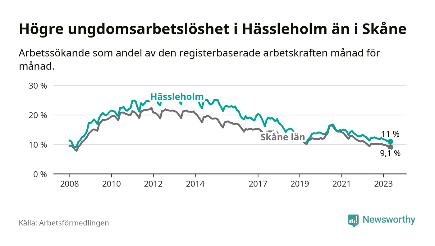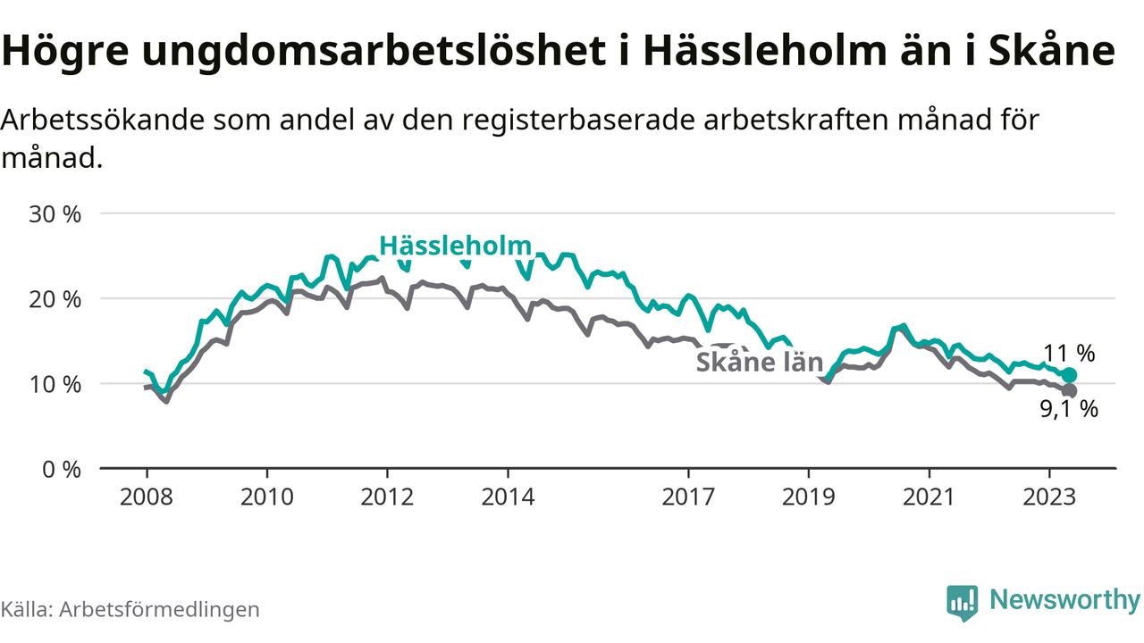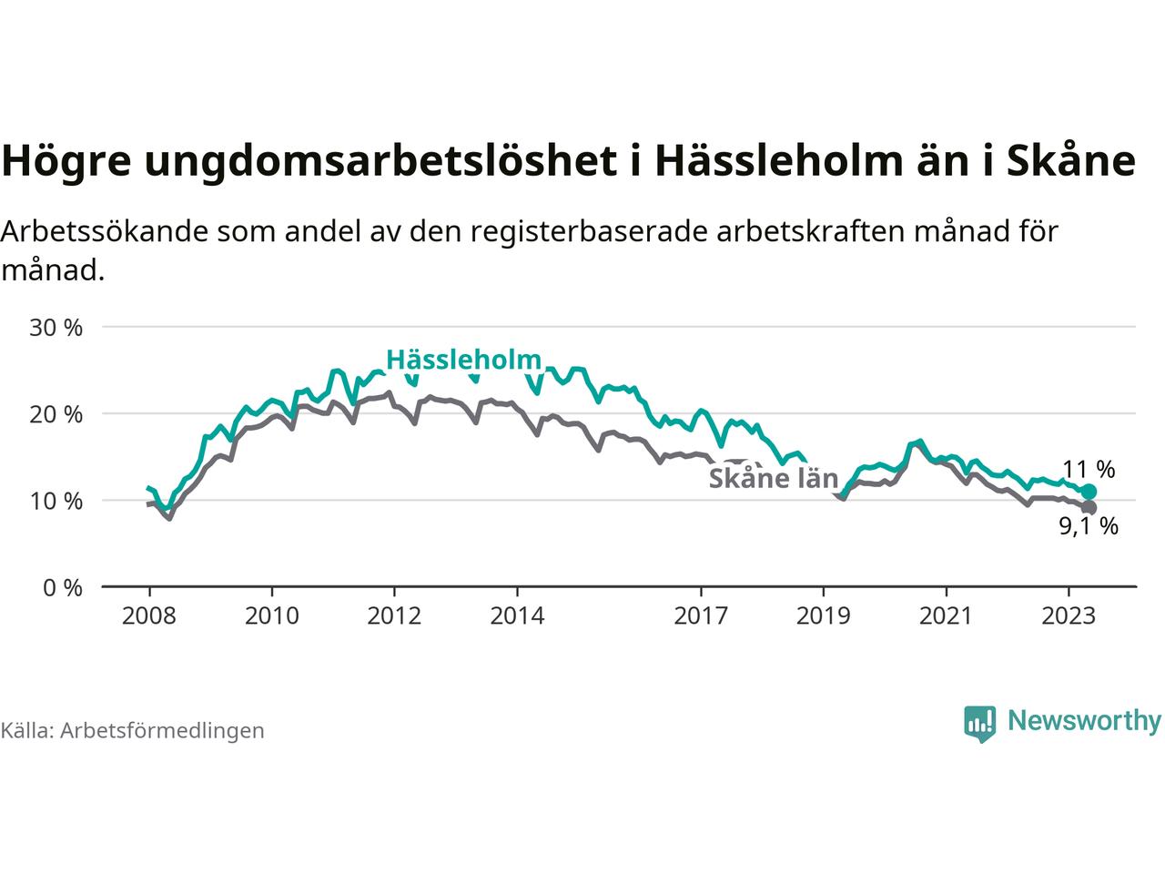 Precis som den totala arbetslösheten ligger ungdomsarbetslösheten i Hässleholm högre än i Skåne som helhet. Skillnaden mellan kommunen och länet är 1,9 procentenheter.