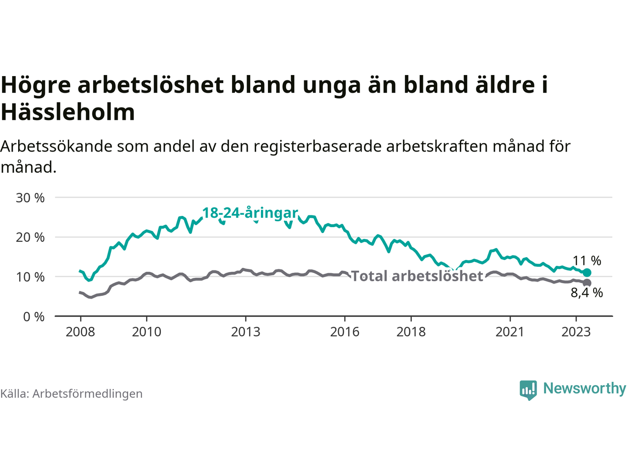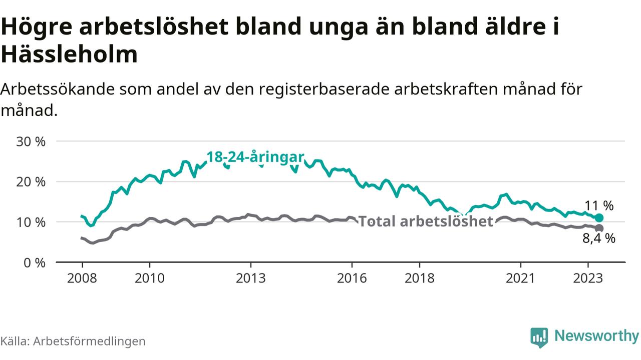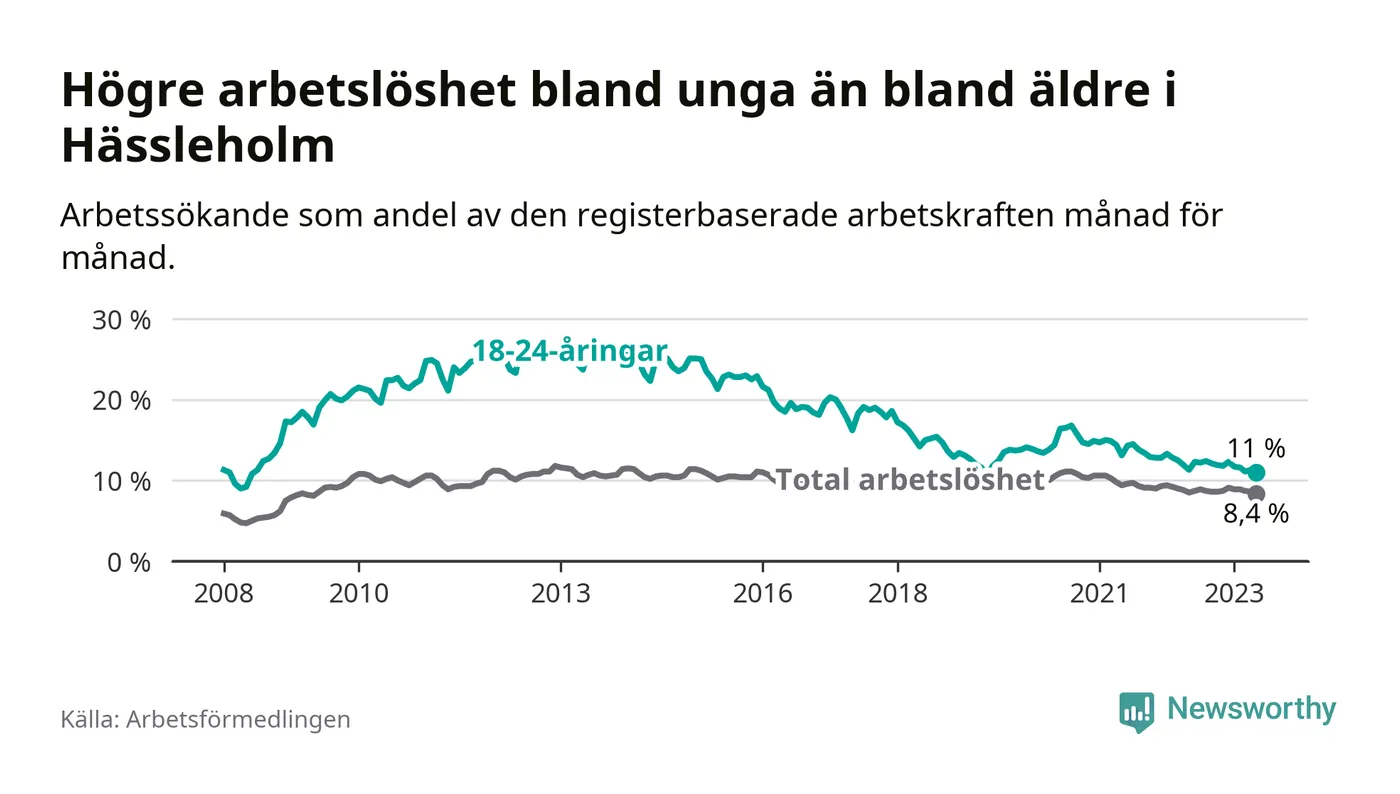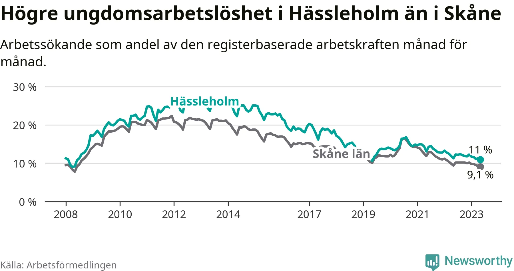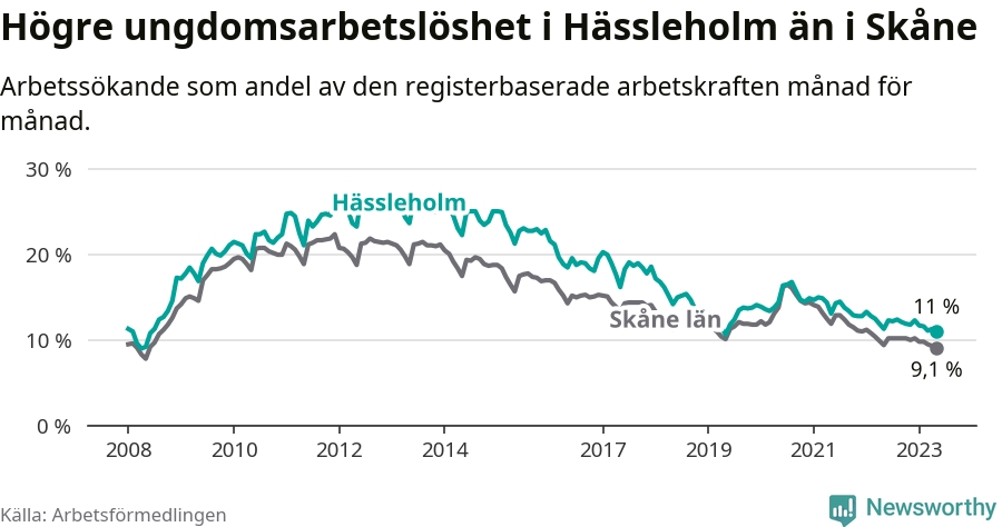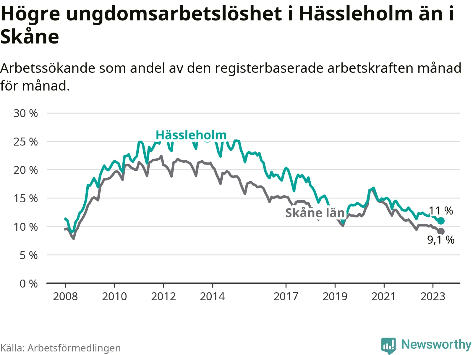 Precis som den totala arbetslösheten ligger ungdomsarbetslösheten i Hässleholm högre än i Skåne som helhet. Skillnaden mellan kommunen och länet är 1,9 procentenheter.