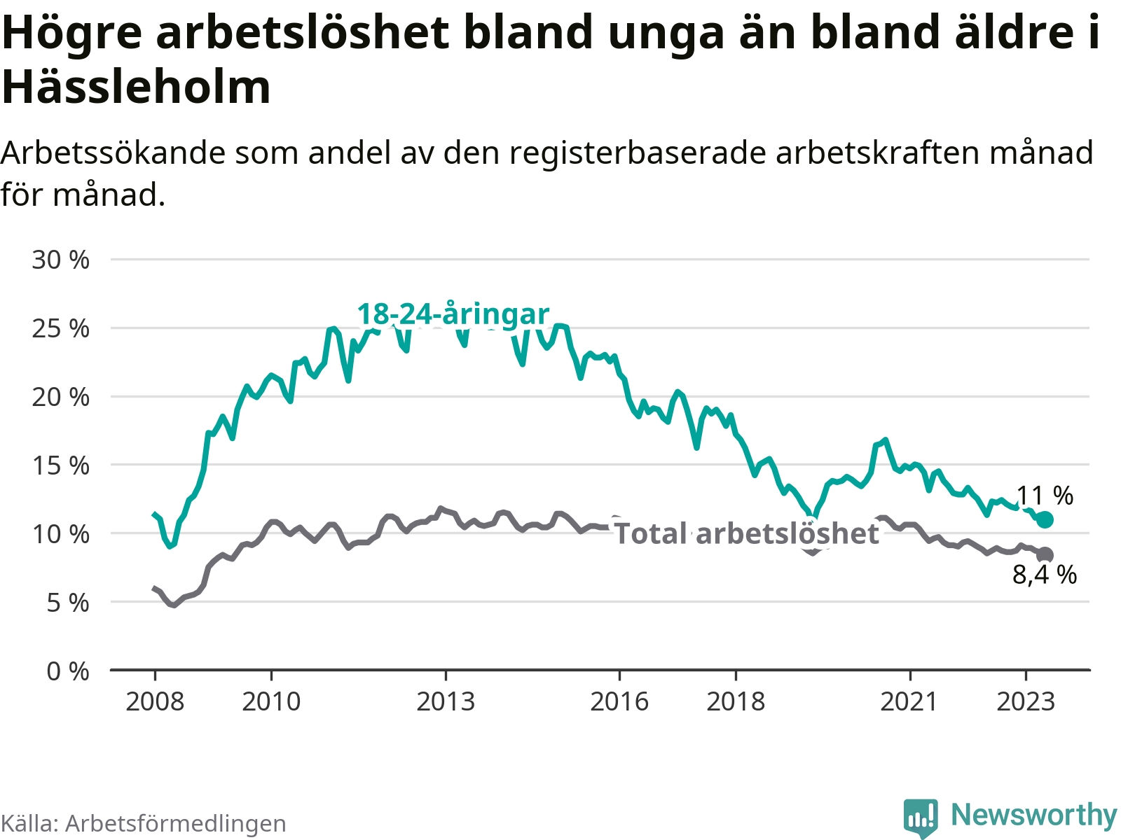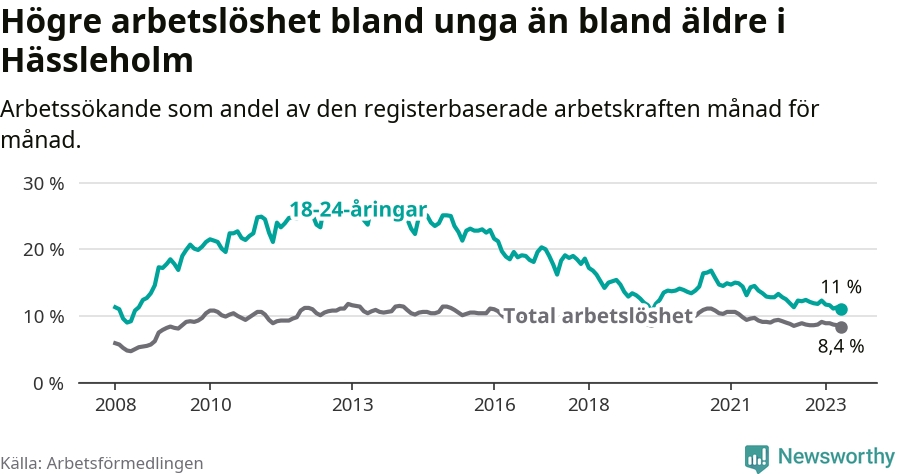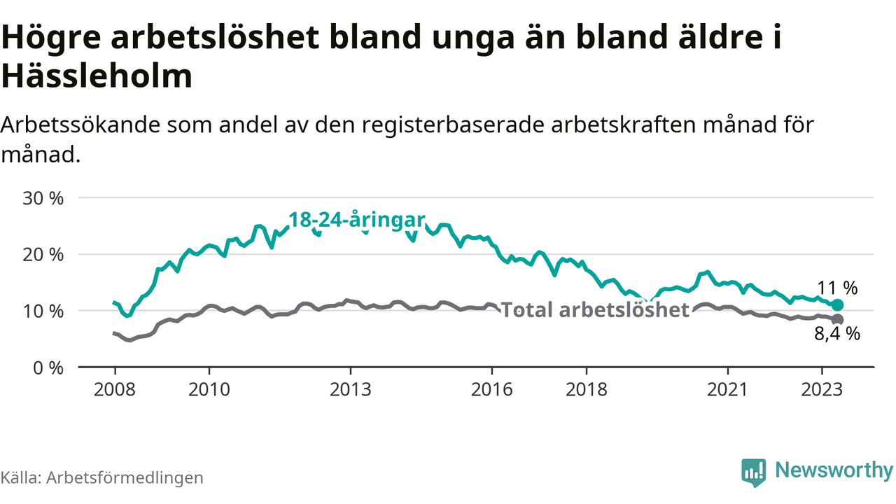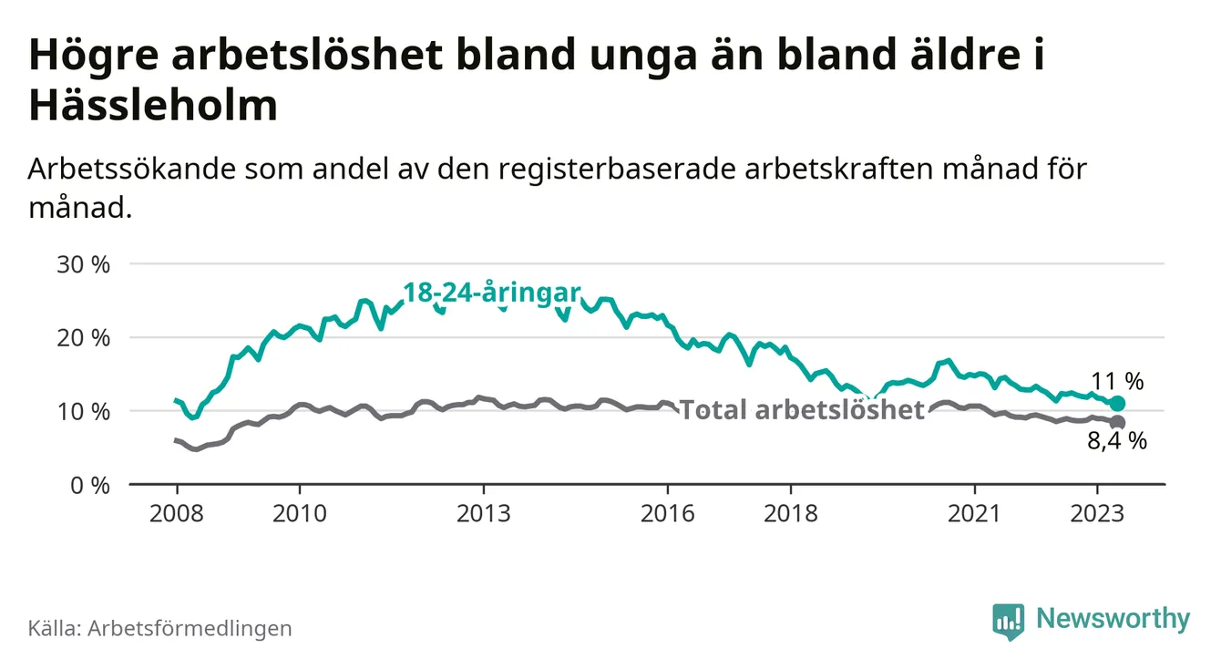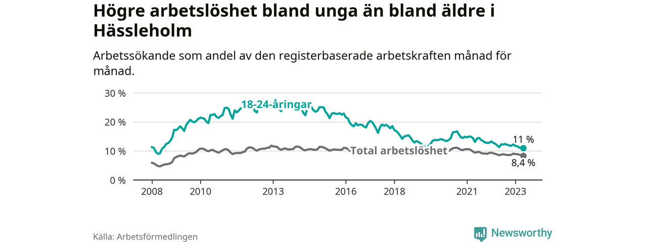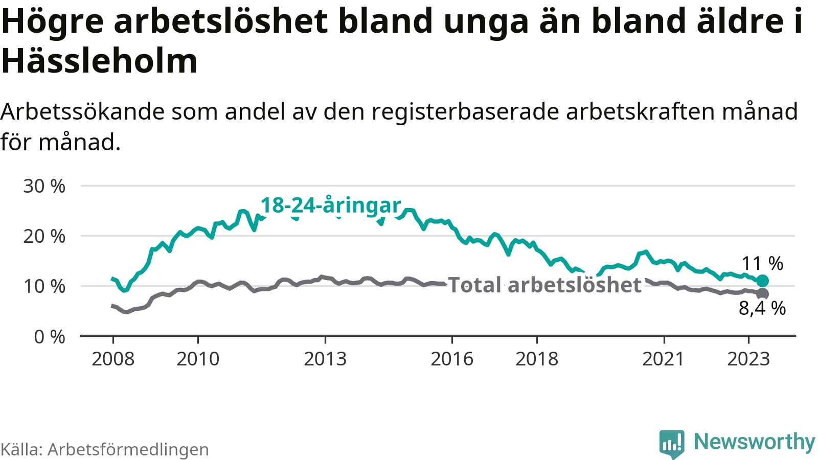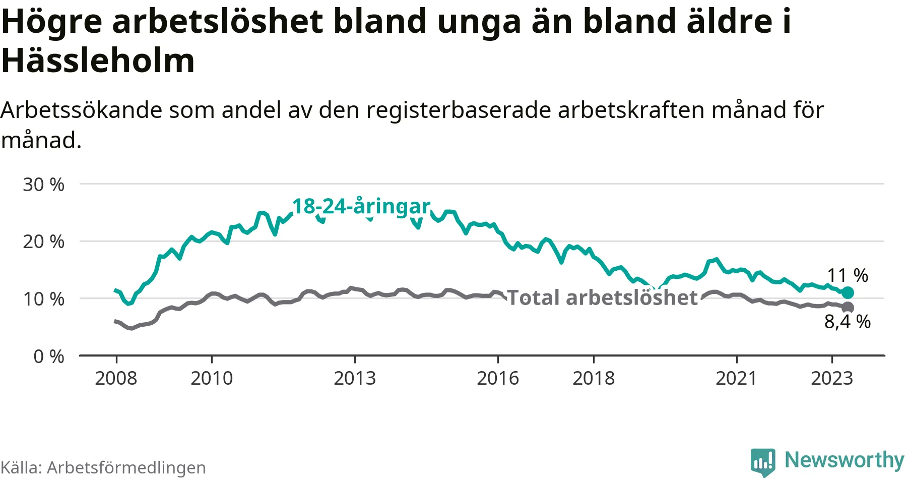 Precis som den totala arbetslösheten ligger ungdomsarbetslösheten i Hässleholm högre än i Skåne som helhet. Skillnaden mellan kommunen och länet är 1,9 procentenheter.