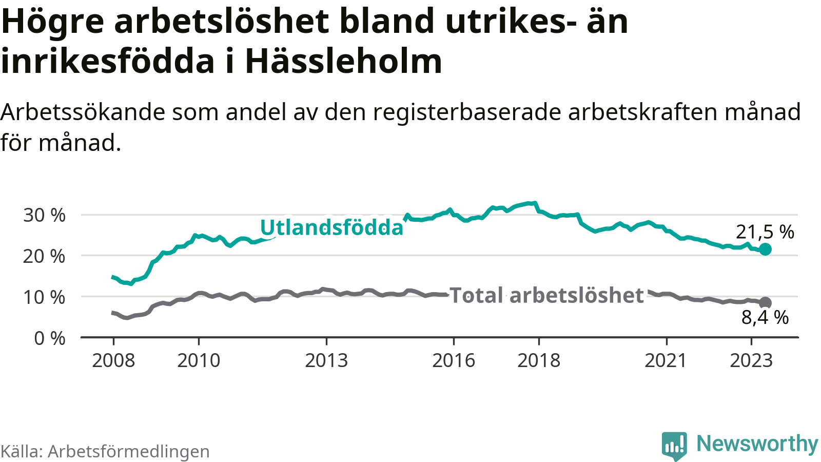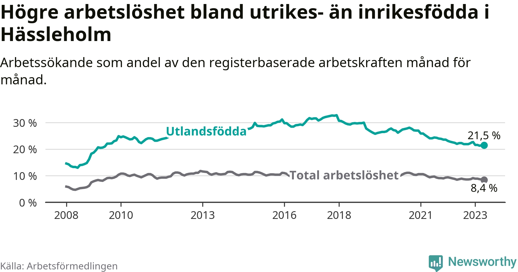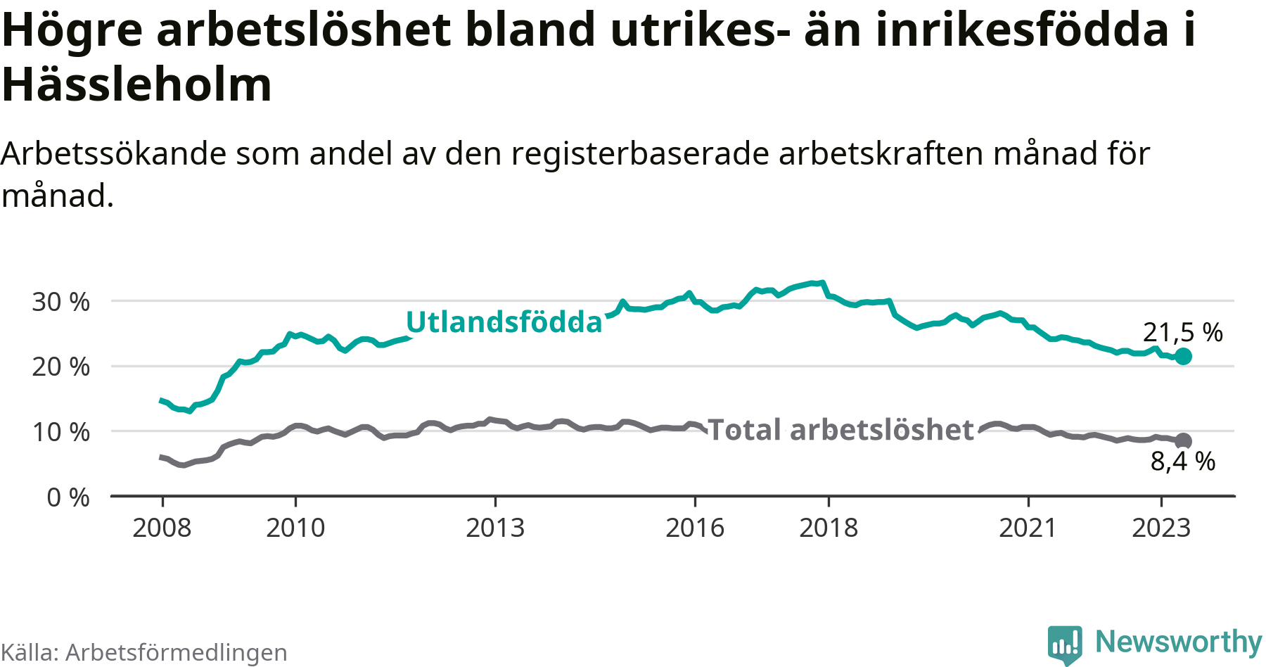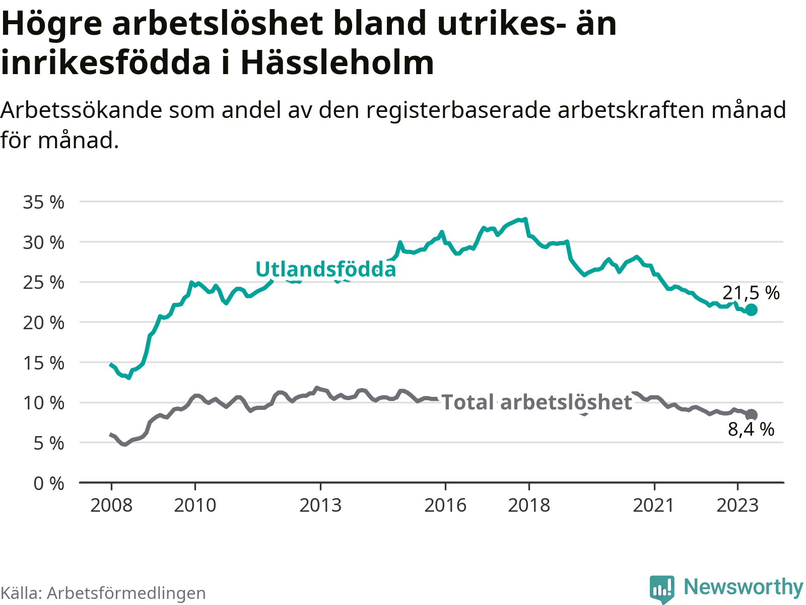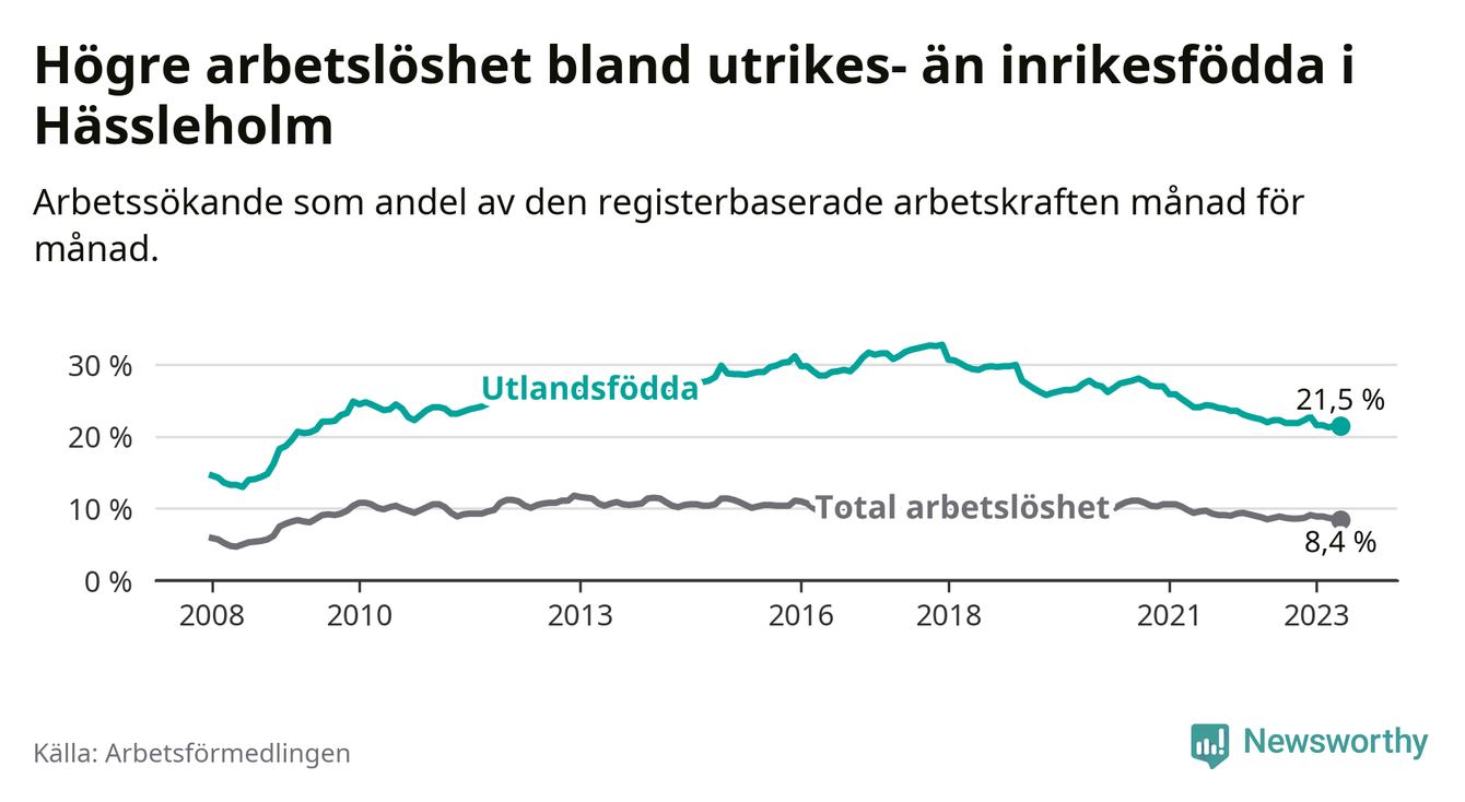Arbetslösheten bland utlandsfödda var 21,5 procent i Hässleholm under maj månad, motsvarande 1 139 av 5 298 personer. Det är 0,5 procentenheter färre än vid samma tidpunkt i fjol (+56 om man räknar personer). Därmed har de utlandsföddas arbetslöshet varit lägre än vid samma tidpunkt i fjol i över två år i sträck. Sedan oktober 2020 har arbetslösheten bland utlandsfödda minskat från 27,1 till 21,5 procent.