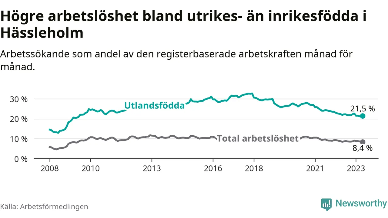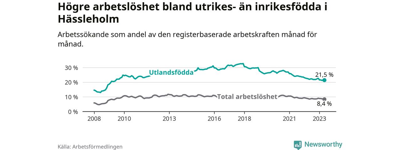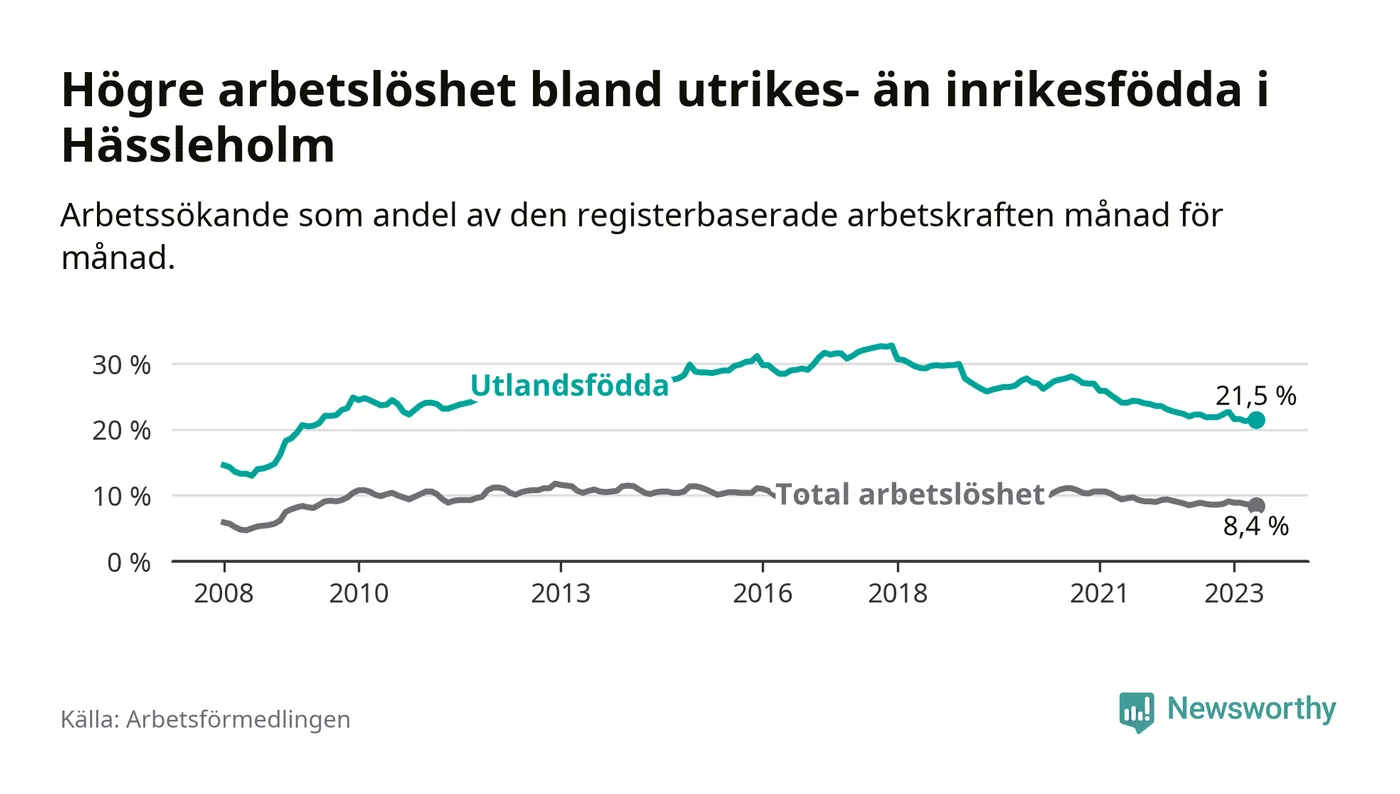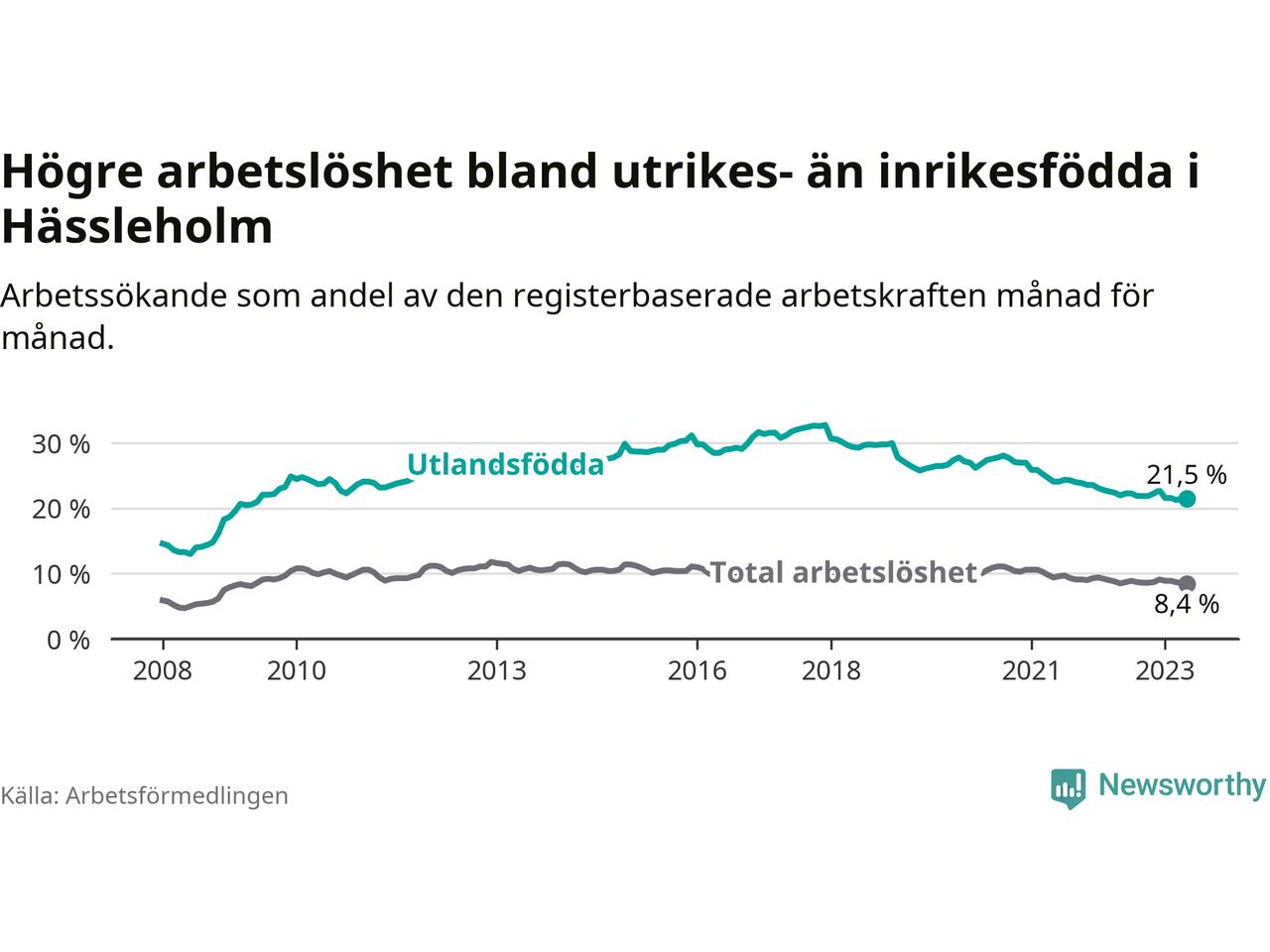 Skillnaden i arbetslöshet mellan utrikesfödda och hela befolkningen är 13,1 procentenheter i Hässleholm.