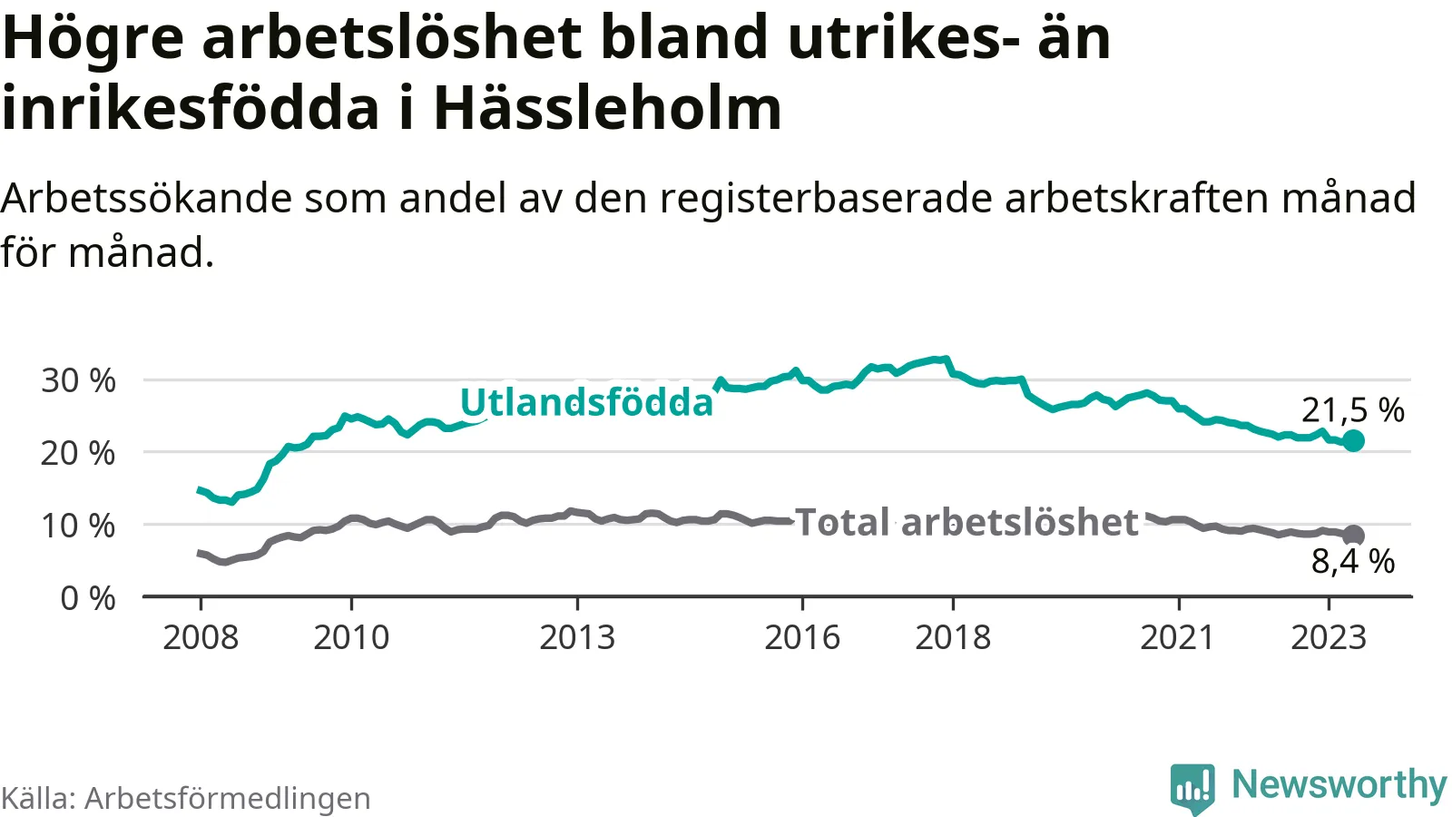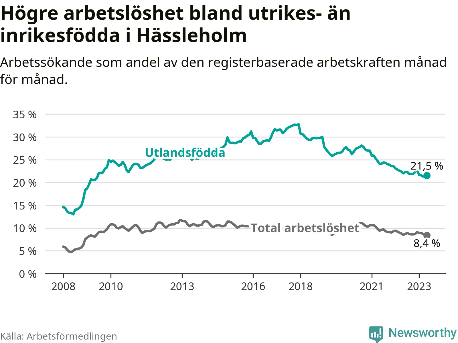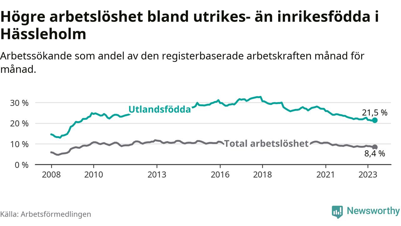 Skillnaden i arbetslöshet mellan utrikesfödda och hela befolkningen är 13,1 procentenheter i Hässleholm.
