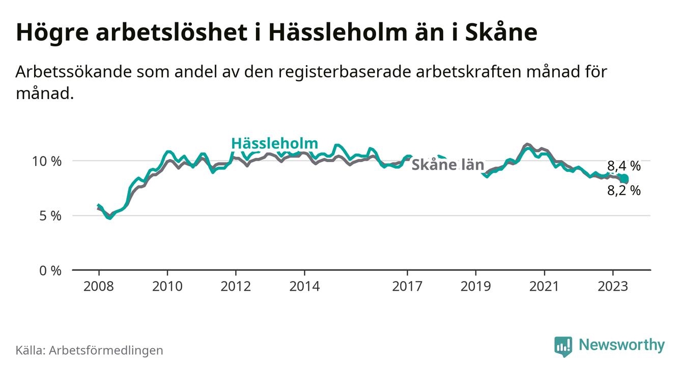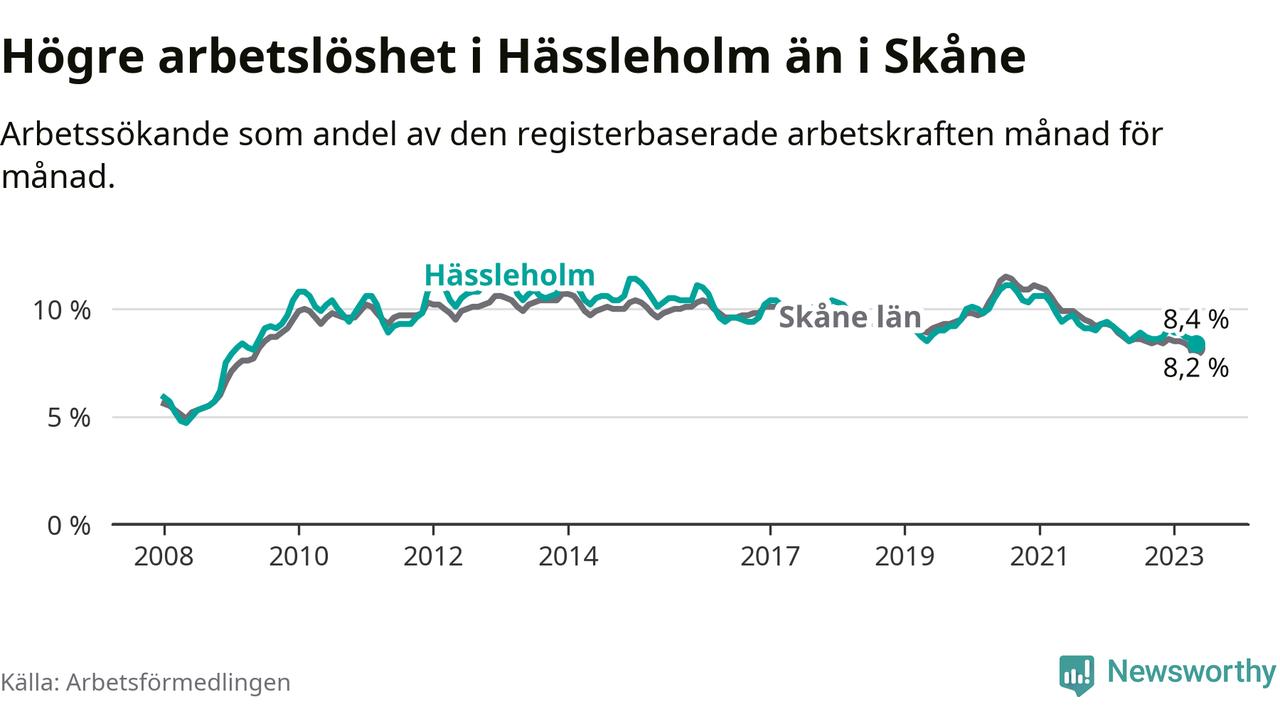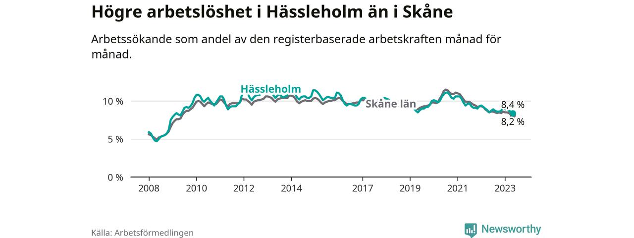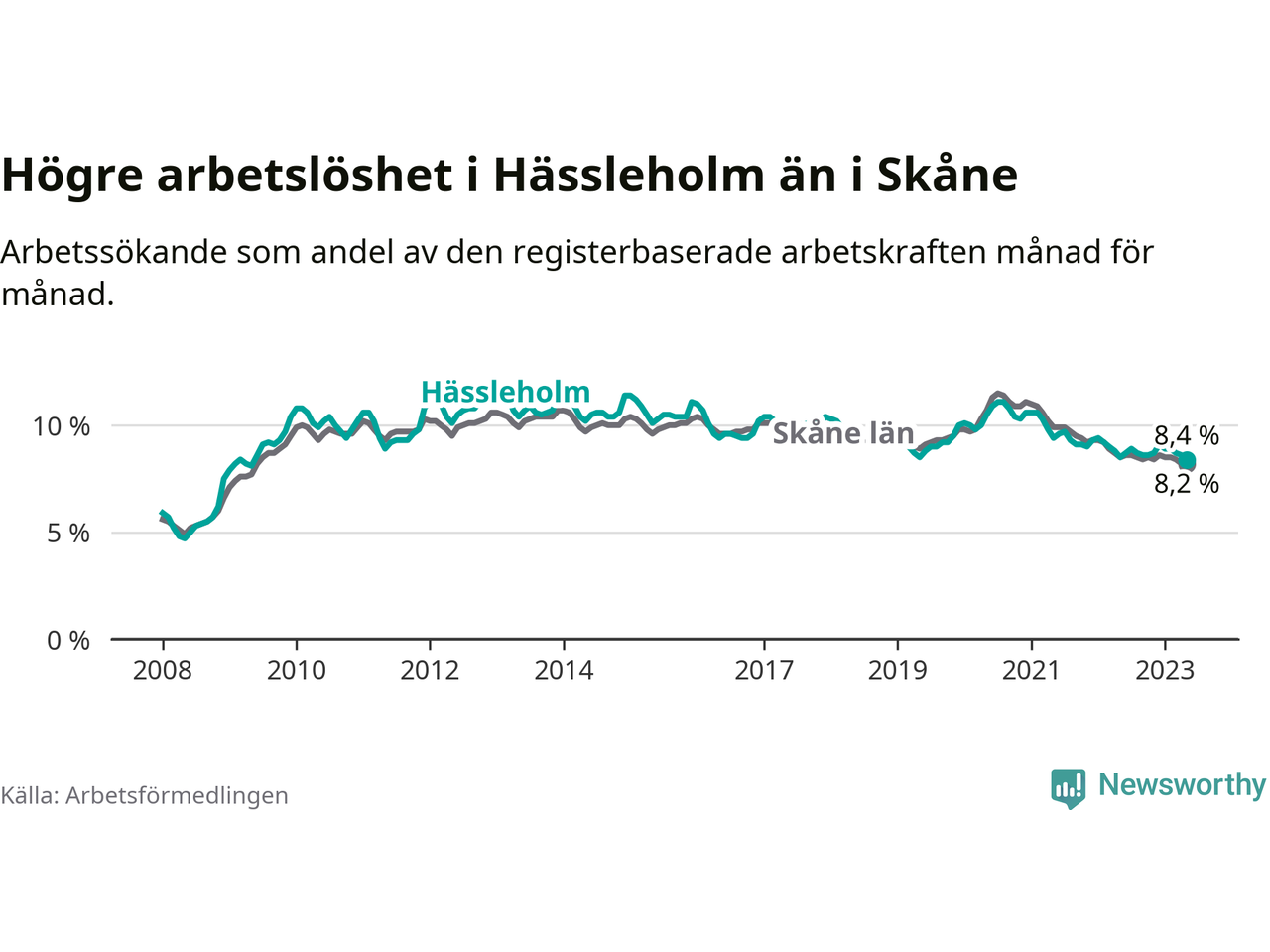 Även om arbetslösheten i Hässleholm alltså minskar, så ligger den fortfarande över snittet i hela Skåne län (8,4 procent i kommunen, jämfört med 8,2 procent i hela länet). Lomma har den lägsta arbetslösheten i länet (3,1 procent), medan Perstorp har den högsta (11,8 procent). För att Hässleholm skulle komma ner i samma arbetslöshetsnivå som Lomma skulle 1 333 personer behöva sysselsättas.