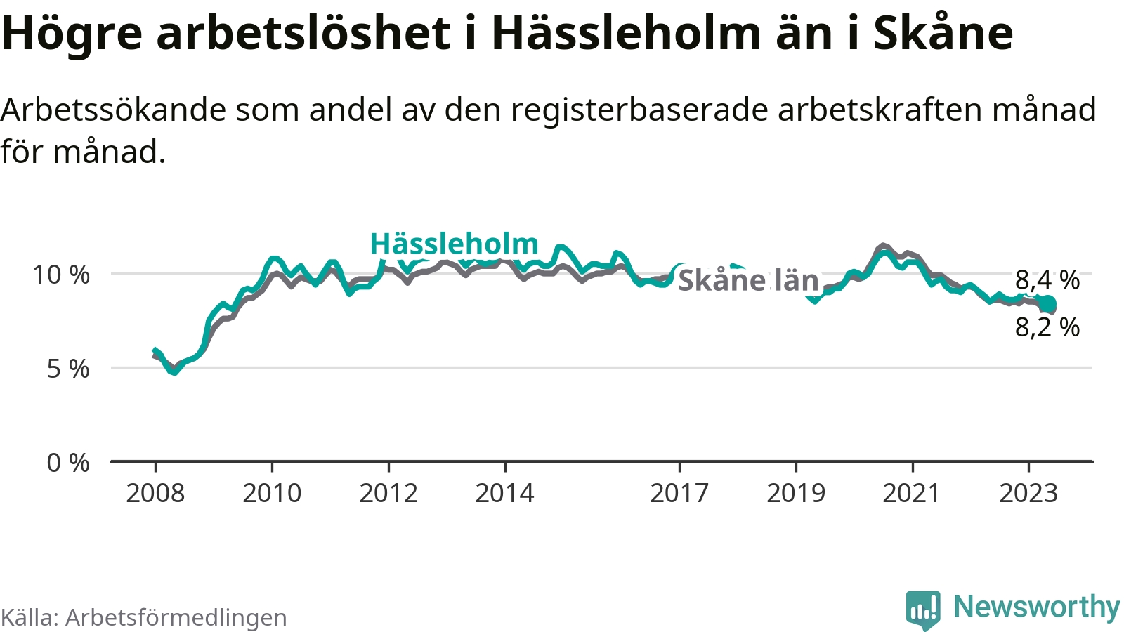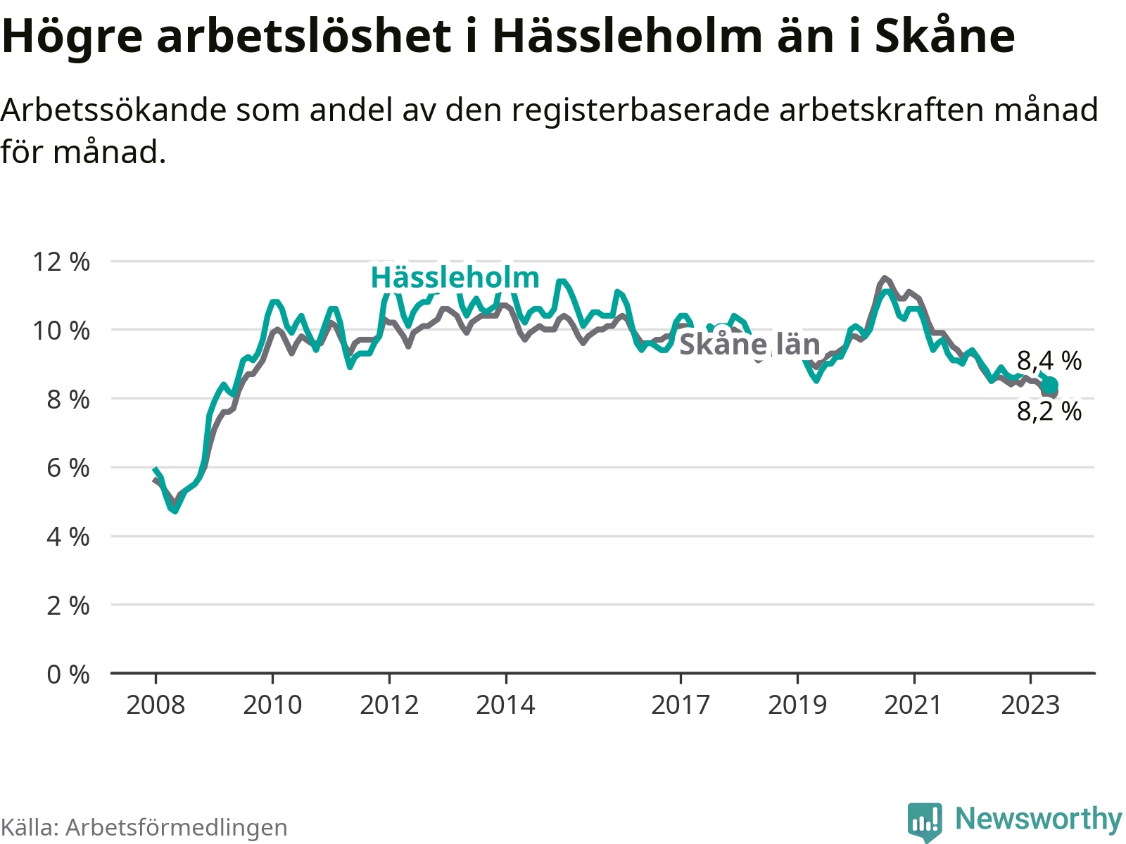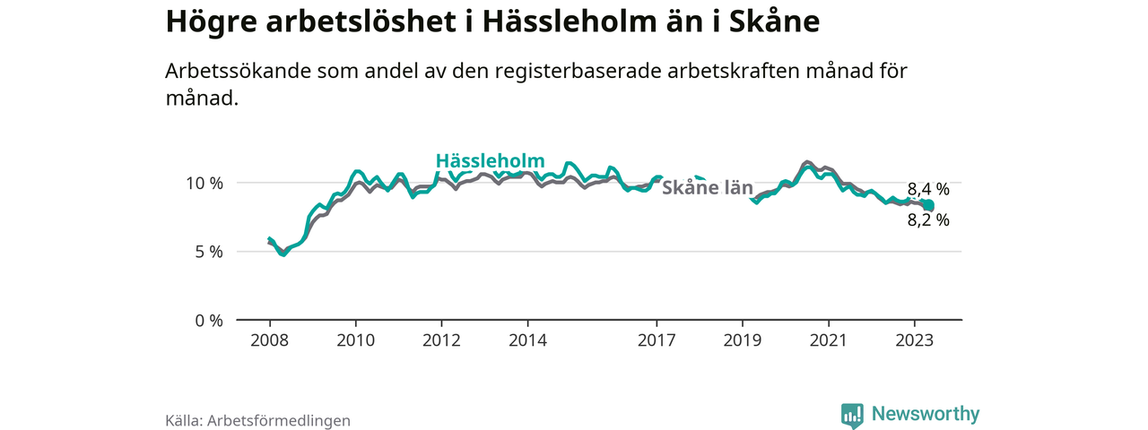 Även om arbetslösheten i Hässleholm alltså minskar, så ligger den fortfarande över snittet i hela Skåne län (8,4 procent i kommunen, jämfört med 8,2 procent i hela länet). Lomma har den lägsta arbetslösheten i länet (3,1 procent), medan Perstorp har den högsta (11,8 procent). För att Hässleholm skulle komma ner i samma arbetslöshetsnivå som Lomma skulle 1 333 personer behöva sysselsättas.