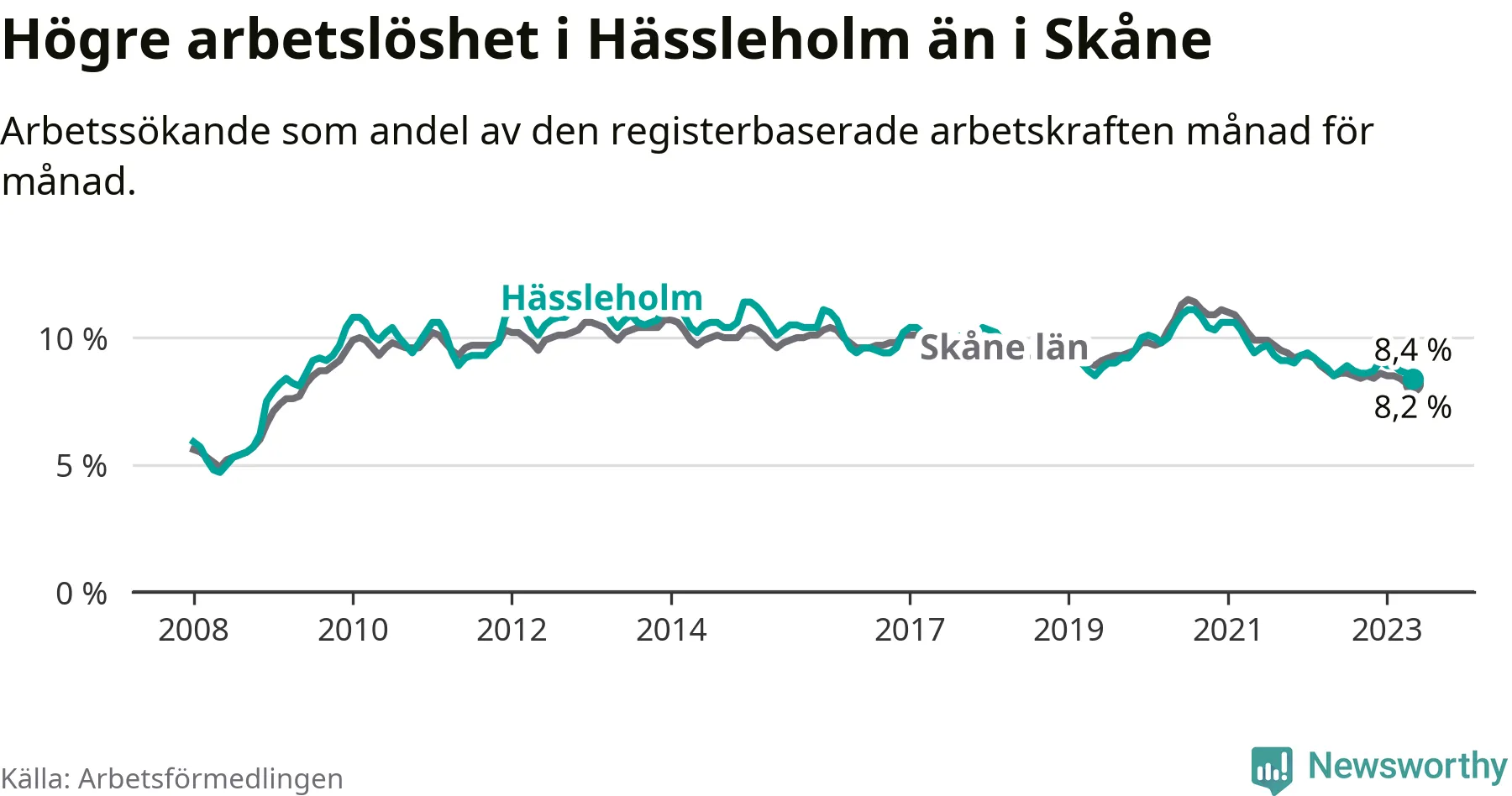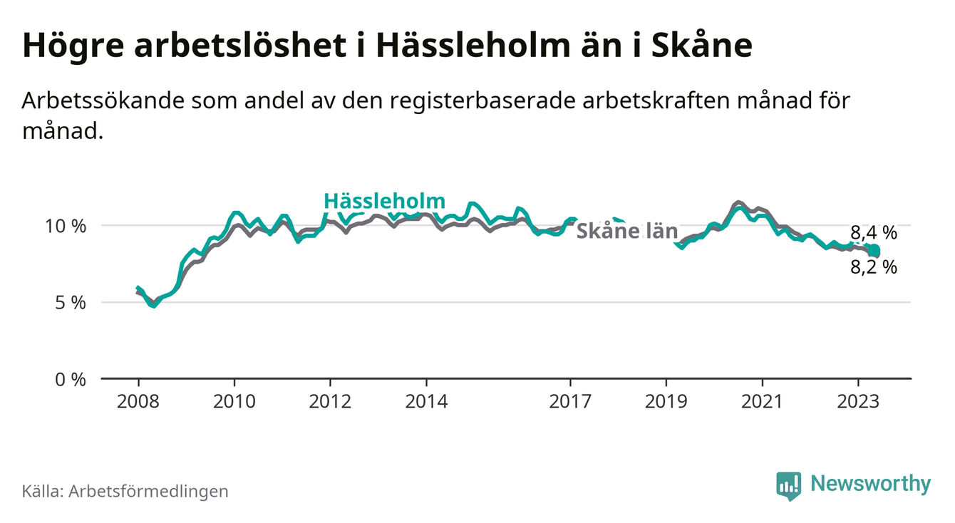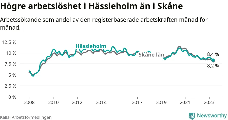 Det är 26:e månaden i följd som arbetslösheten i Hässleholm är lägre än den var under samma tidpunkt året innan. Sedan mars 2021 har arbetslösheten gått ner från 10,3 till 8,4 procent. Den nuvarande arbetslöshetsnivån är därmed den lägsta sedan maj 2009.