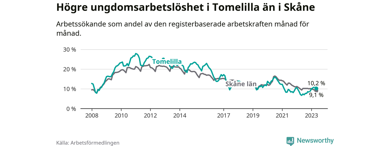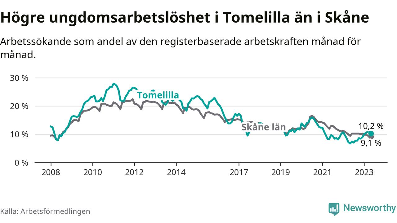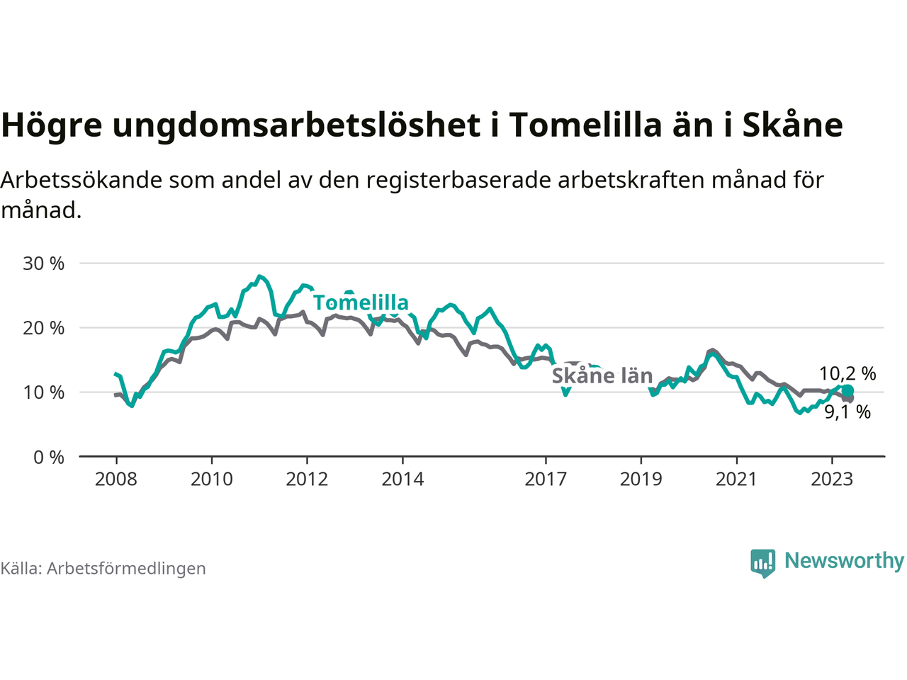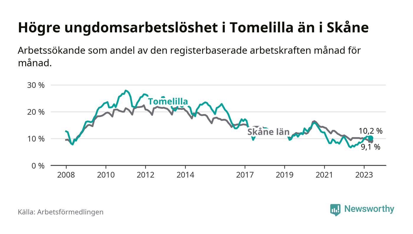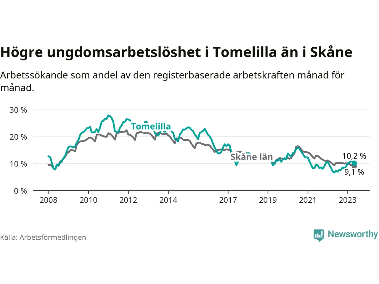 Medan Tomelilla har lägre total arbetslöshet än Skåne, ligger ungdomsarbetslösheten 1,1 procentenheter högre i Tomelilla.