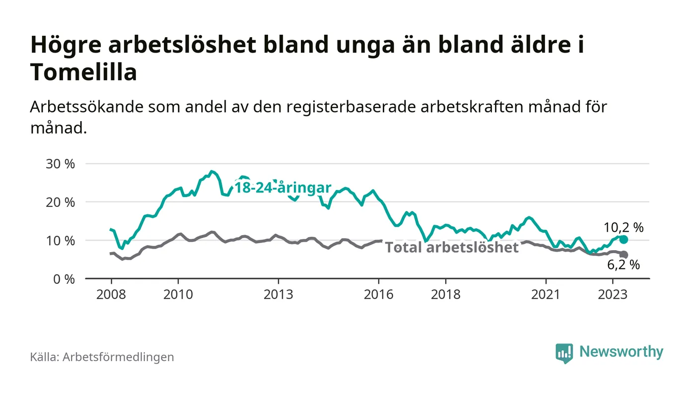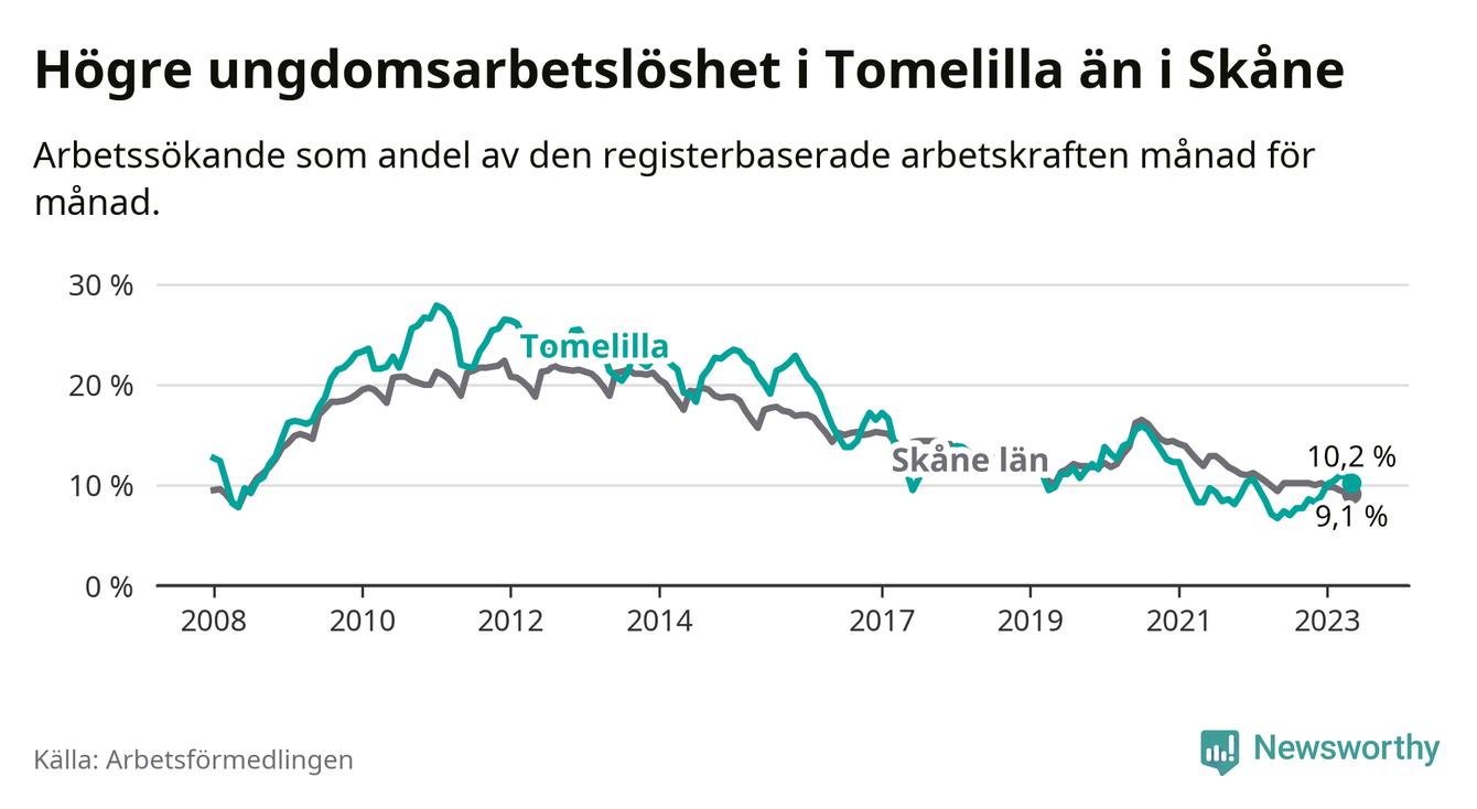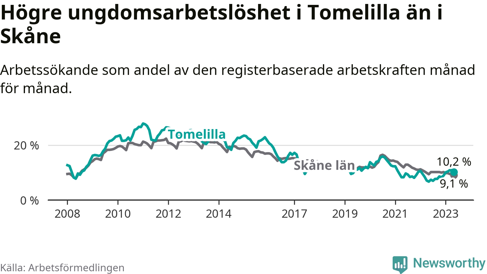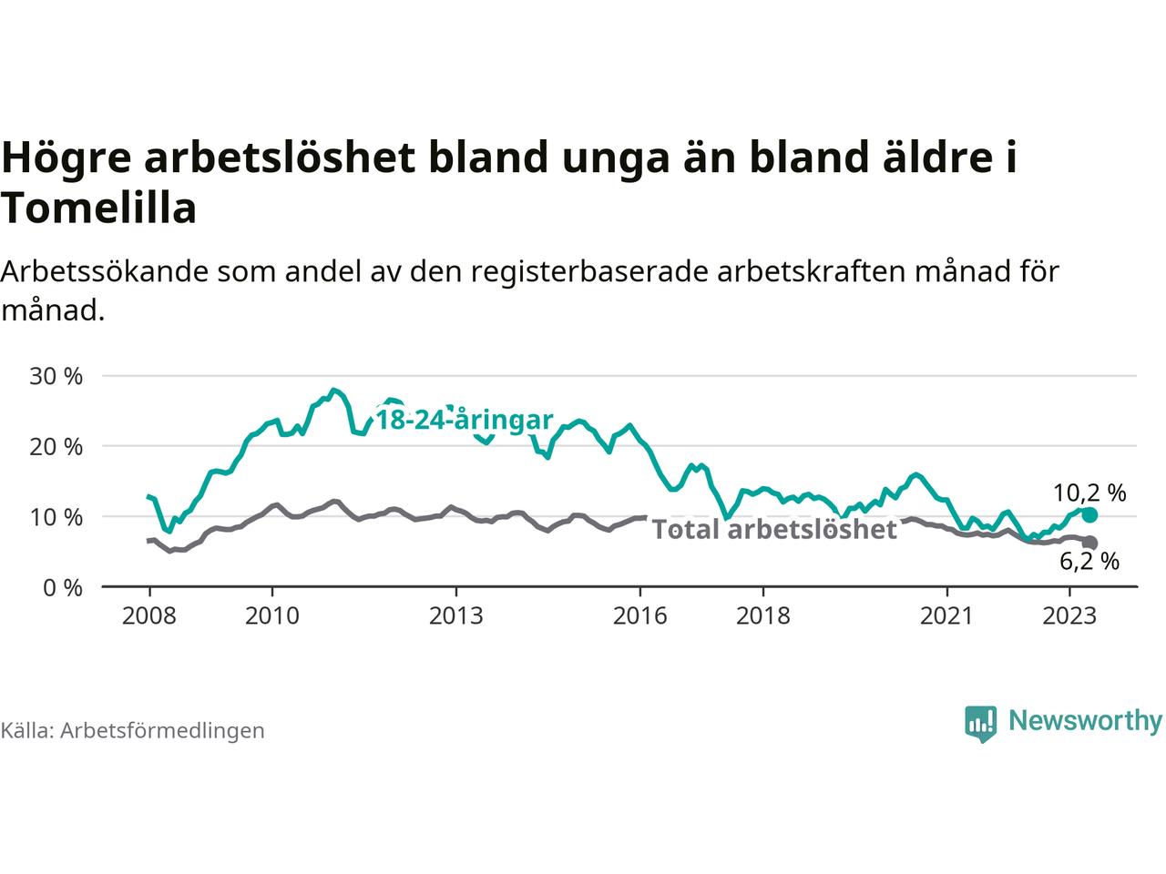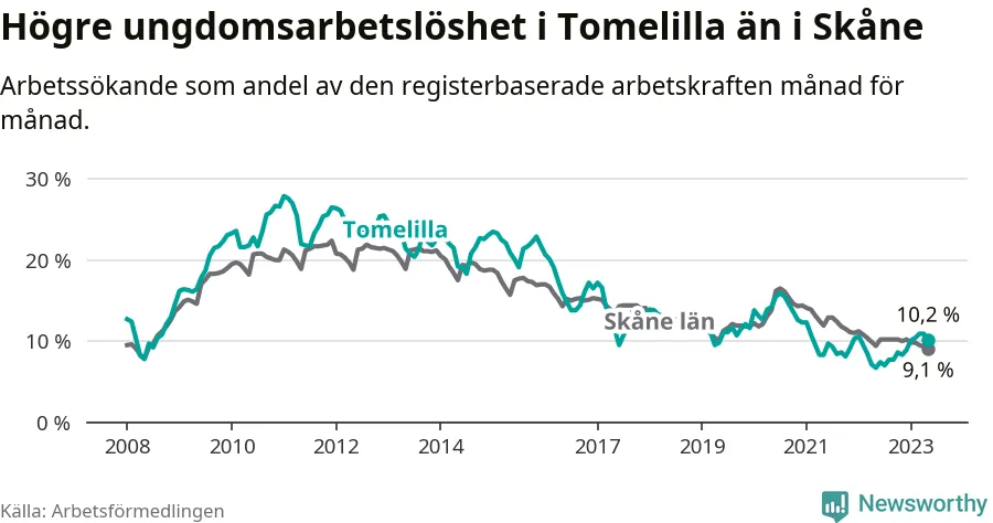 Medan Tomelilla har lägre total arbetslöshet än Skåne, ligger ungdomsarbetslösheten 1,1 procentenheter högre i Tomelilla.