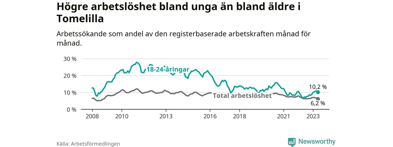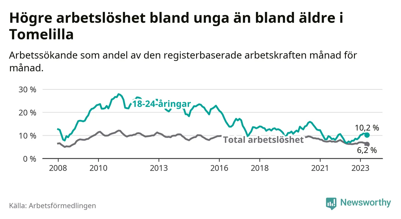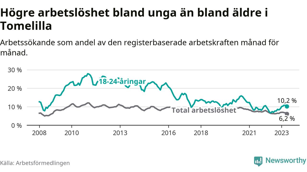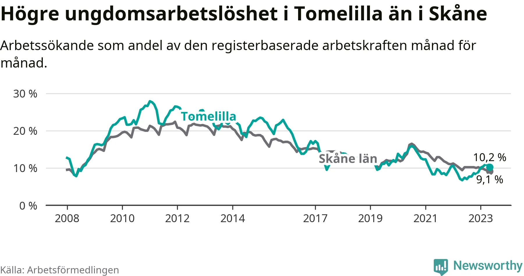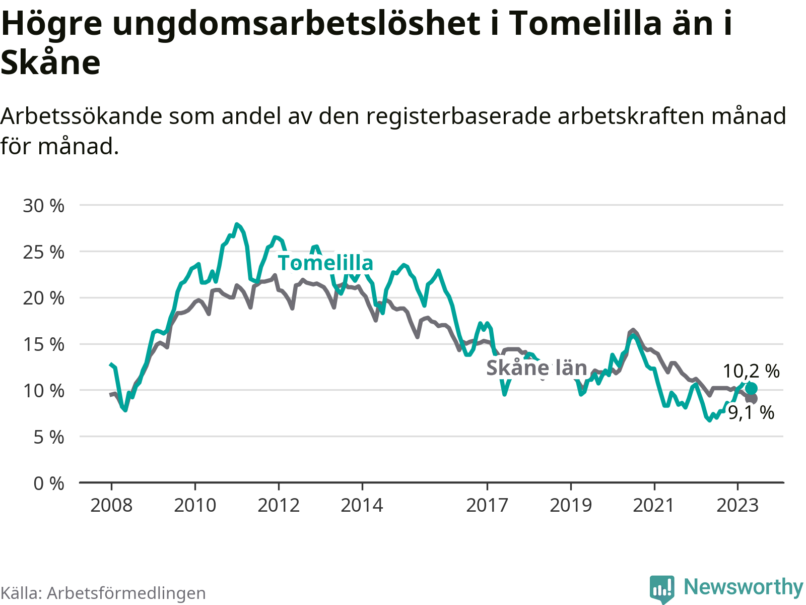 Medan Tomelilla har lägre total arbetslöshet än Skåne, ligger ungdomsarbetslösheten 1,1 procentenheter högre i Tomelilla.