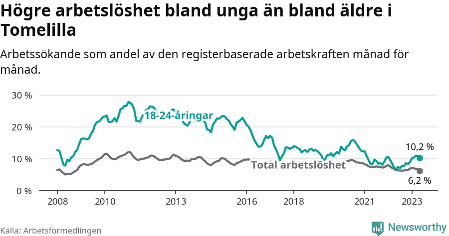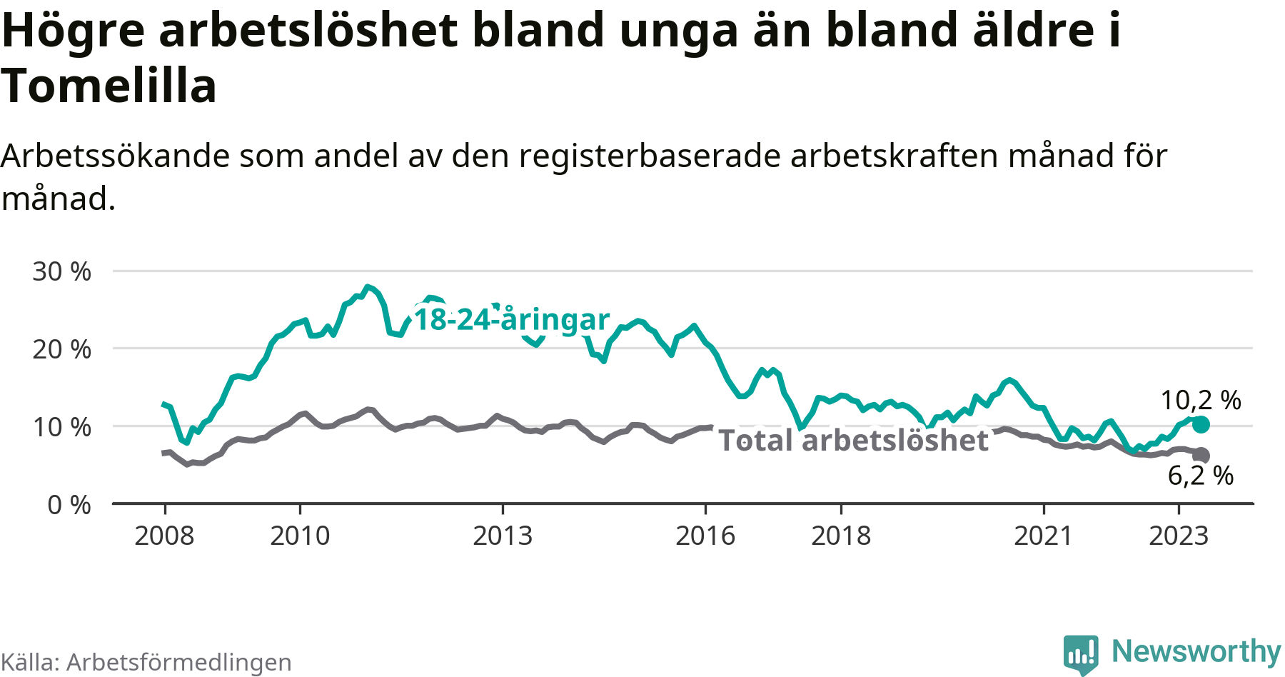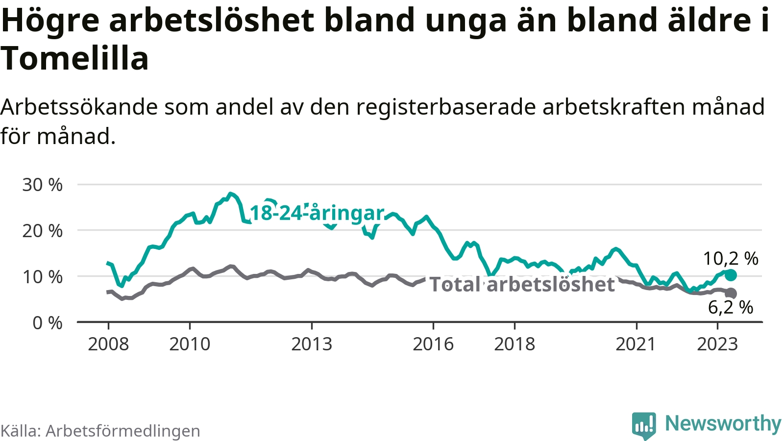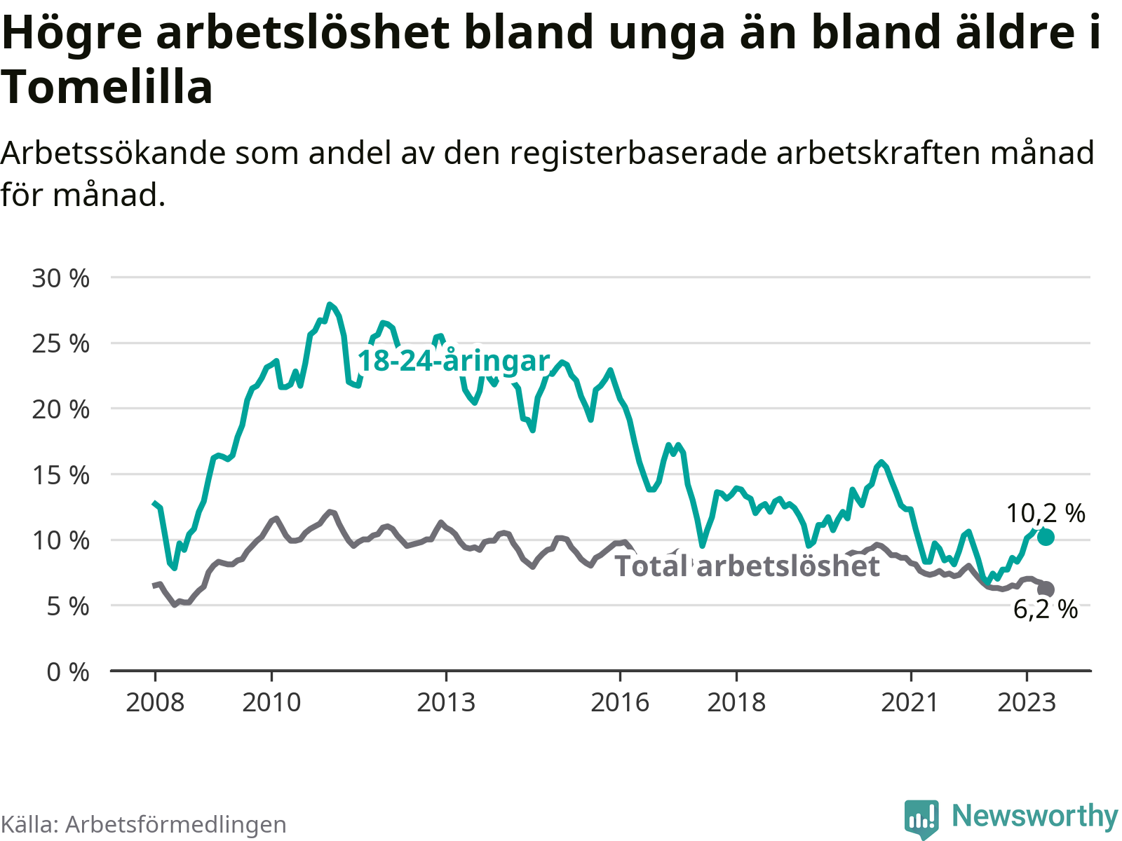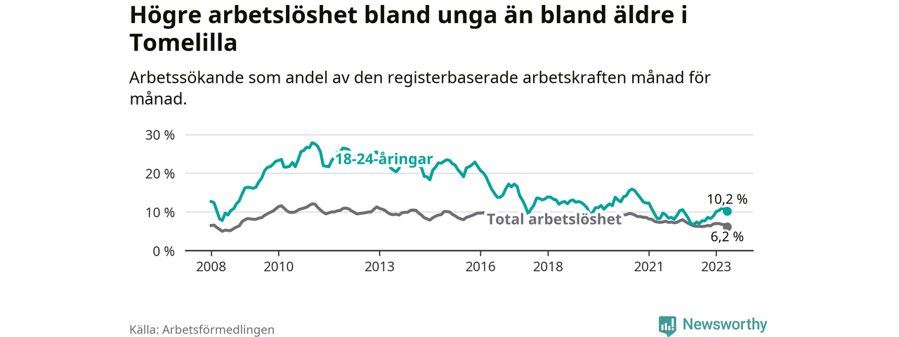 Medan Tomelilla har lägre total arbetslöshet än Skåne, ligger ungdomsarbetslösheten 1,1 procentenheter högre i Tomelilla.
