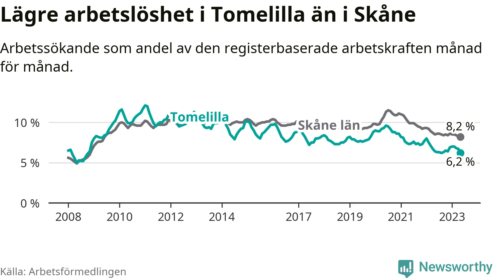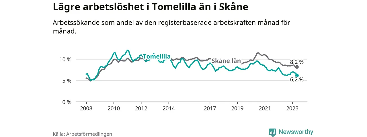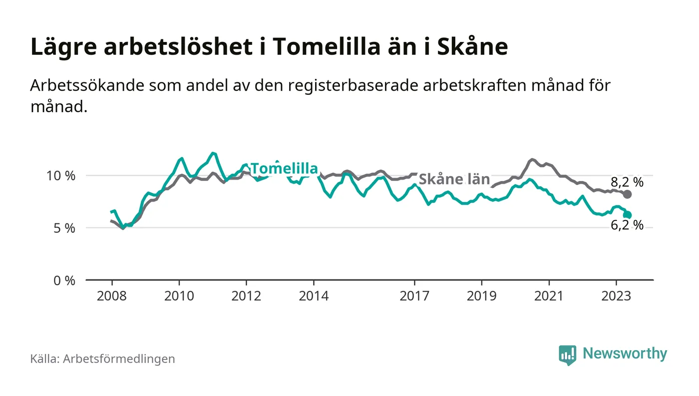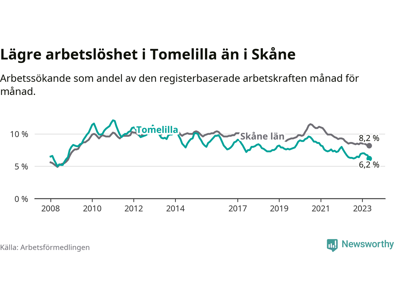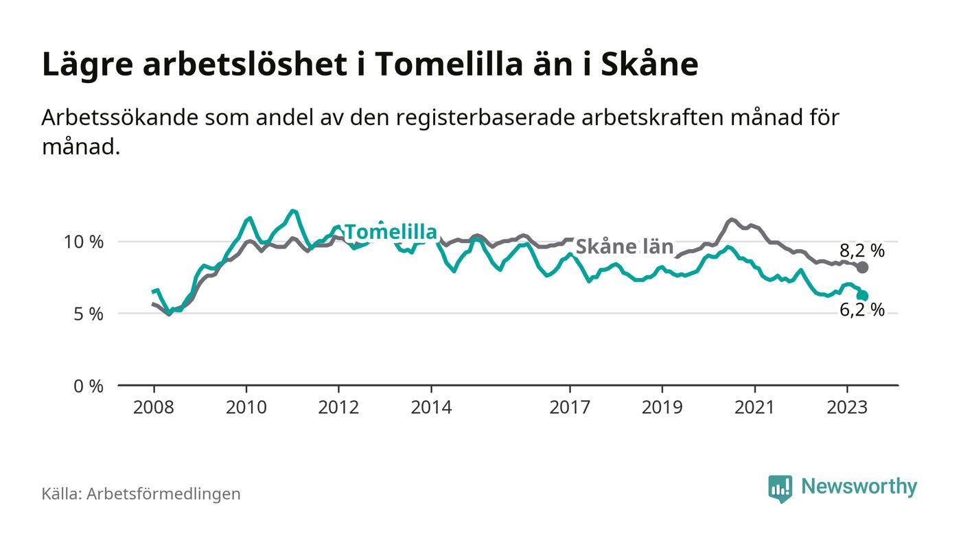 Tomelilla hade redan tidigare lägre arbetslöshet än snittet i hela Skåne län och nu växer klyftan (6,2 procent i kommunen, jämfört med 8,2 procent i hela länet). Lomma har den lägsta arbetslösheten i länet (3,1 procent), medan Perstorp har den högsta (11,8 procent). För att Tomelilla skulle komma ner i samma arbetslöshetsnivå som Lomma skulle 197 personer behöva sysselsättas.