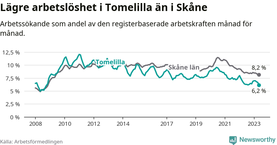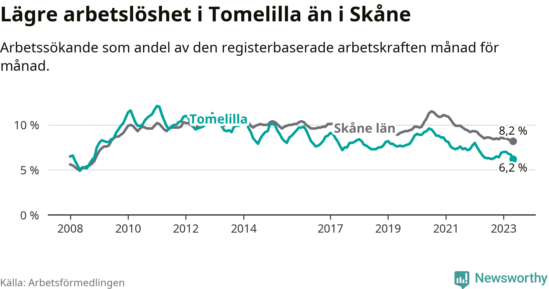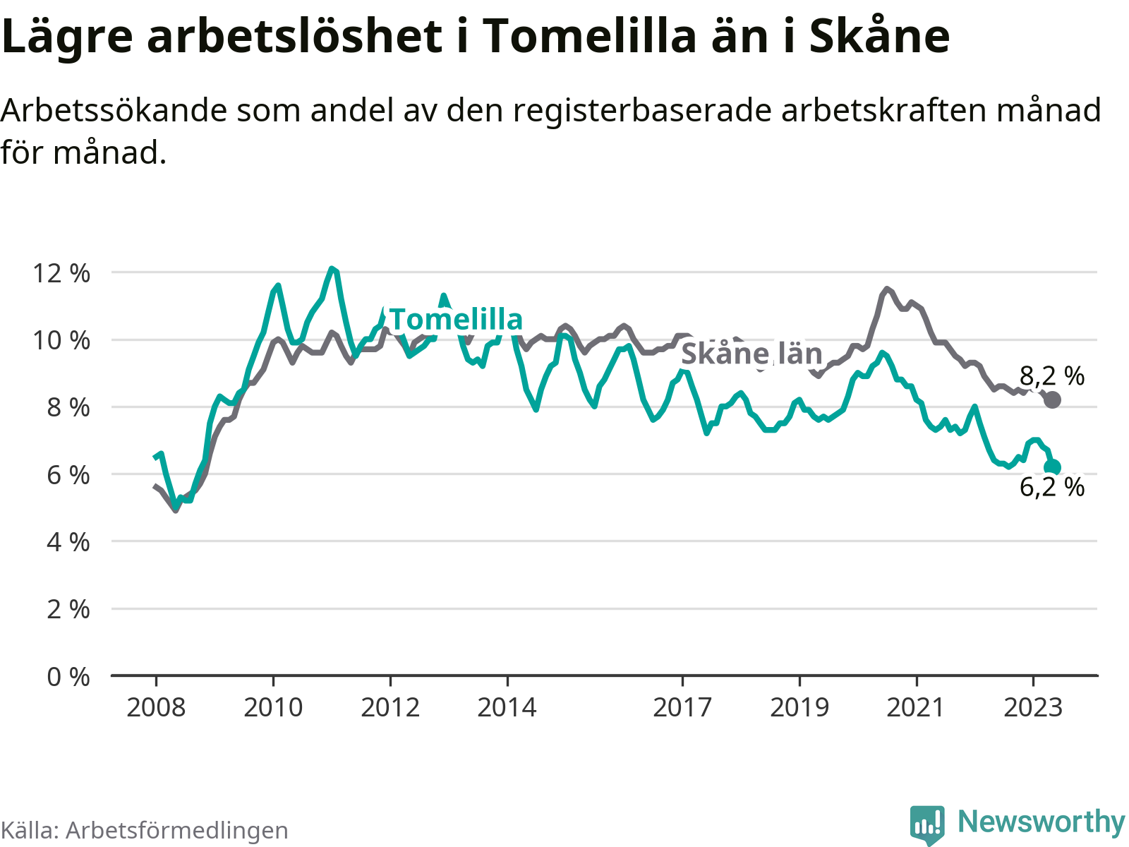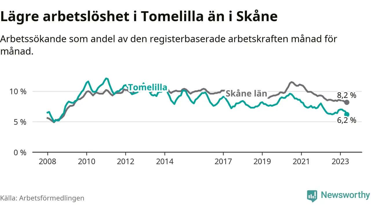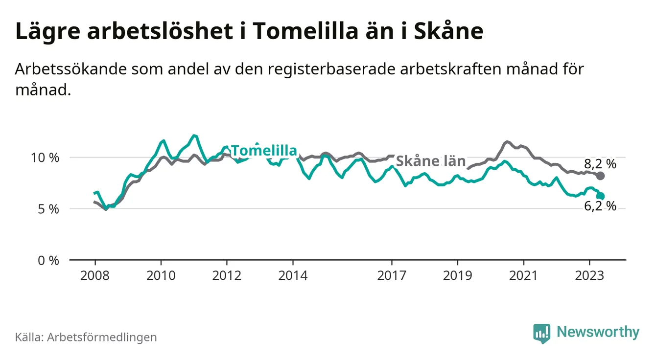 Under maj månad rapporterade Tomelilla kommun en total arbetslöshet på 6,2 procent. Det är en minskning jämfört med samma tidpunkt i fjol (−0,2 procentenheter). Även i Skåne län sjunker arbetslösheten .