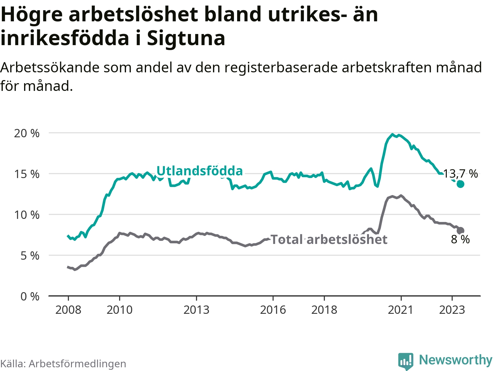 | Bland utlandsfödda | 13,7 % | −2,0 % ▼ | 11,8 % | −1,1 % ▼ | 15,1 % | −1,5 % ▼ |