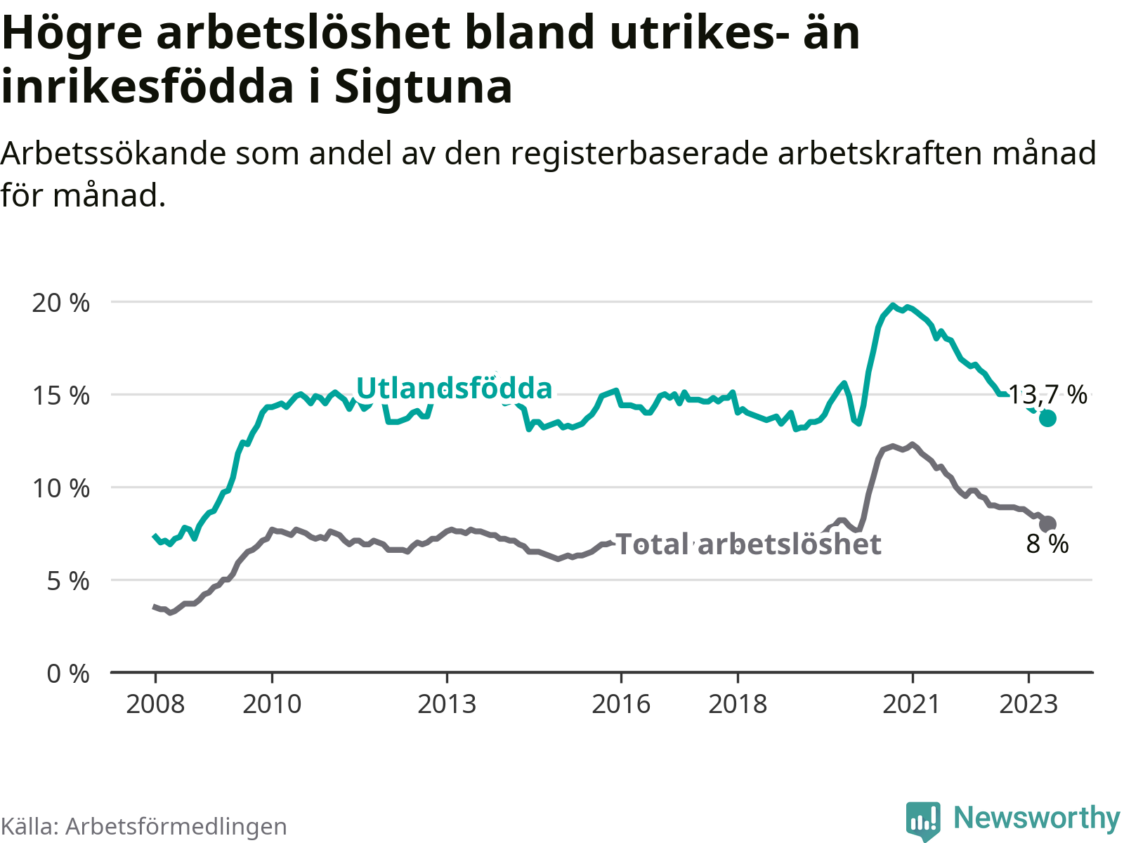 Arbetslösheten bland utlandsfödda var 13,7 procent i Sigtuna under maj månad, motsvarande 1 592 av 11 620 personer. Det är 2,0 procentenheter färre än vid samma tidpunkt i fjol (−112 om man räknar personer). Därmed är de utlandsföddas arbetslöshet lägre än vid samma tidpunkt i fjol för 24:e månaden i följd. Sedan maj 2021 har arbetslösheten bland utlandsfödda minskat från 18,7 till 13,7 procent. Den nuvarande arbetslöshetsnivån är den lägsta sedan februari 2020.