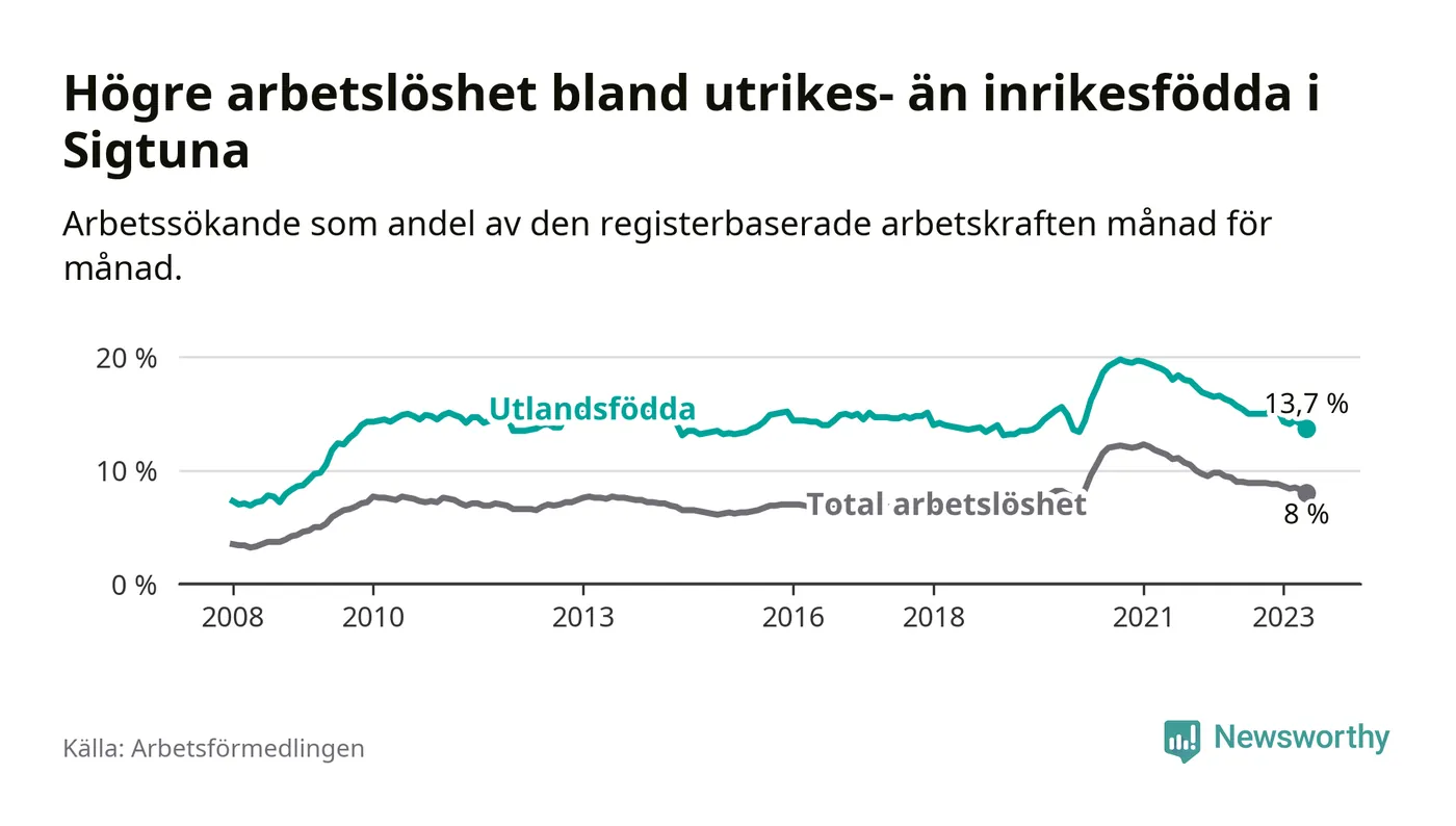 Skillnaden i arbetslöshet mellan utrikesfödda och hela befolkningen är 5,7 procentenheter i Sigtuna. Det är en mindre skillnad än för ett år sedan (−1,0 procentenheter).