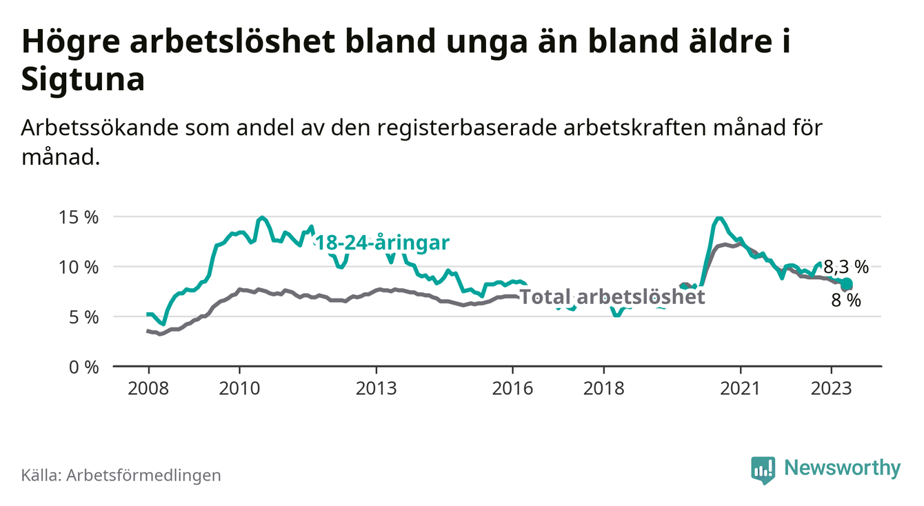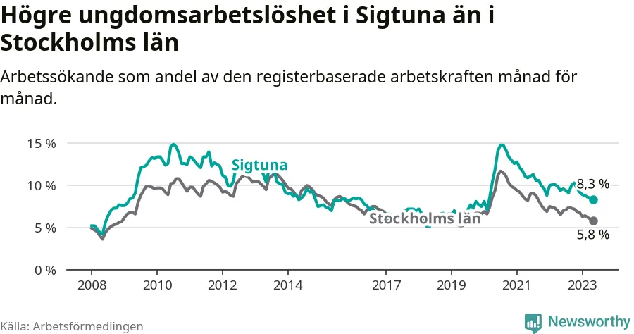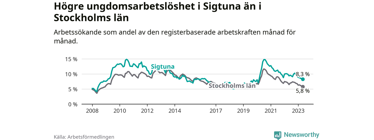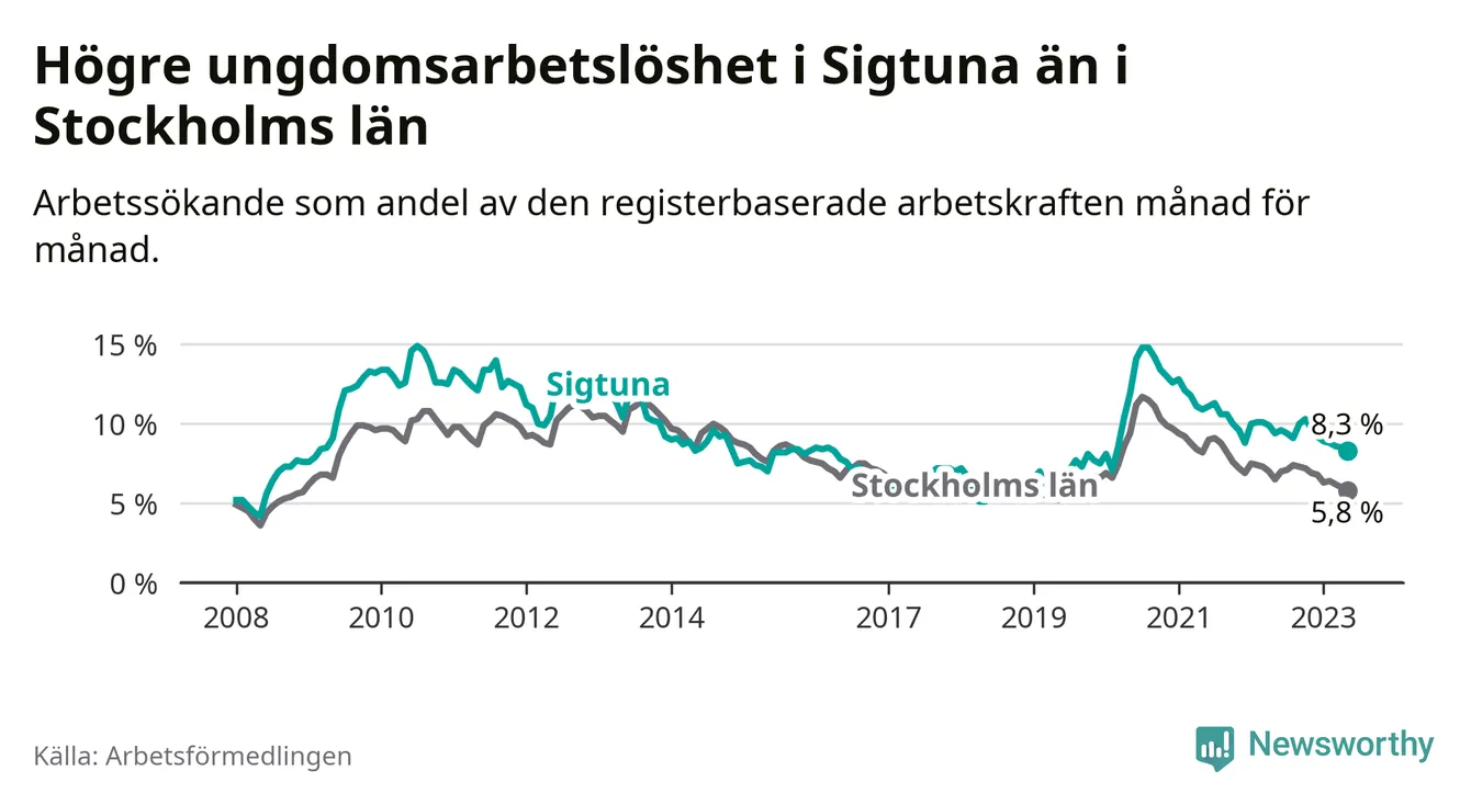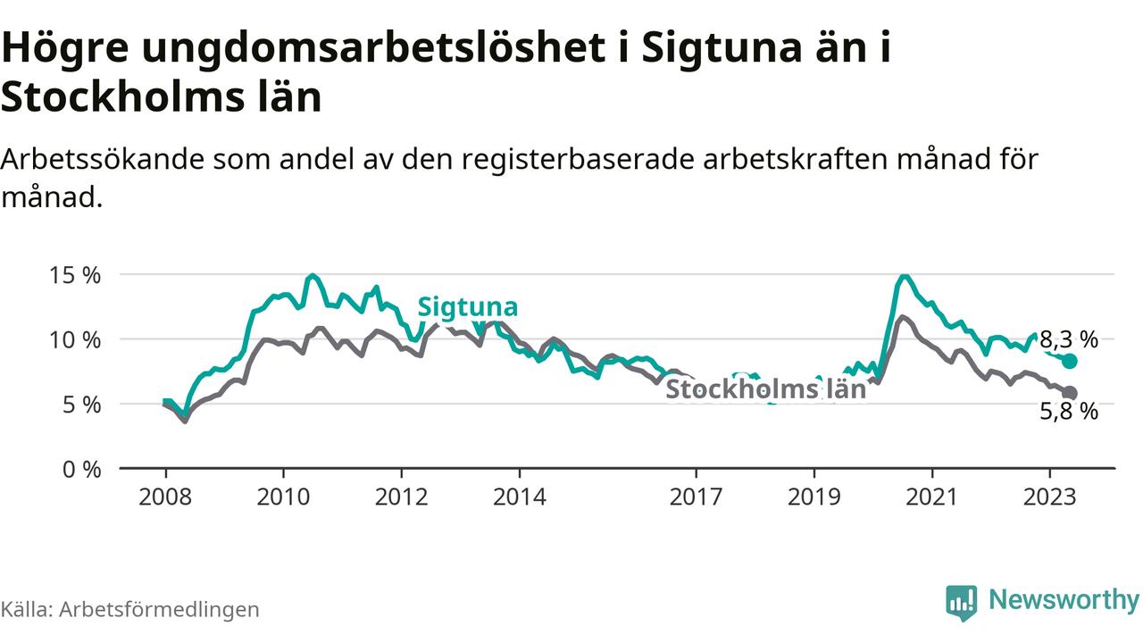 Precis som den totala arbetslösheten ligger ungdomsarbetslösheten i Sigtuna högre än i Stockholms län som helhet. Skillnaden mellan kommunen och länet är 2,5 procentenheter.