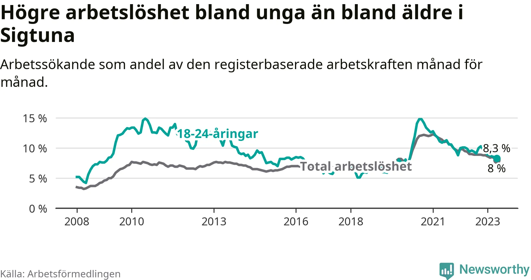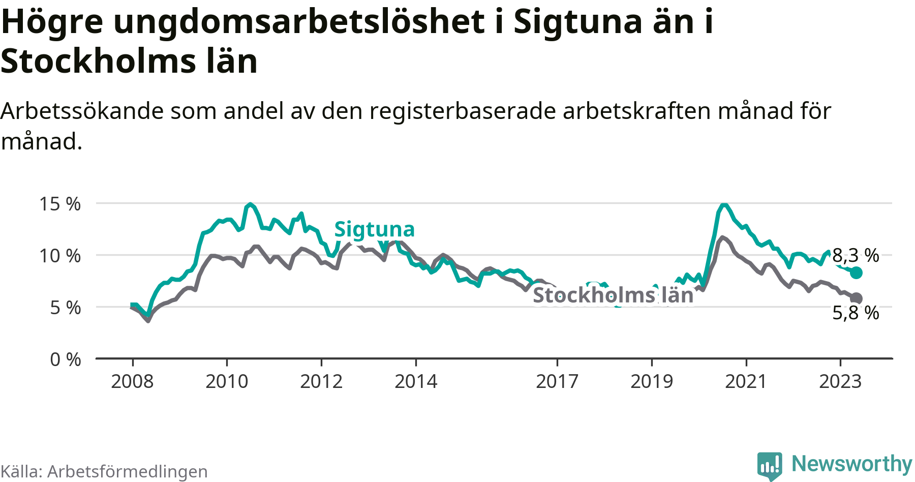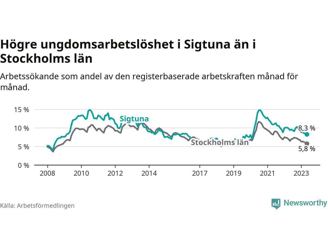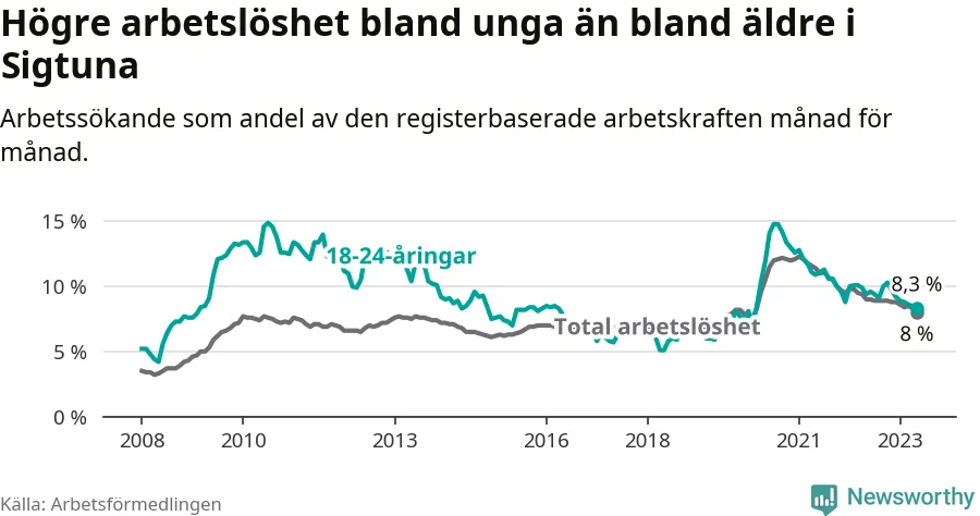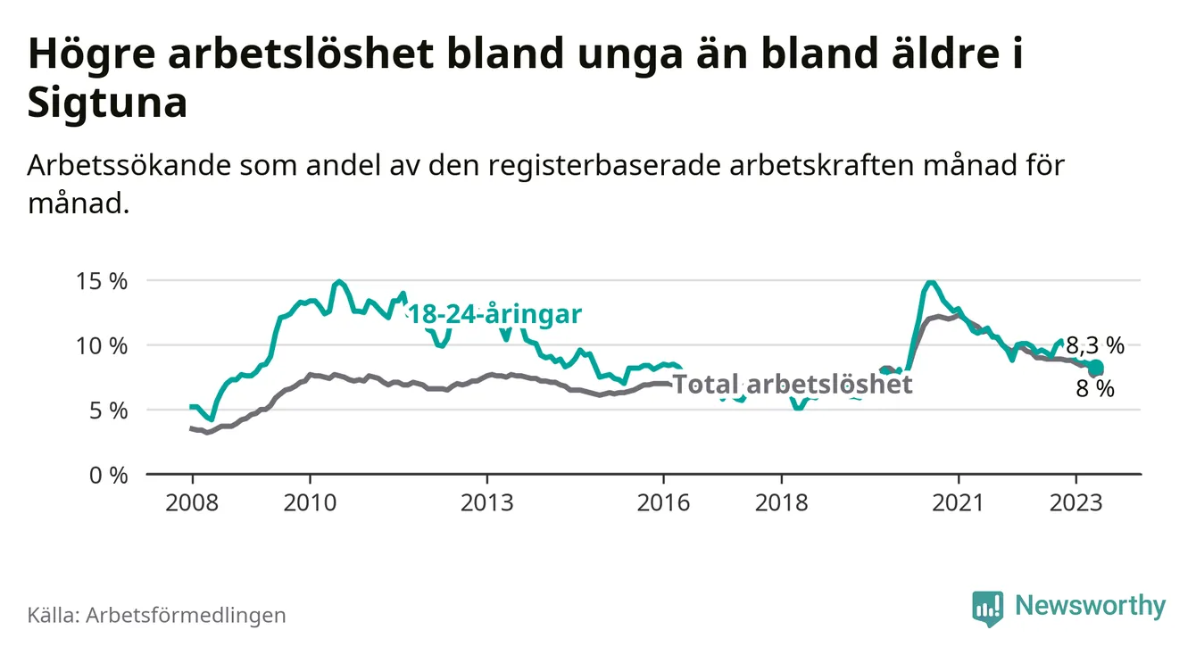 Precis som den totala arbetslösheten ligger ungdomsarbetslösheten i Sigtuna högre än i Stockholms län som helhet. Skillnaden mellan kommunen och länet är 2,5 procentenheter.