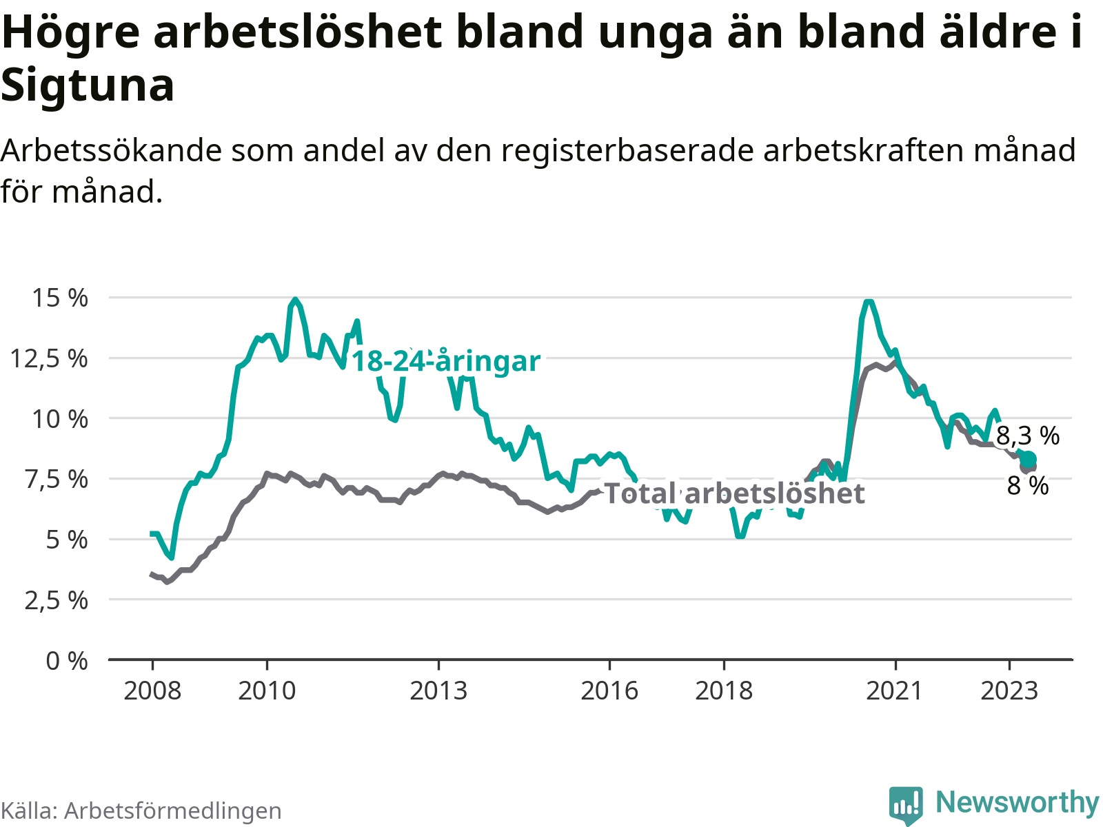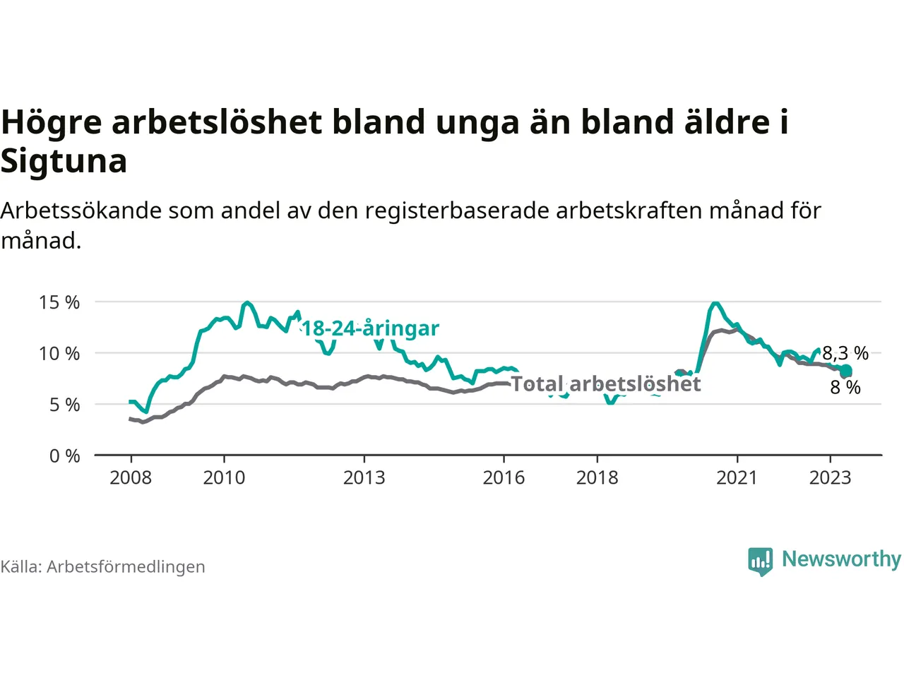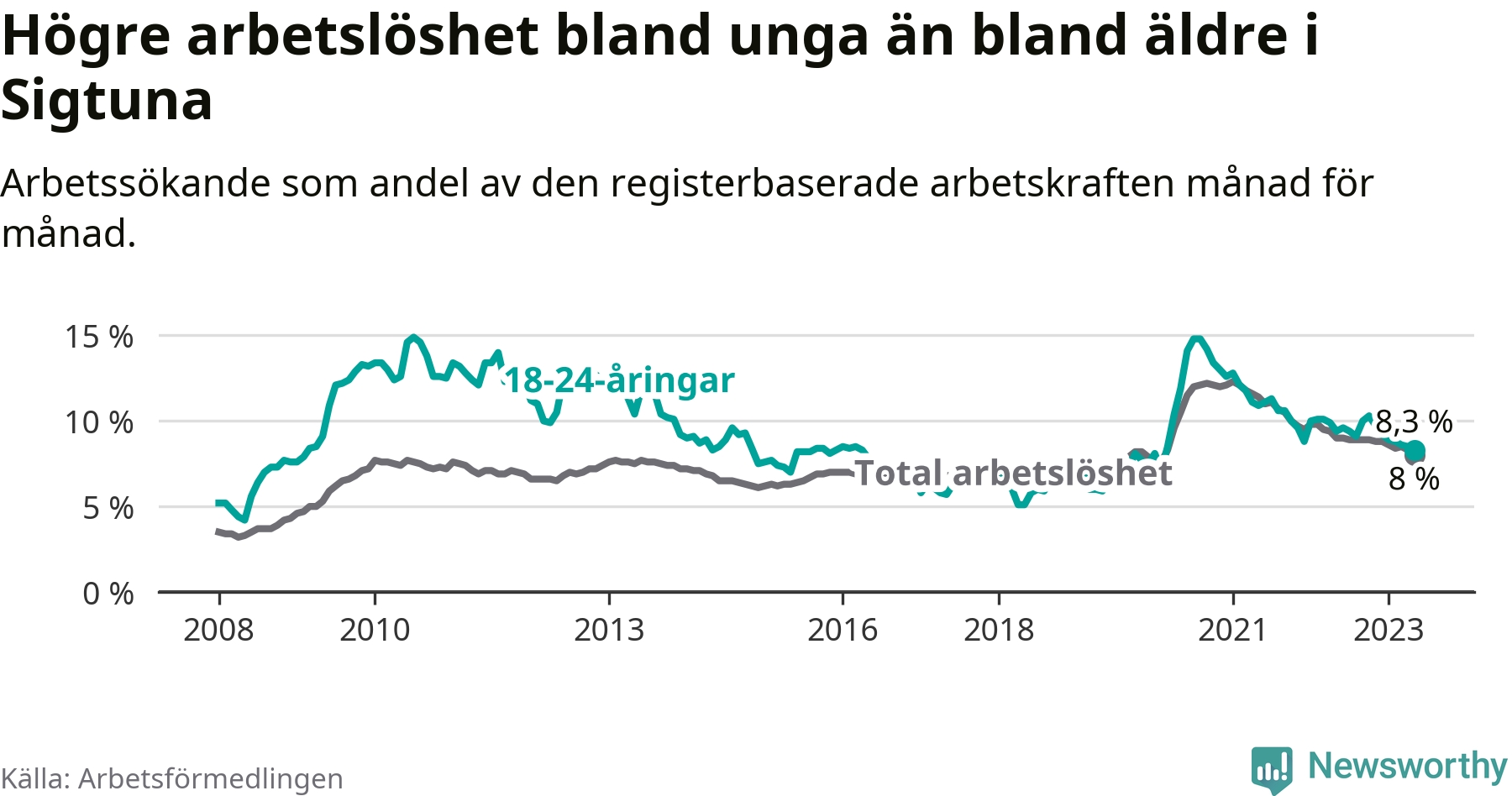 Precis som den totala arbetslösheten ligger ungdomsarbetslösheten i Sigtuna högre än i Stockholms län som helhet. Skillnaden mellan kommunen och länet är 2,5 procentenheter.