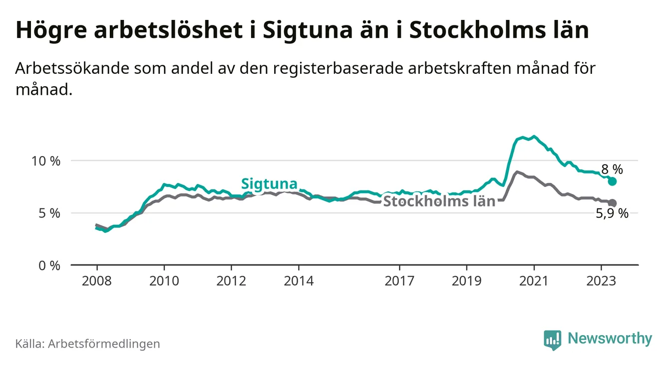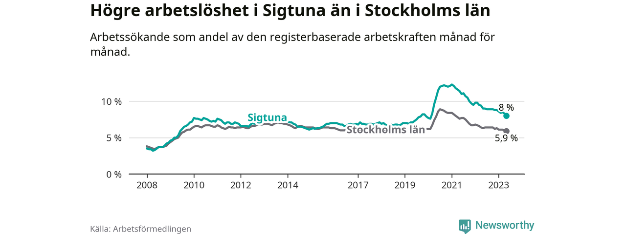 Även om arbetslösheten i Sigtuna alltså minskar, så ligger den fortfarande över snittet i hela Stockholms län (8,0 procent i kommunen, jämfört med 5,9 procent i hela länet). Vaxholm har den lägsta arbetslösheten i länet (2,9 procent), medan Botkyrka och Södertälje har den högsta (10,3 procent). För att Sigtuna skulle komma ner i samma arbetslöshetsnivå som Vaxholm skulle 1 306 personer behöva sysselsättas.