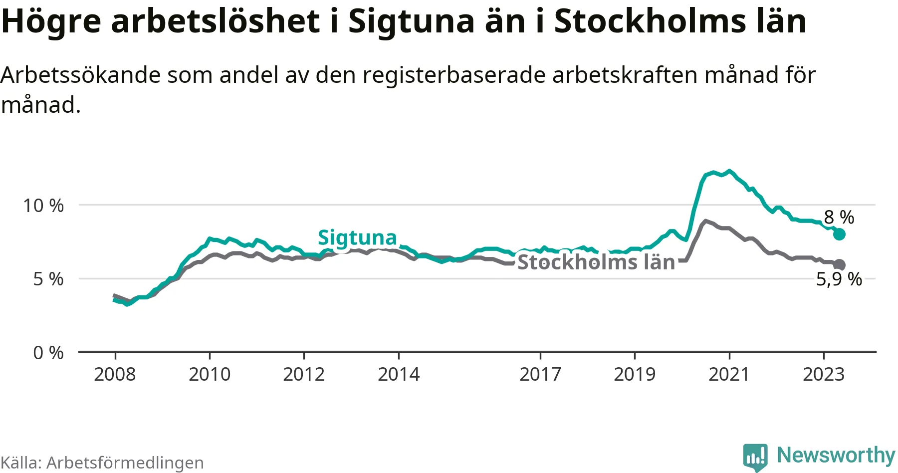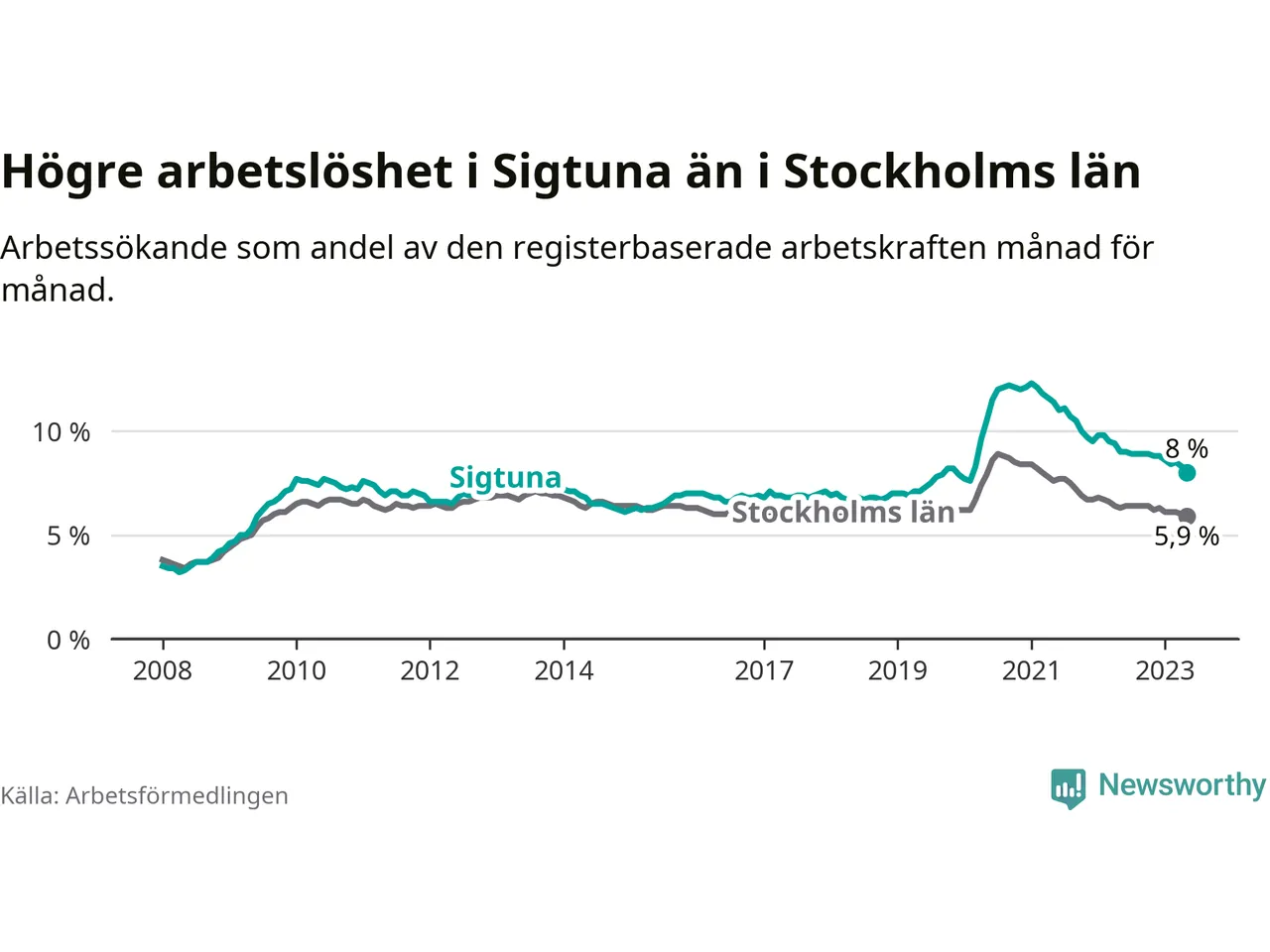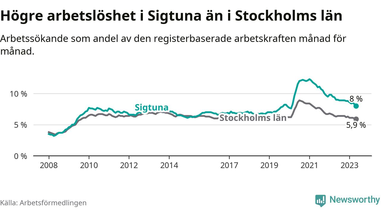 Under maj månad rapporterade Sigtuna kommun en total arbetslöshet på 8,0 procent. Det är en minskning jämfört med samma tidpunkt i fjol (−1,0 procentenheter). Även i Stockholms län sjunker arbetslösheten .