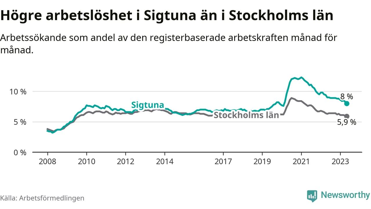 Det är 24:e månaden i följd som arbetslösheten i Sigtuna är lägre än den var under samma tidpunkt året innan. Sedan maj 2021 har arbetslösheten gått ner från 11,4 till 8,0 procent. Den nuvarande arbetslöshetsnivån är därmed den lägsta sedan februari 2020.