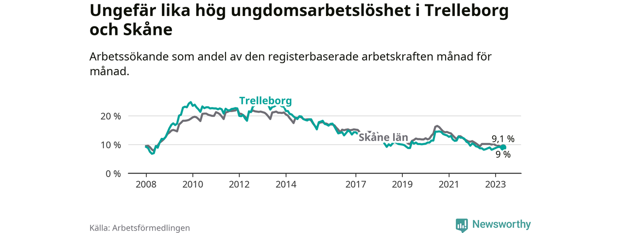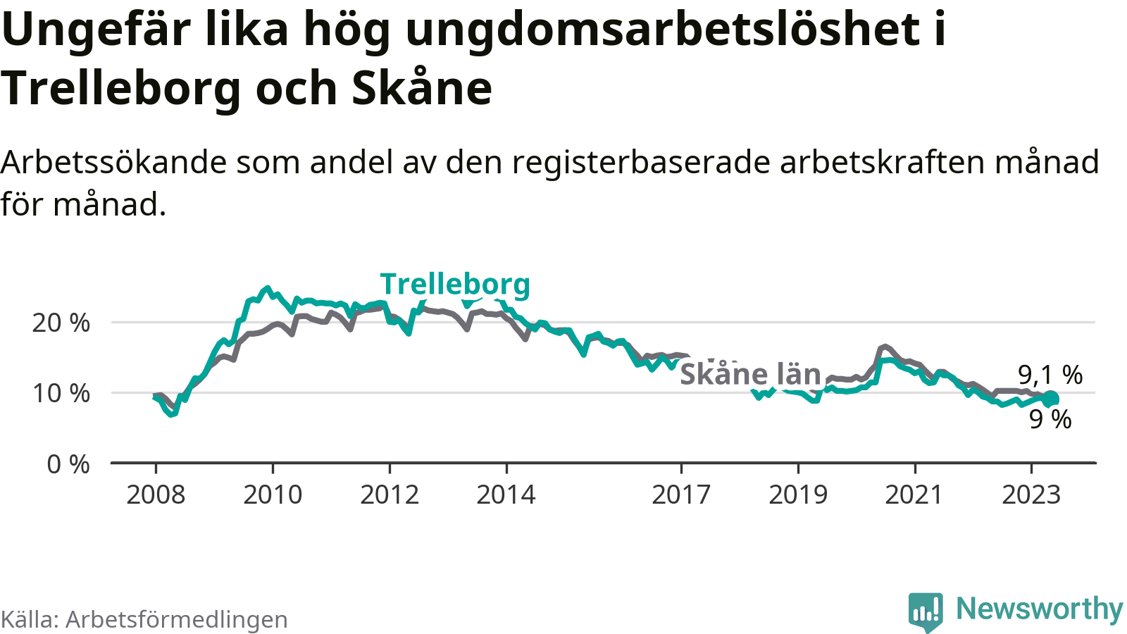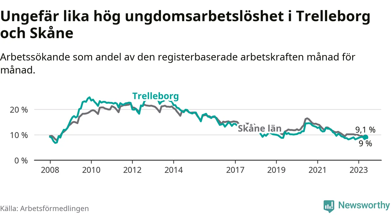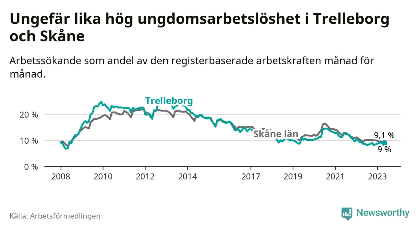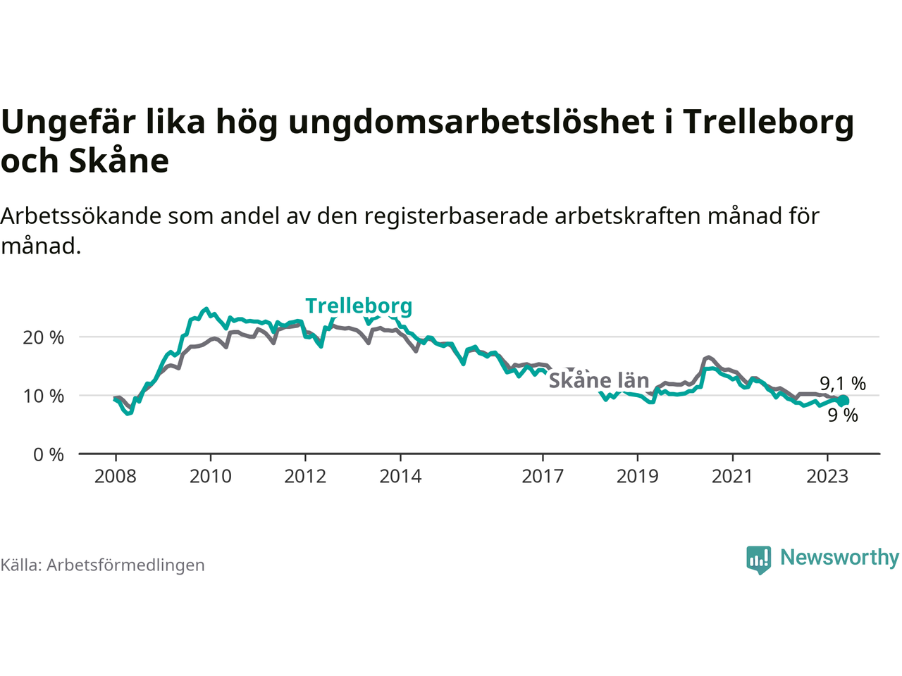 Medan Trelleborg har lägre total arbetslöshet än Skåne, ligger ungdomsarbetslösheten på i stort sett samma nivå.