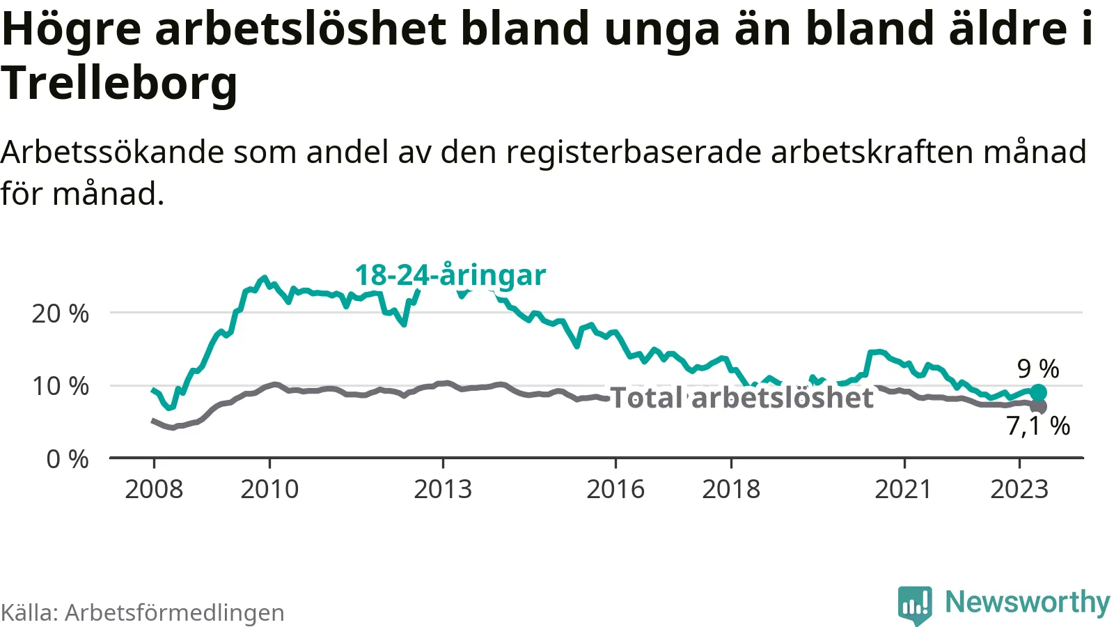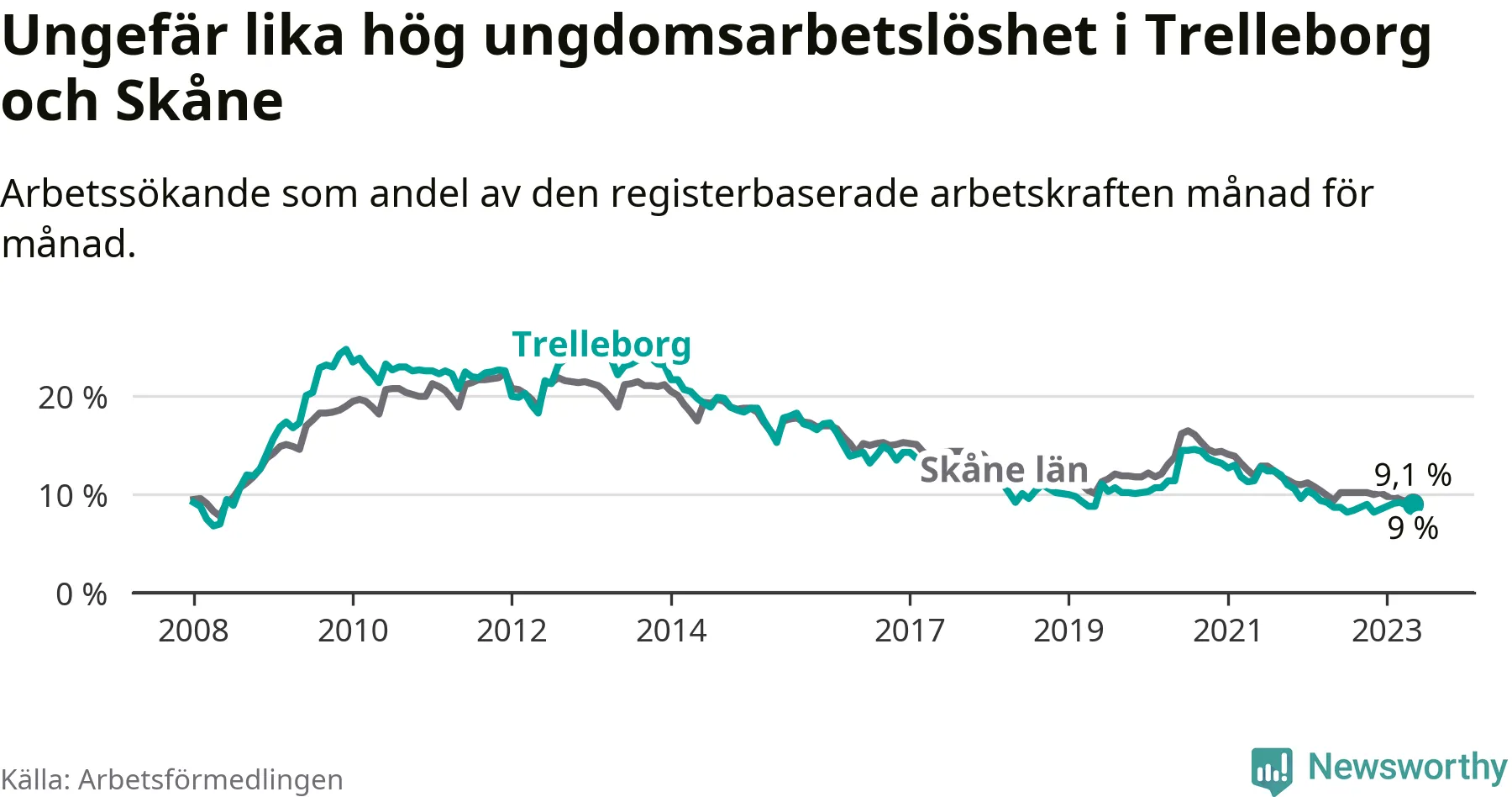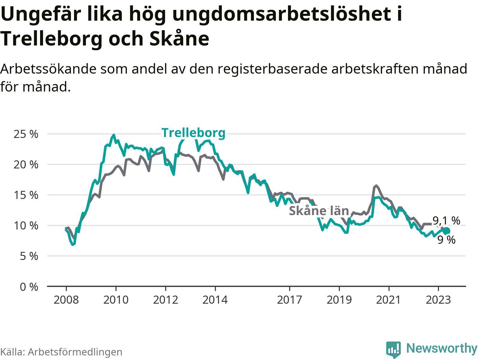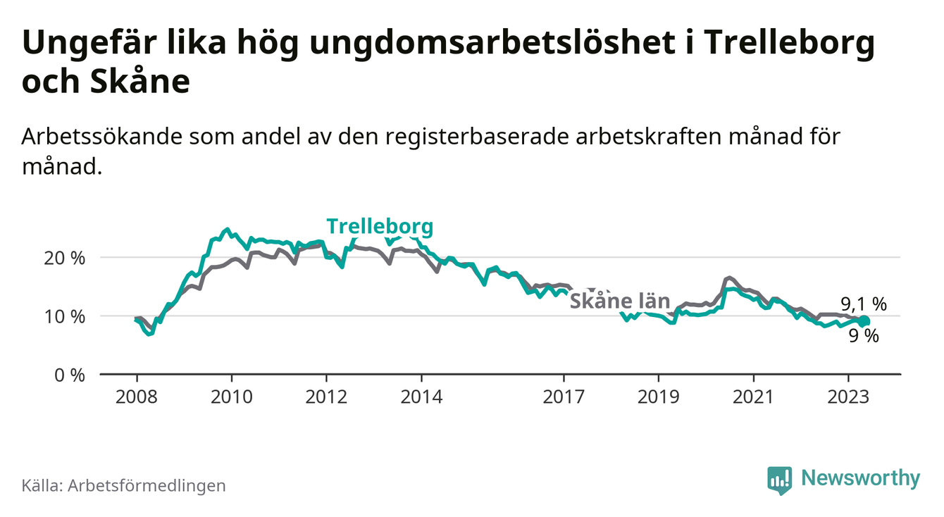Medan Trelleborg har lägre total arbetslöshet än Skåne, ligger ungdomsarbetslösheten på i stort sett samma nivå.