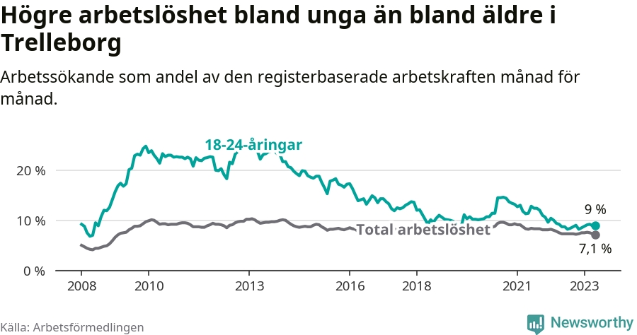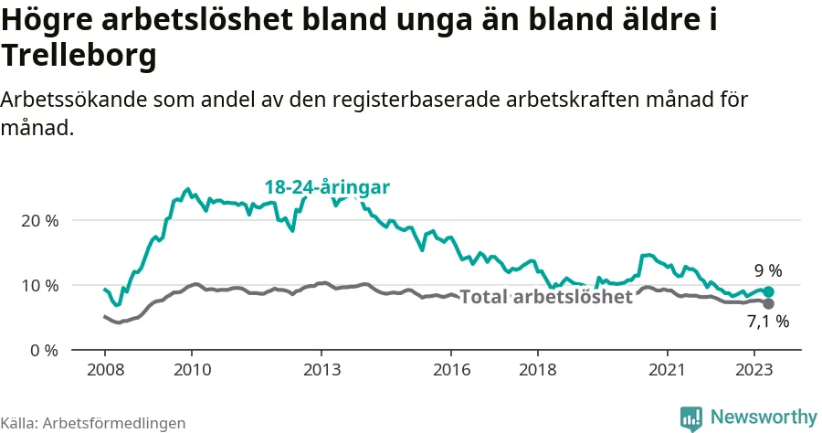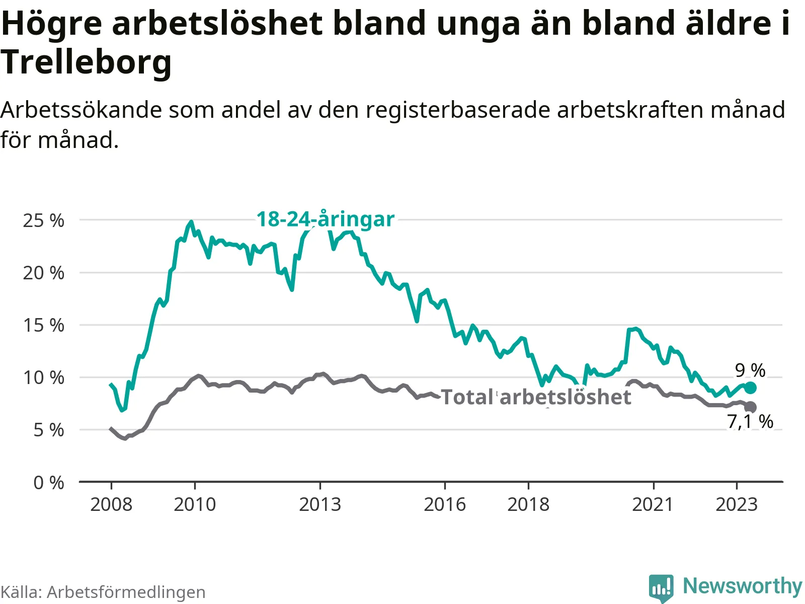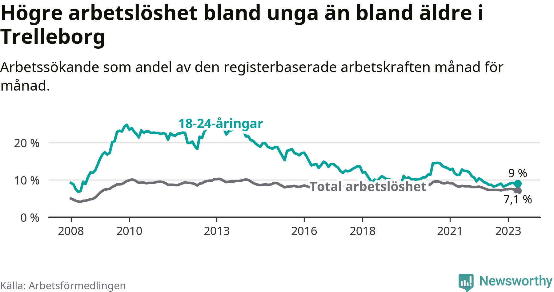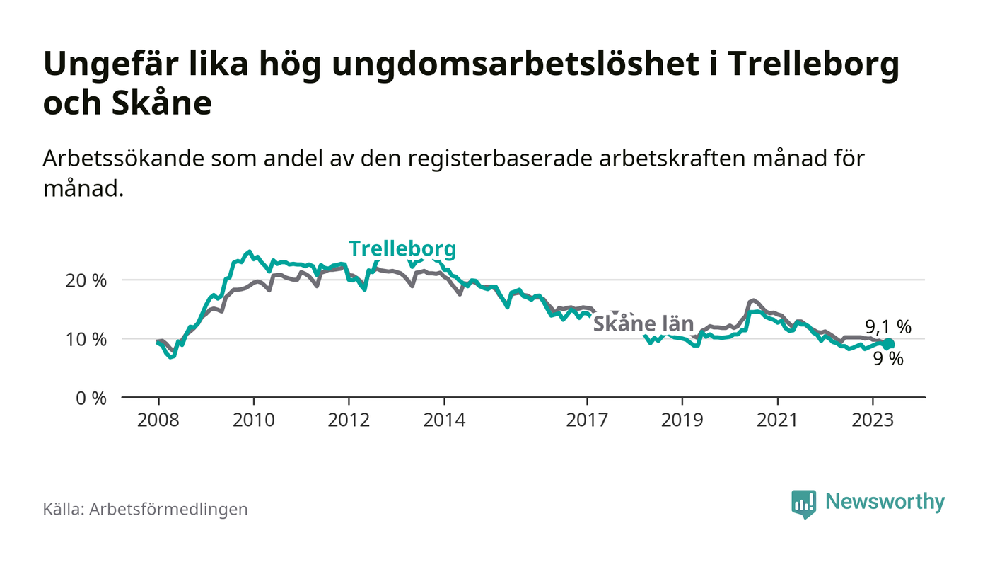 Medan Trelleborg har lägre total arbetslöshet än Skåne, ligger ungdomsarbetslösheten på i stort sett samma nivå.