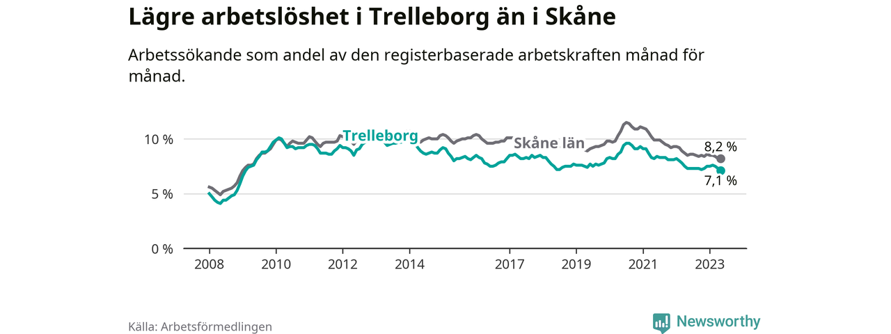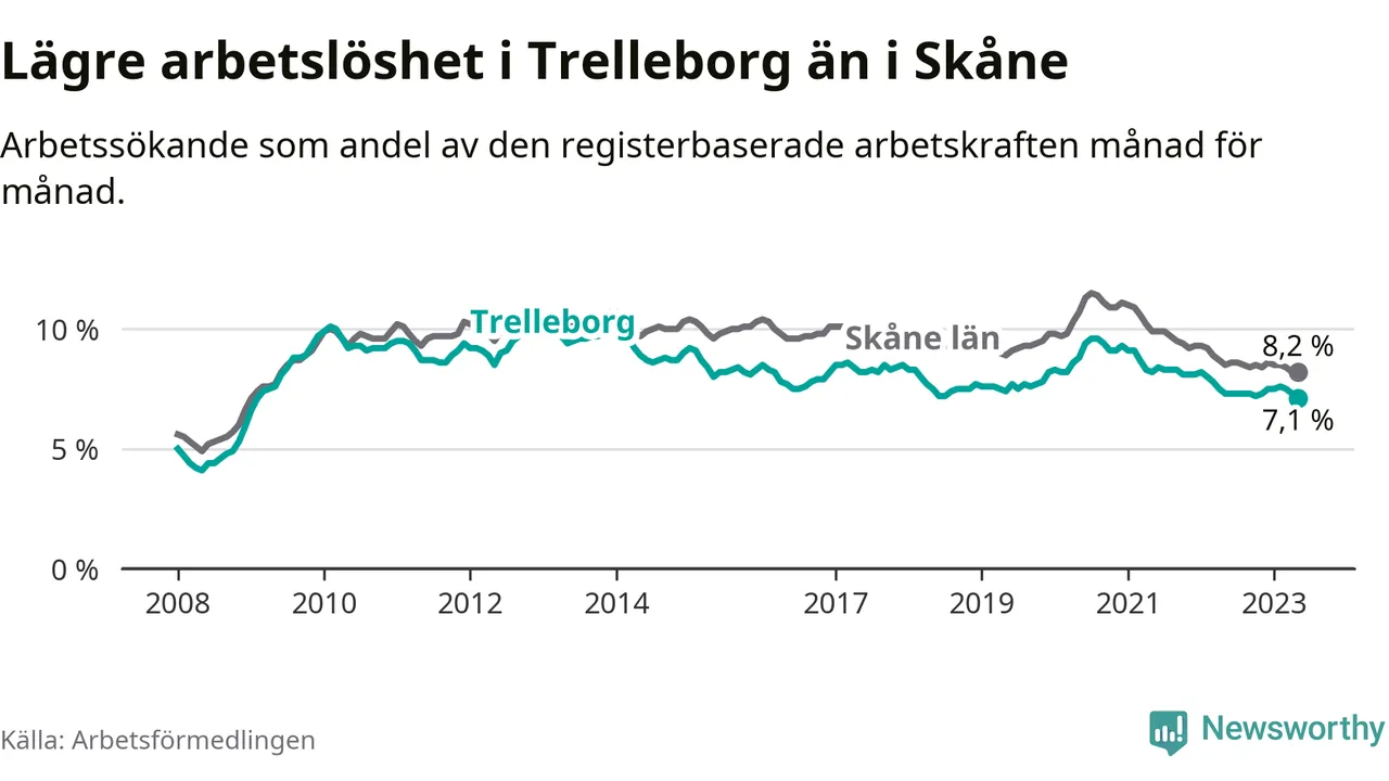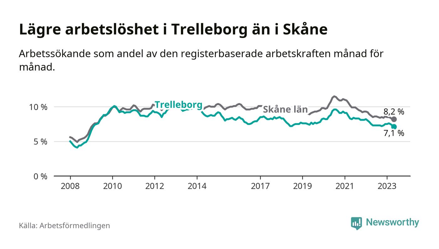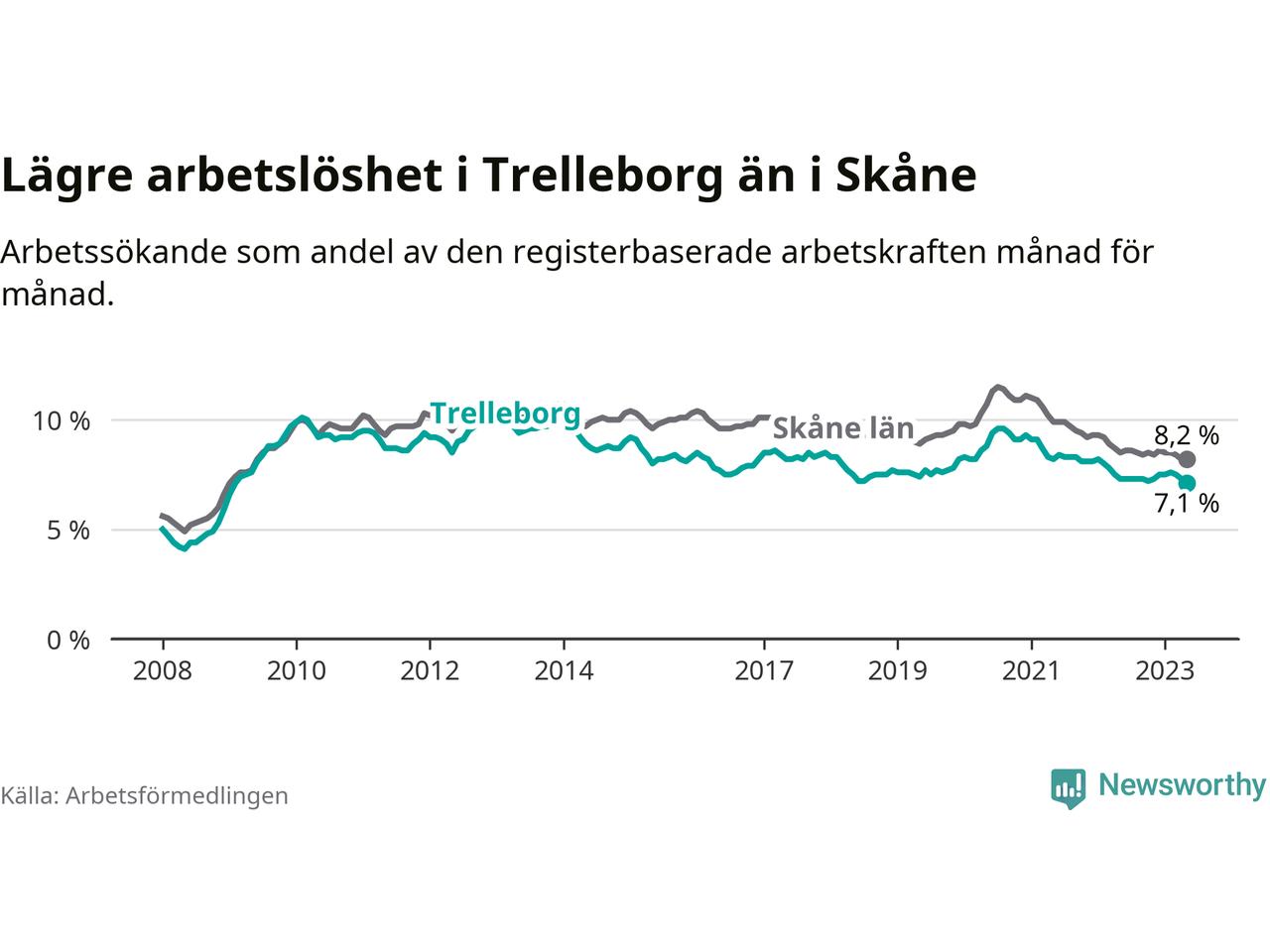Det är 26:e månaden i följd som arbetslösheten i Trelleborg är lägre än den var under samma tidpunkt året innan. Sedan mars 2021 har arbetslösheten gått ner från 8,7 till 7,1 procent. Den nuvarande arbetslöshetsnivån är därmed den lägsta sedan februari 2009.