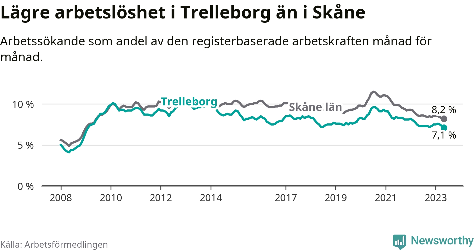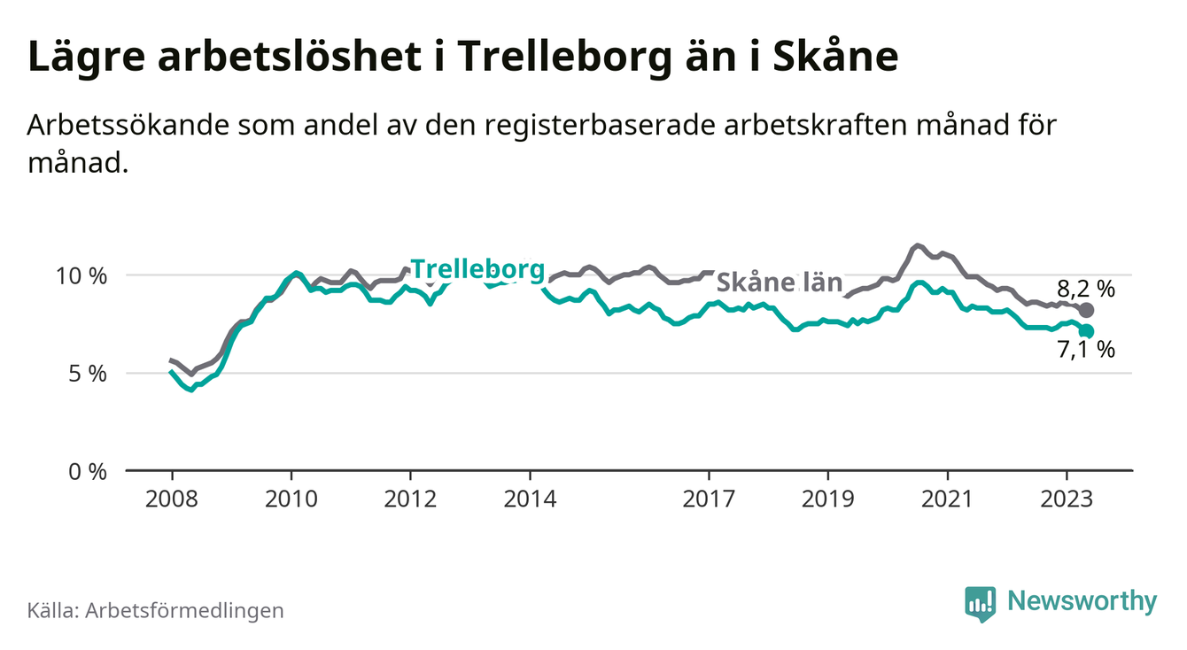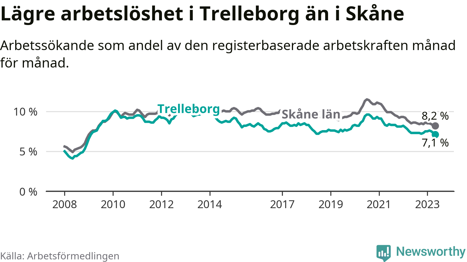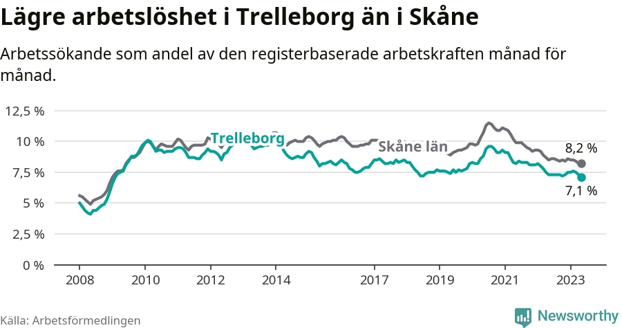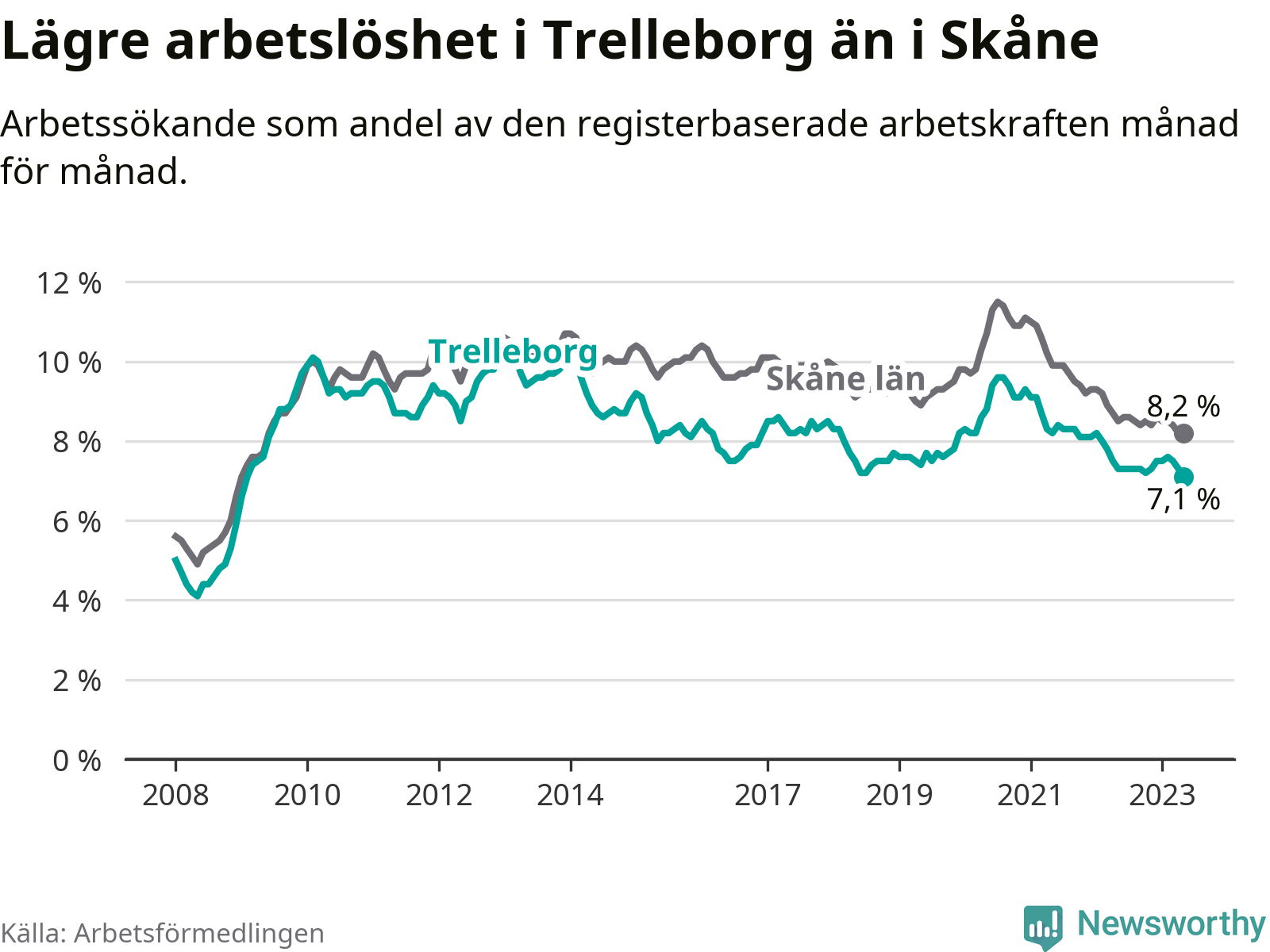 Det är 26:e månaden i följd som arbetslösheten i Trelleborg är lägre än den var under samma tidpunkt året innan. Sedan mars 2021 har arbetslösheten gått ner från 8,7 till 7,1 procent. Den nuvarande arbetslöshetsnivån är därmed den lägsta sedan februari 2009.