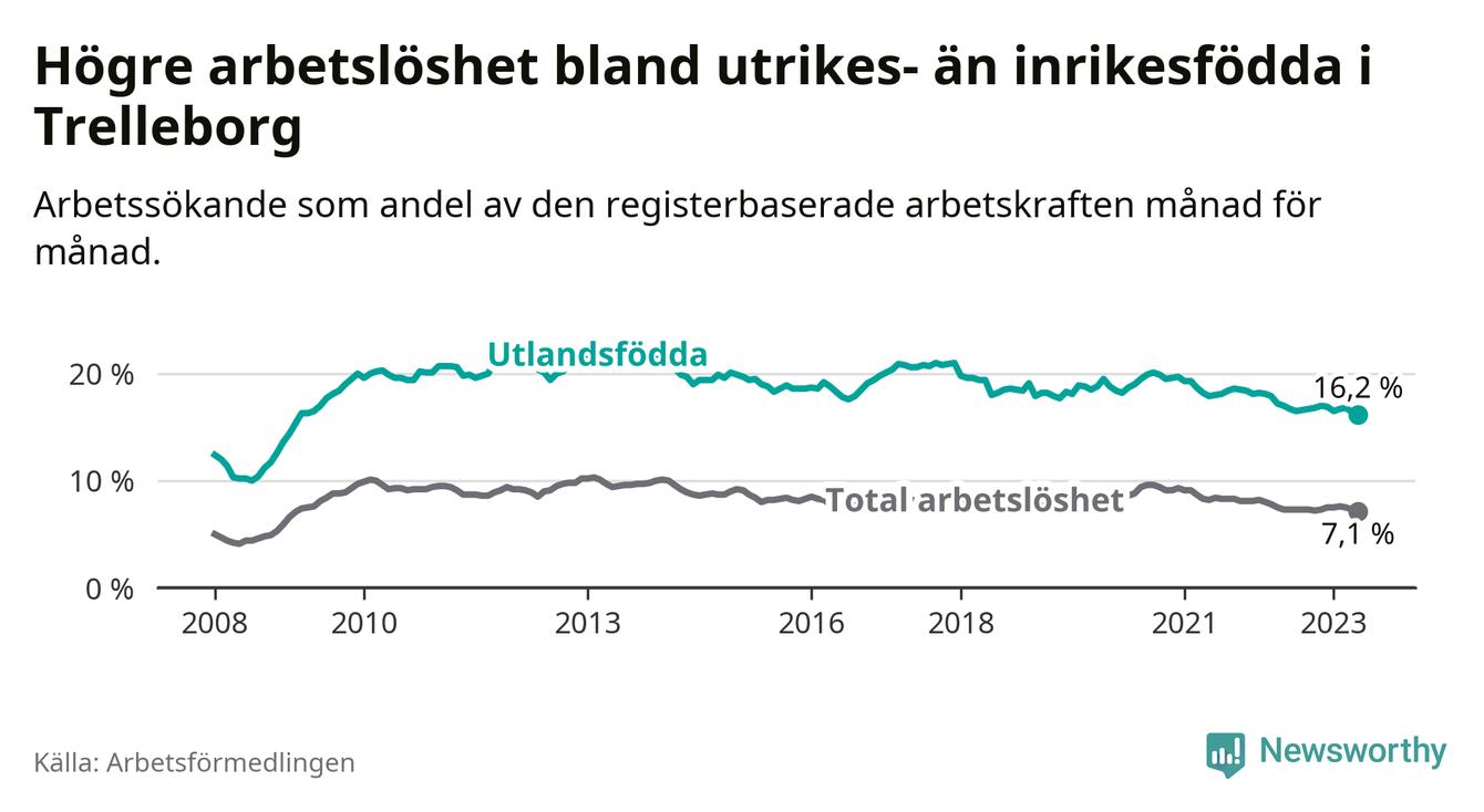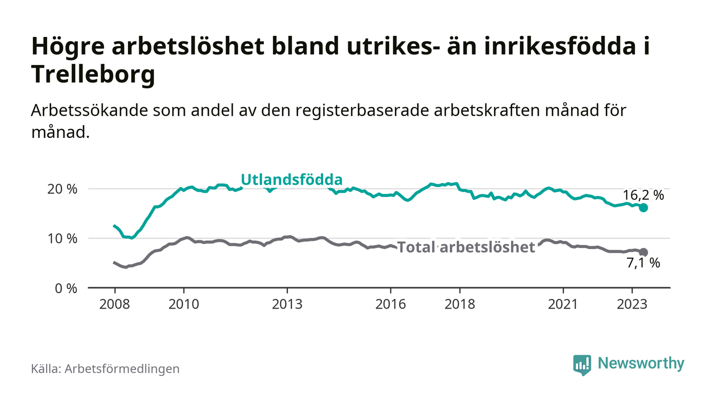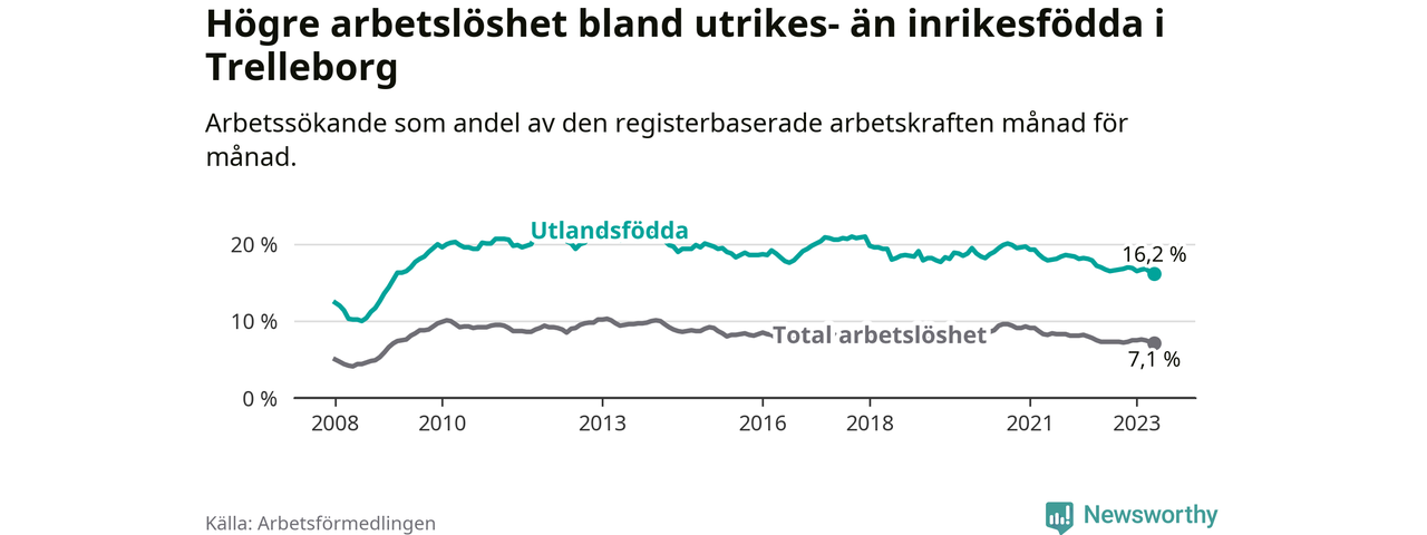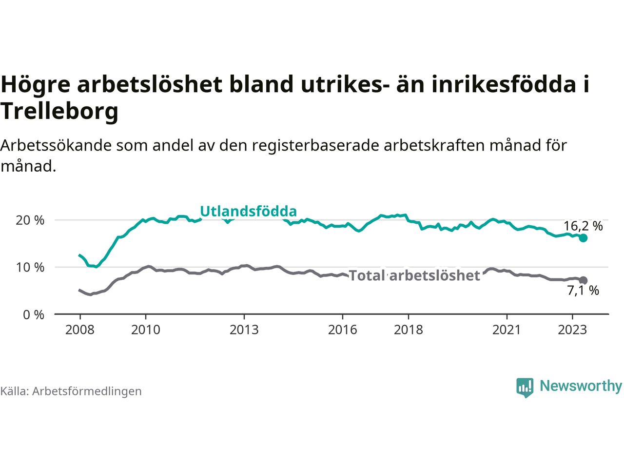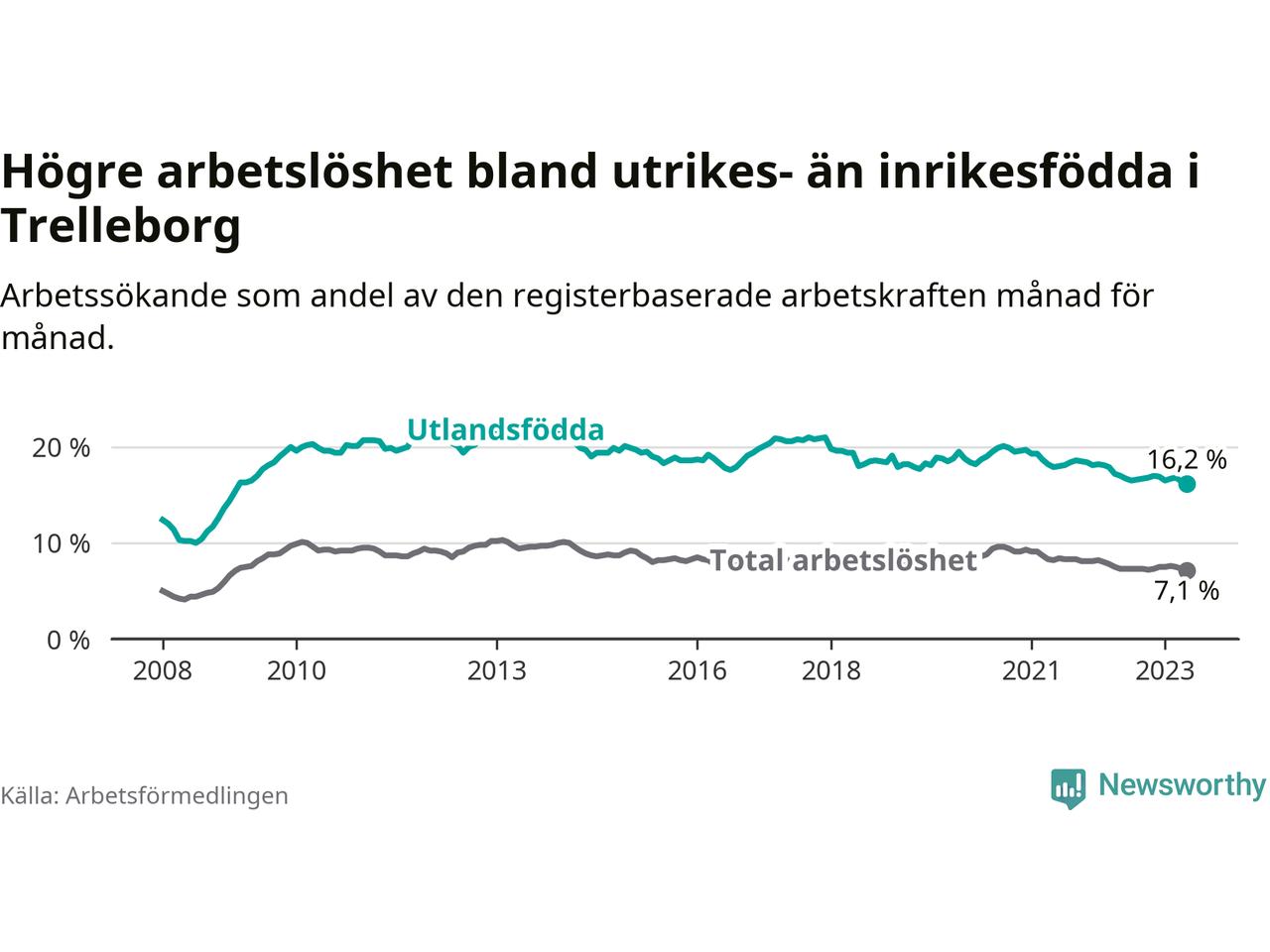 Arbetslösheten bland utlandsfödda var 16,2 procent i Trelleborg under maj månad, motsvarande 761 av 4 698 personer. Det är 0,8 procentenheter färre än vid samma tidpunkt i fjol (+2 om man räknar personer). Därmed har de utlandsföddas arbetslöshet varit lägre än vid samma tidpunkt i fjol i över två år i sträck. Sedan mars 2021 har arbetslösheten bland utlandsfödda minskat från 18,7 till 16,2 procent. Den nuvarande arbetslöshetsnivån är den lägsta sedan februari 2009.