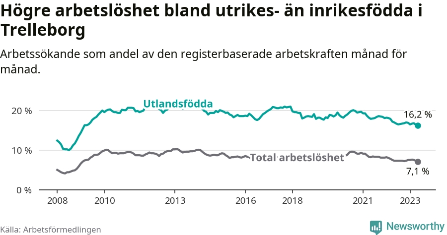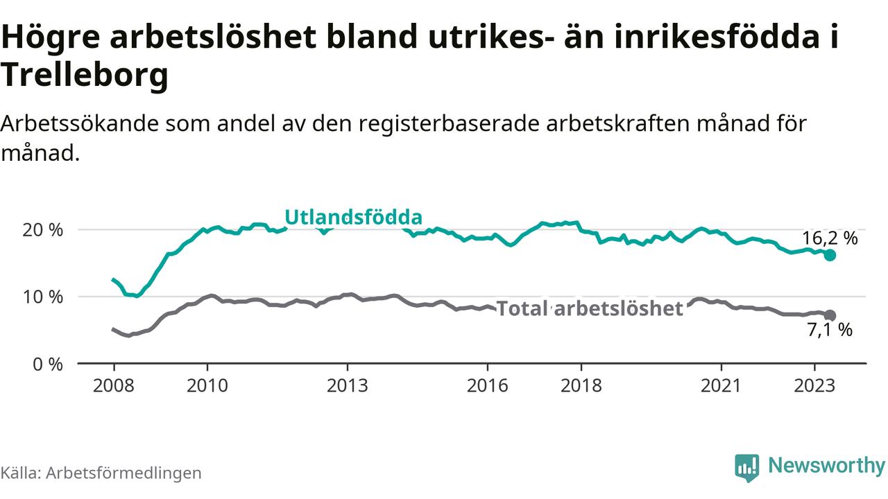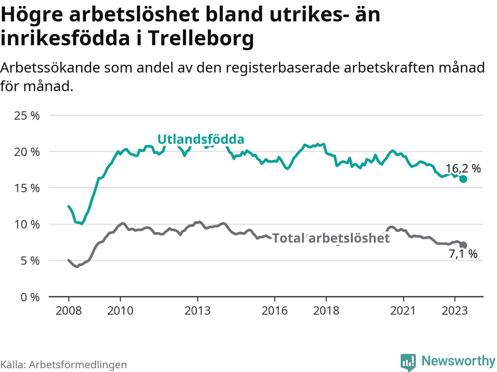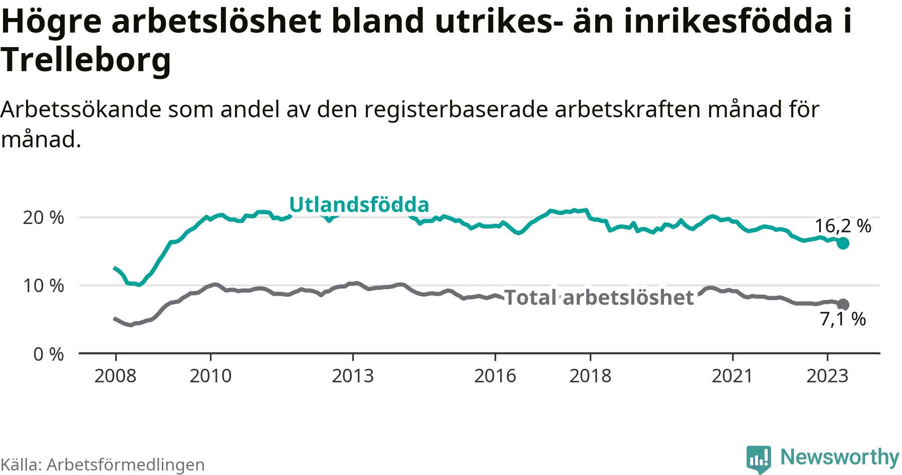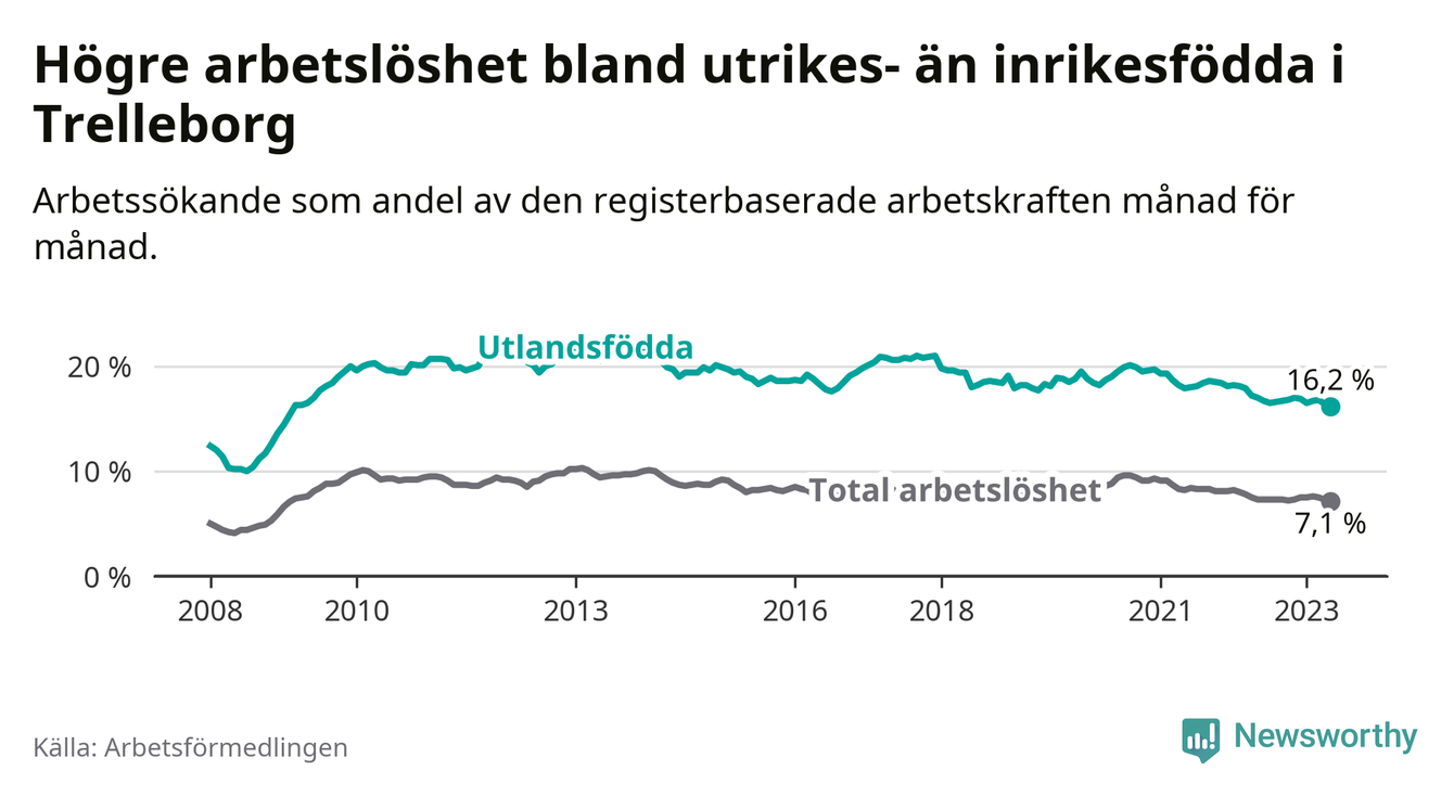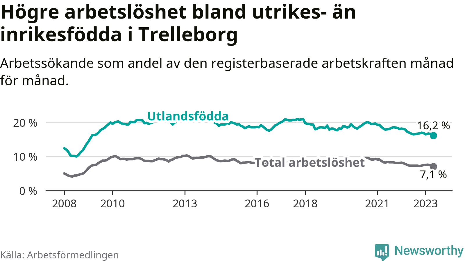 Arbetslösheten bland utlandsfödda var 16,2 procent i Trelleborg under maj månad, motsvarande 761 av 4 698 personer. Det är 0,8 procentenheter färre än vid samma tidpunkt i fjol (+2 om man räknar personer). Därmed har de utlandsföddas arbetslöshet varit lägre än vid samma tidpunkt i fjol i över två år i sträck. Sedan mars 2021 har arbetslösheten bland utlandsfödda minskat från 18,7 till 16,2 procent. Den nuvarande arbetslöshetsnivån är den lägsta sedan februari 2009.