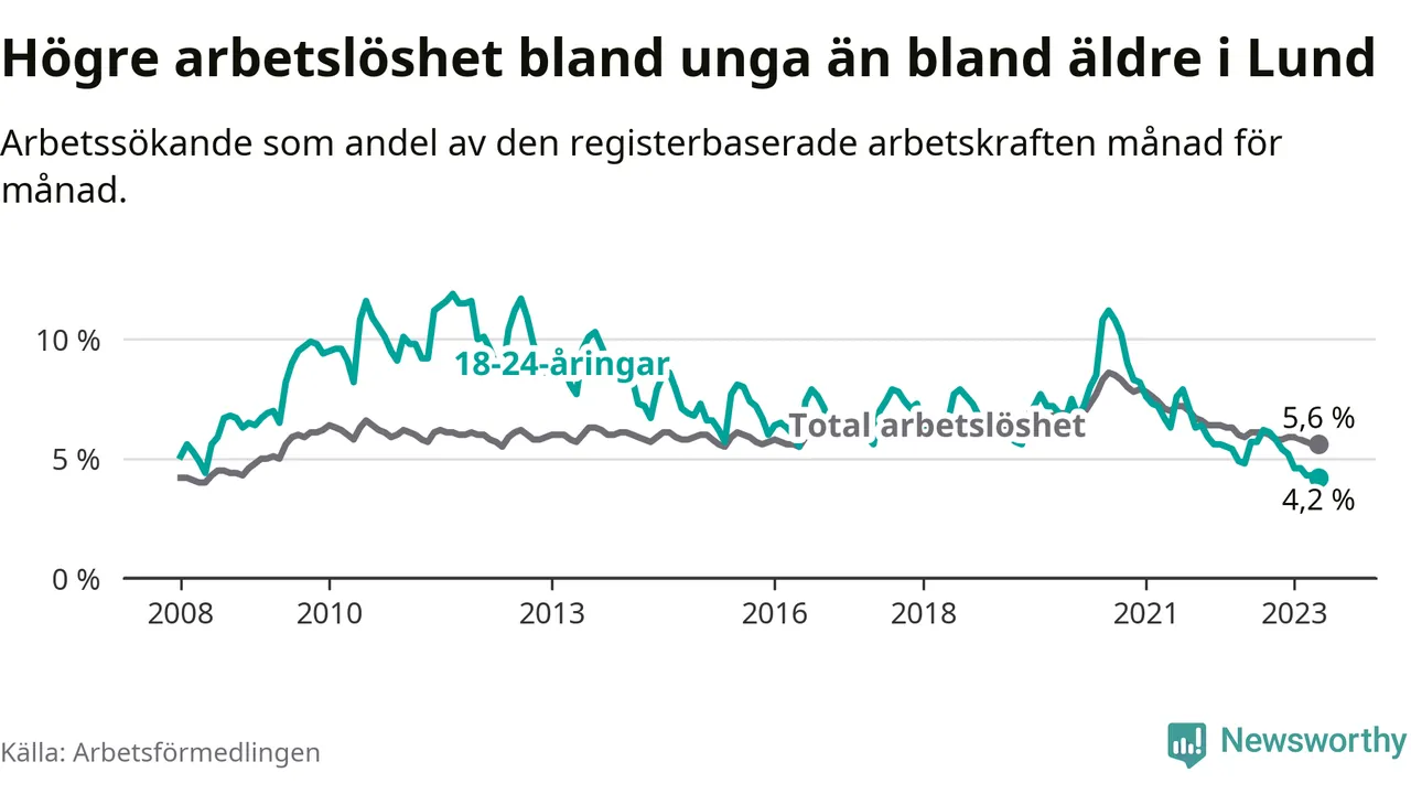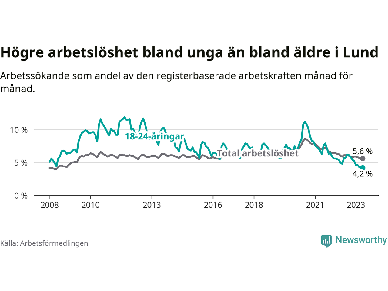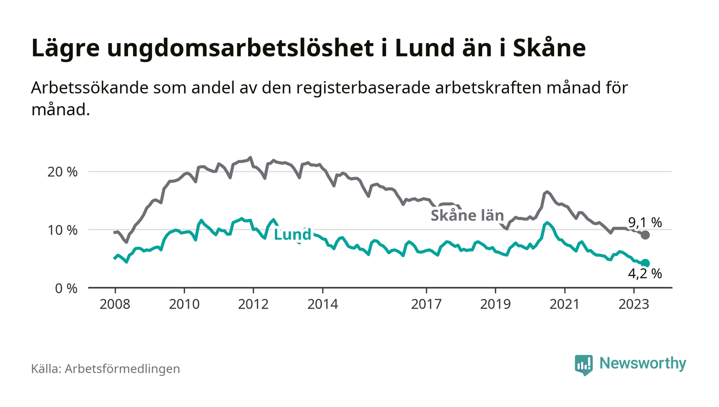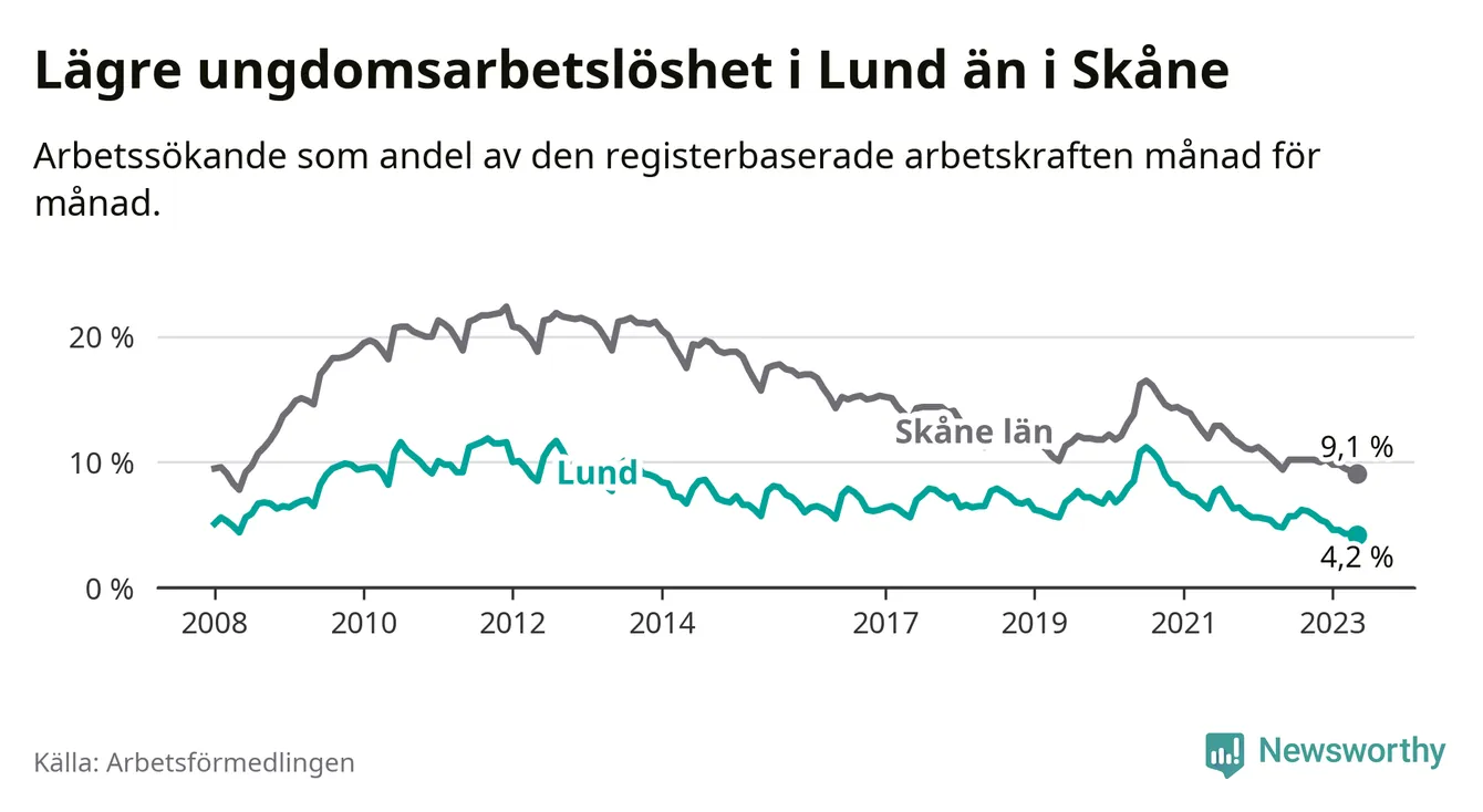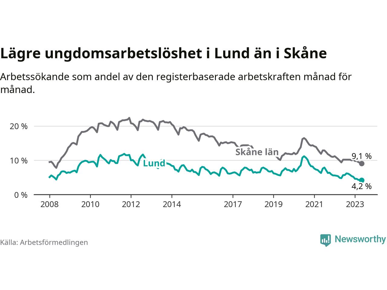 I och med den senaste månadens nedgång har de ungas arbetslöshet i Lund sjunkit över två år i sträck (ner från 7,2 procent i mars 2021 till 4,2 procent nu). Den nuvarande arbetslöshetsnivån är den lägsta sedan januari 2008.